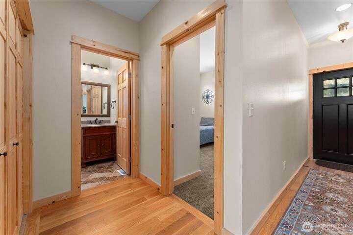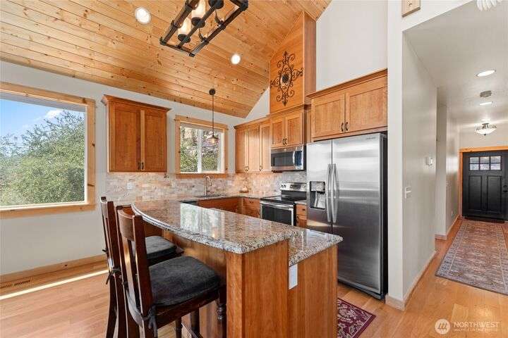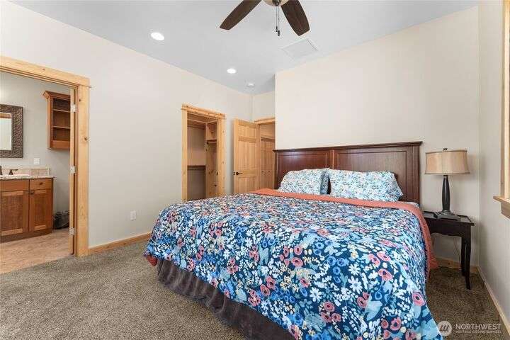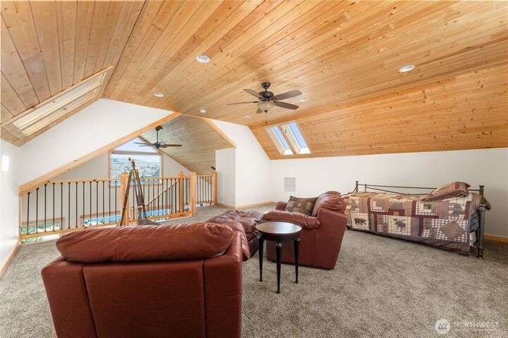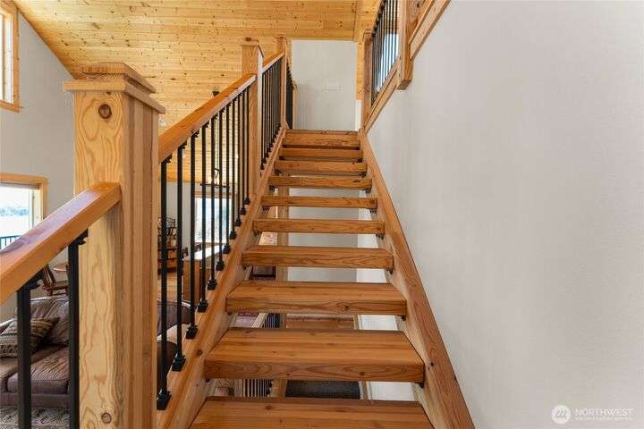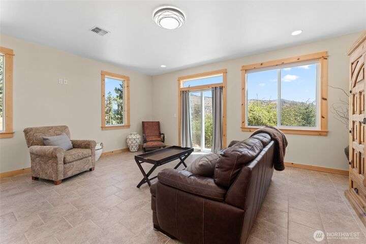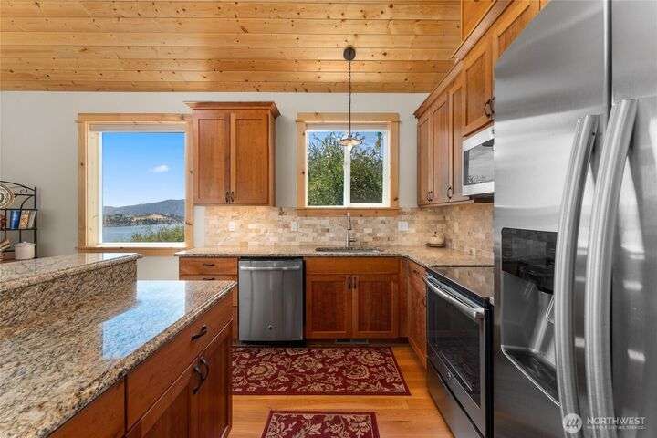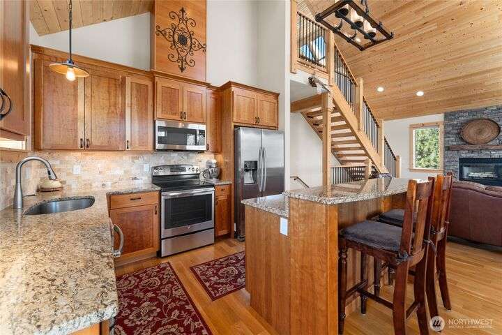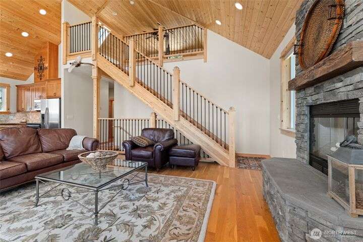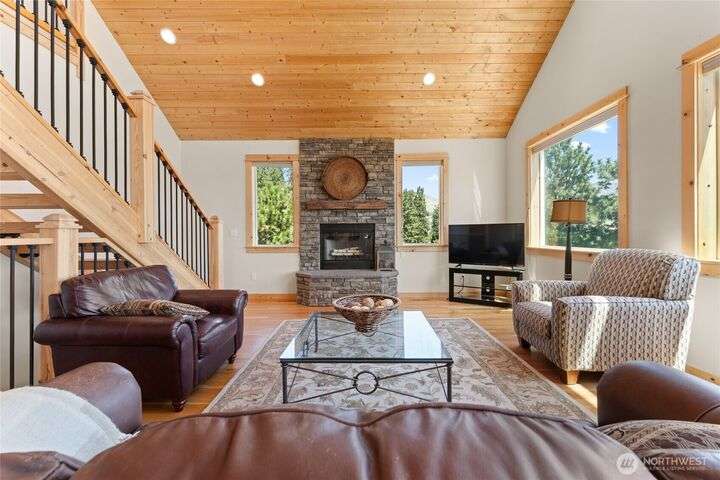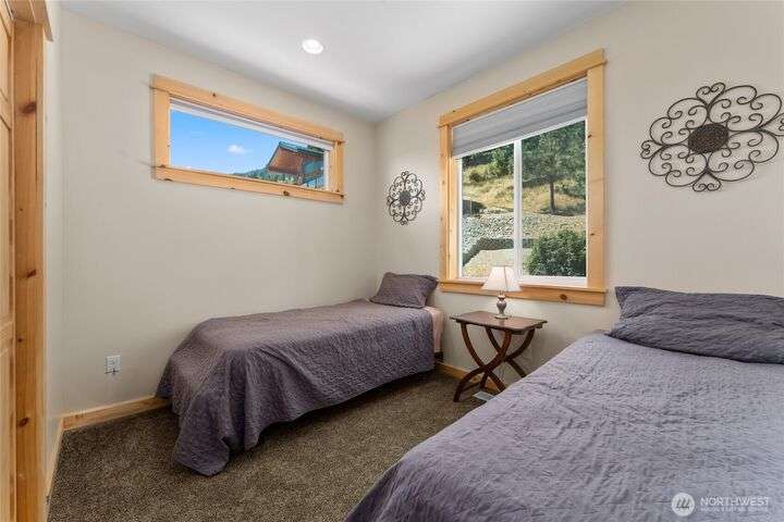 This stunning, like new, 3 br/3ba view home in the serene Morning Sun Estates offers contemporary elegance and community waterfront benefits on Lake Chelan. Great room and kitchen features white oak flooring, custom cherry cabinets, granite countertops and a cozy stone wood burning fireplace. The main floor has 2 bedrooms, including the primary with an en suite bath. Downstairs, enjoy the versatile rec room, an additional bedroom and full bath. Extra long 30' garage, ADDITIONAL PARKING on lower part of lot, and low maintenance landscaping. WF amenities include 600' of waterfront shared by 30 lots, parking, large grass swim area, shade trees and picnic tables. Marina features boat slips, buoys, moorings whips, restrooms and ice machine.