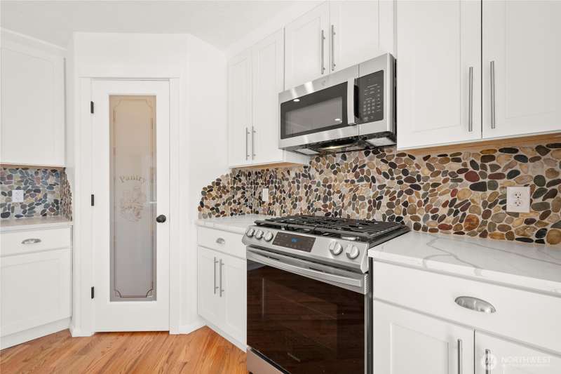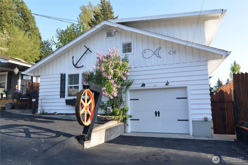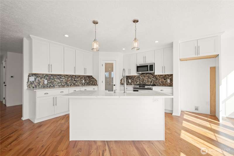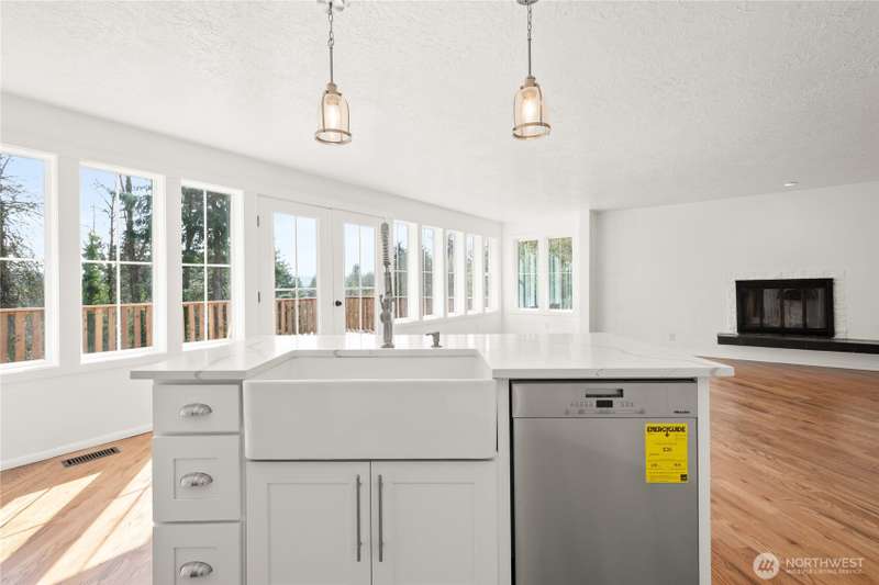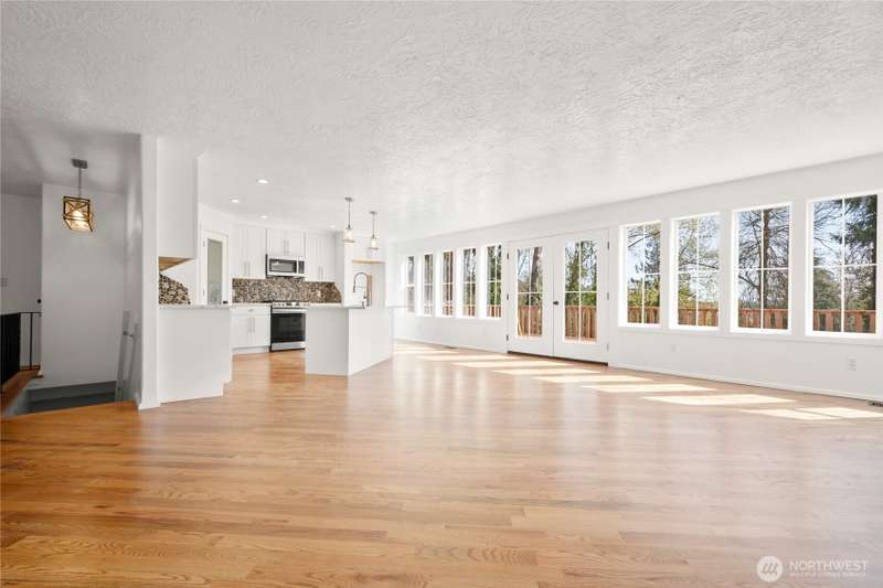 Beautifully Remodeled View Home on Old Kelso Hill! Your guests are greeted with a nautical theme & beautiful gate at the cozy front entrance to a pristine home boasting 2,040 SF, 3 bdrm, 3 bthrms, Great Room Living w/wall of viewing windows, living room w/FP, light and bright dining rm w/ FR doors to large viewing deck for entertaining, spacious updated kitchen w/SS appls-island eating bar-new cabinetry-quartz countertops-rock back splash-natural gas cooktop, primary bdrm on upper floor w/ensuite-tile floor-full bath, 2nd primary bdrm on main w/full bath-dual sinks, spacious family rm w/FP on lower level-door to covered patio & private back yard, lower level 3rd bdrm, new hardwood floors throughout, vinyl windows, utility rm & 1 car garage.