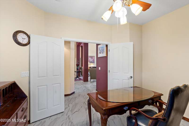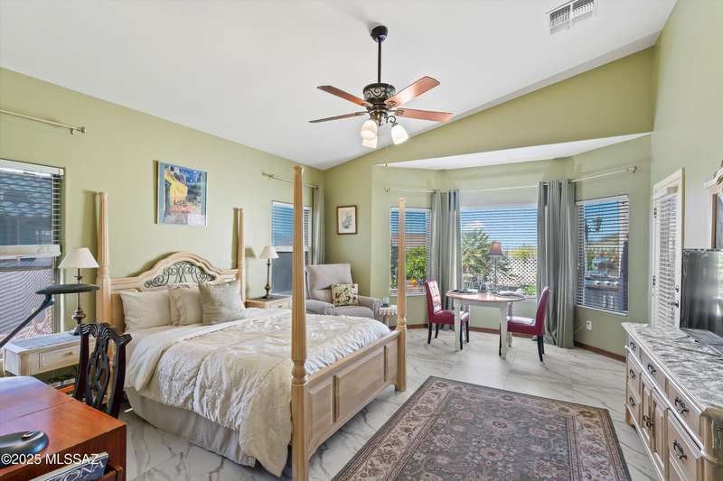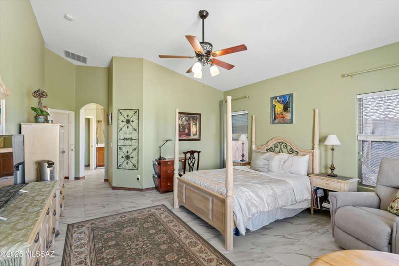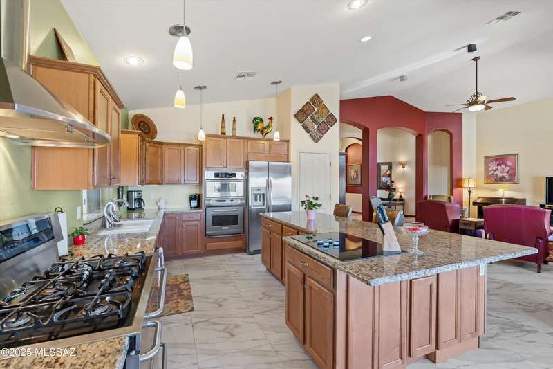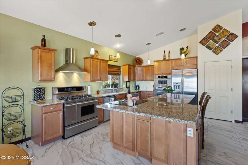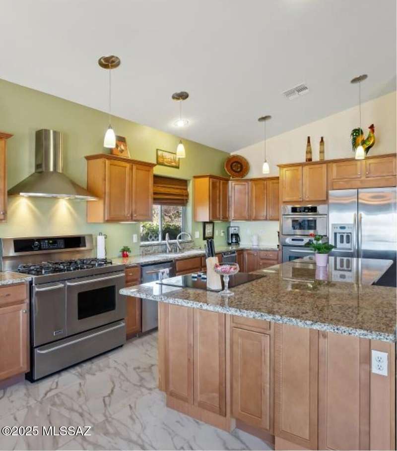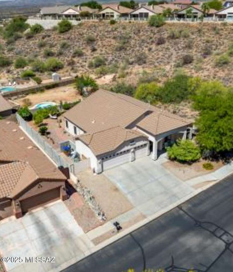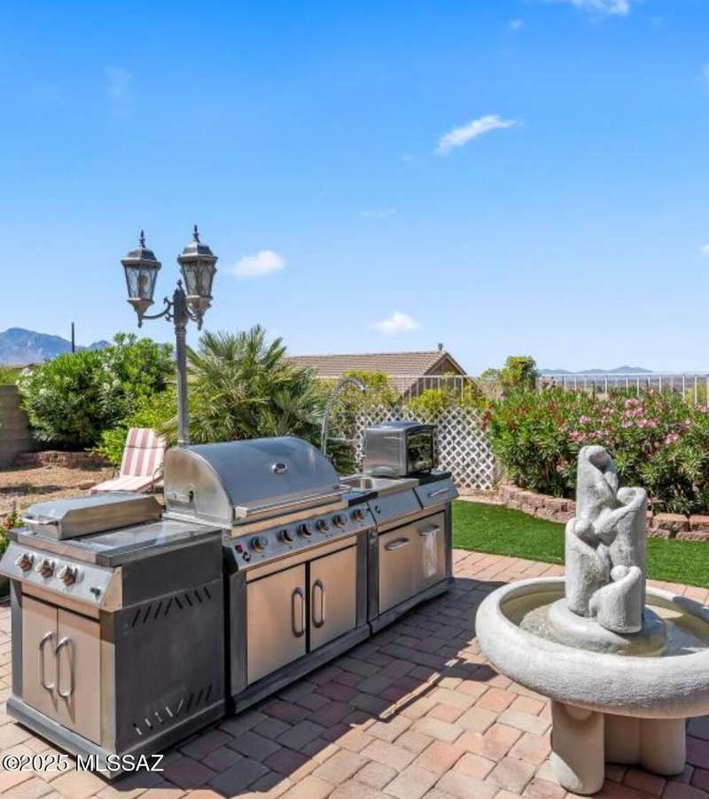 At 3,500 ft elevation, this Catalina Hills hilltop retreat offers stunning panoramic views and unmatched flexibility. Ideal for multigenerational living or income potential, it features a fully independent guest/in-law suite with private entrance, kitchen, laundry, and living space. The main home boasts expansive living areas, a chef's kitchen, and sweeping vistas. Outdoors, enjoy low-maintenance landscaping, a firepit, fountain, lighting, and a full outdoor kitchen. Privacy, luxury, and versatility. HVAC replaced in 2021.