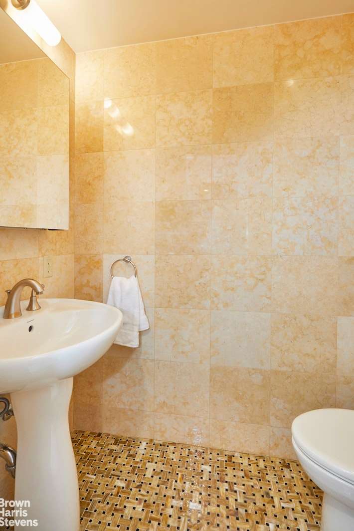 The main level features a sleek, windowed eat-in kitchen with granite countertops, cherry cabinets, ample storage, Sub-Zero refrigerator and freezer, microwave, and double oven-perfect for culinary enthusiasts. The kitchen flows effortlessly into a formal dining area. The elevated dining room, adorned with travertine stone flooring, overlooks the sunken living room, which boasts soaring ceilings, hardwood floors, and west-facing floor-to-ceiling windows. Spacious enough for lavish seating, the living room also accommodates a grand piano-ideal for hosting recitals. A powder room with onyx basket weave flooring, located in the foyer, adds a touch of luxury to the main level.