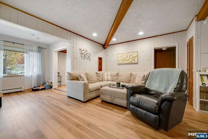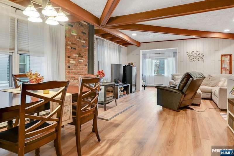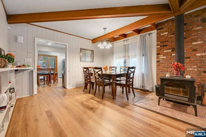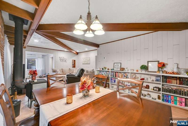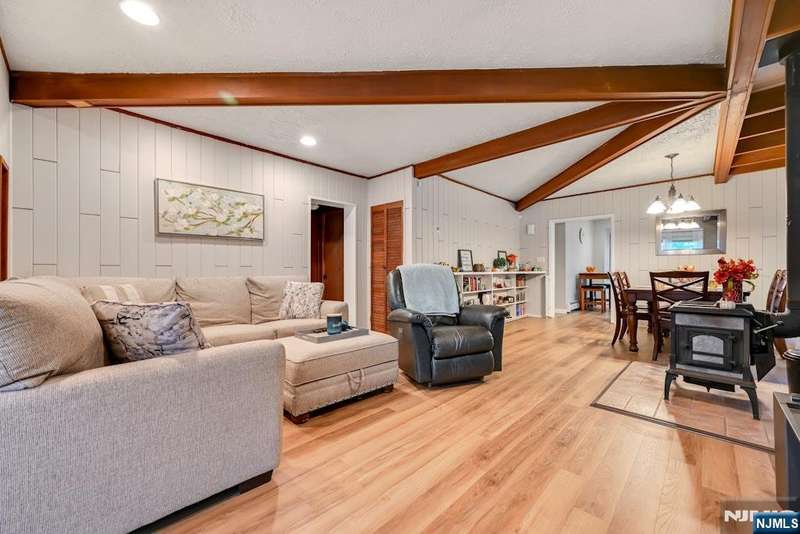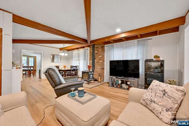 Welcome Home! This beautifully cared-for 3-bedroom, 2-bath Ranch combines timeless charm with today s modern comforts. Entry foyer features warm tile flooring, wood-accent ceiling. You ll find a bright, open floor plan perfect for everyday living and entertaining. Living and dining areas are filled with rich wood details and a cozy wood-burning stove creating a space that truly feels like home. Spacious eat-in kitchen shines with stainless steel appliances and sliding glass door that fills the room with natural light and opens to the backyard. Downstairs, a finished basement offers wonderful flexibility with a rec room, bonus space/home office, full bath and laundry area. Outside, enjoy a large, private, fenced-in backyard, driveway with parking for 6+ cars, and detached 1-car garage. Ideally located near schools, shops, public trans to NYC, and major highways. Updates Galore- House Painted Inside and Out (2020-21), Roof 2021 Warranty, New Flooring(2025), Front Pavers (2025), Fenced in Backyard (2022) Gas Heat and so much more. This move-in-ready home is waiting for you to make it your own.