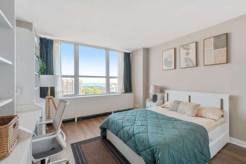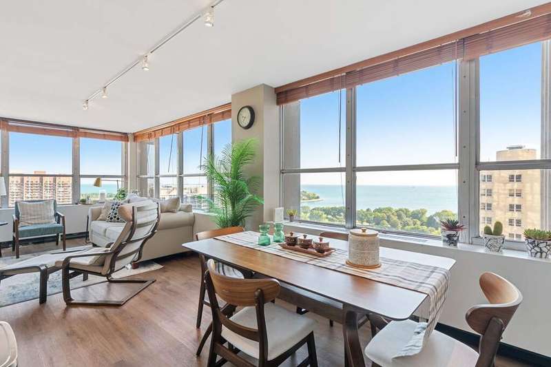 Open the door to sweeping views of Lake Michigan! This north and east exposure unit captures the magnificence of the lake, park, and harbor from every over-sized room. Living room is a stunner that will fit your largest parties. The kitchen features newer appliances and opens onto the ample dining area. King-sized primary bedroom looks to the lake with two walls of professionally organized closet space and en-suite bath. The second bedroom faces the lake with professionally organized closet space as well. A second family/guest bath, hall closets, and luxury vinyl in all the rooms completes the unit. Just steps from the lakefront. Enjoy amenities galore in this building. Pool, whirlpool, gym, basketball court, sundeck, grill/patio area, dog run, party room, and marketplace. Assessments include it all except electricity. Investor friendly with no rental cap. Building will be voting on upgrading elevators and plumbing risers in 2026. Management on site. Exceptional property.