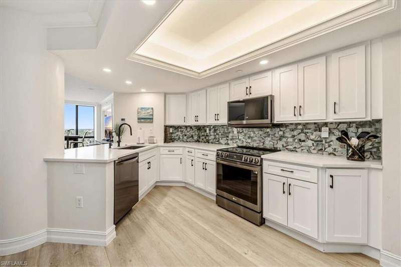Perched directly on the pristine sands of Park Shore beach, this luxury high-rise offers immediate access to the tranquil shoreline and the soothing rhythm of the Gulf waves. Whether you're strolling along the water's edge at sunrise, unwinding by the resort-style pool, or entertaining friends, every moment is infused with the essence of beachfront living. The Terraces is a luxury high-rise on the beach with a resort-style pool, fitness center, 24-hour security and a private paved Park Shore beach path on ocean's edge. This 2-Bedroom, 2 Bath residence, on the 15th floor, has been renovated for elegance with luxury vinyl wood flooring throughout, an open kitchen w/ quartz countertops, and a full remodel of the master bathroom with a custom closet and built in dressing room. Enjoy spectacular Venetian Bay views from your open-air balcony in the early morning hours or at sunset. AND, The Terraces is not just a serene retreat-it places you at the heart of Naples' vibrant lifestyle. From your doorstep, you are moments away from world-class dining, upscale shopping, and cultural attractions that define Naples. Enjoy year-round festivals, art galleries, lively music events, and a bustling social scene. Outdoor enthusiasts will find endless options for golf, tennis, boating, and biking, while gourmet markets and trendy cafes beckon just around the corner. Enjoy this rental experience that will introduce you to one of Naples most sought after beachfront communities.