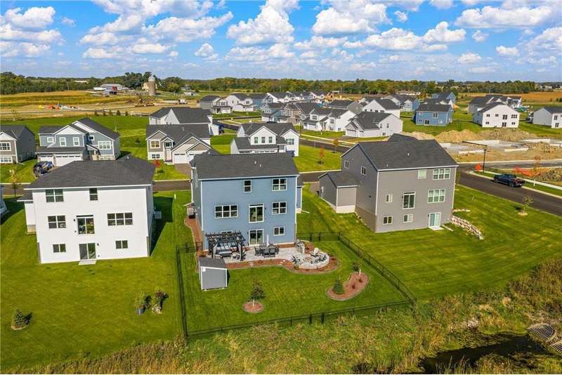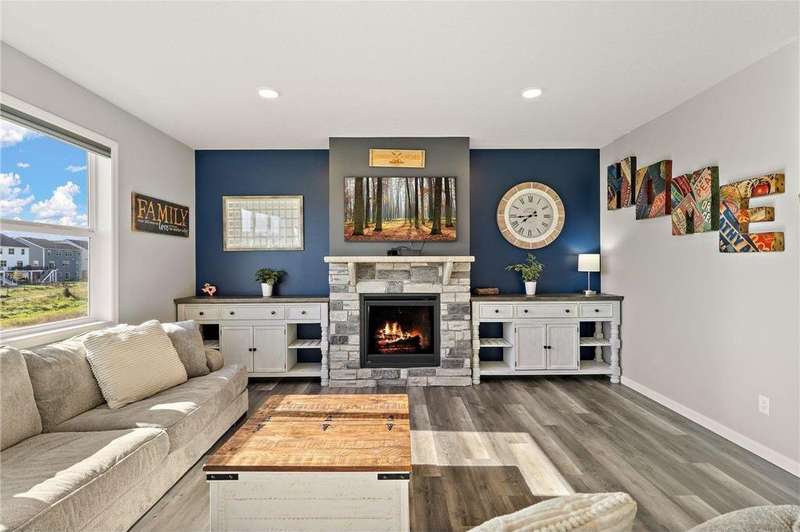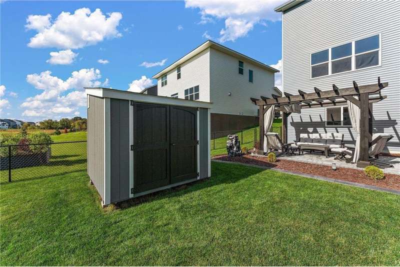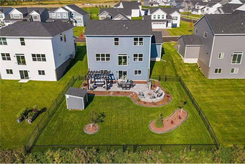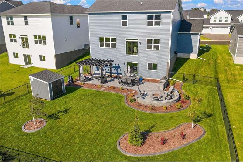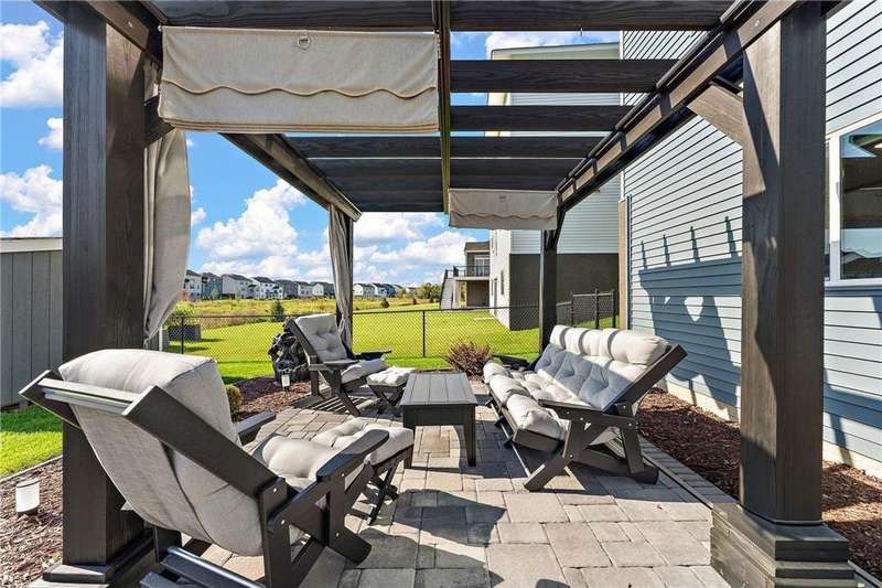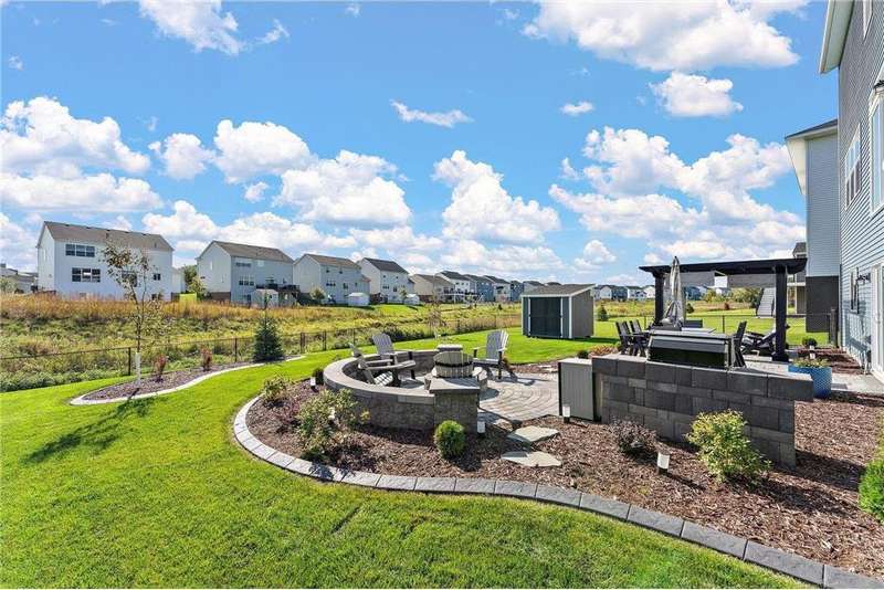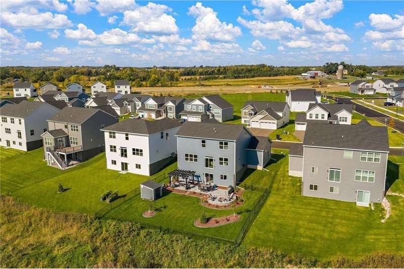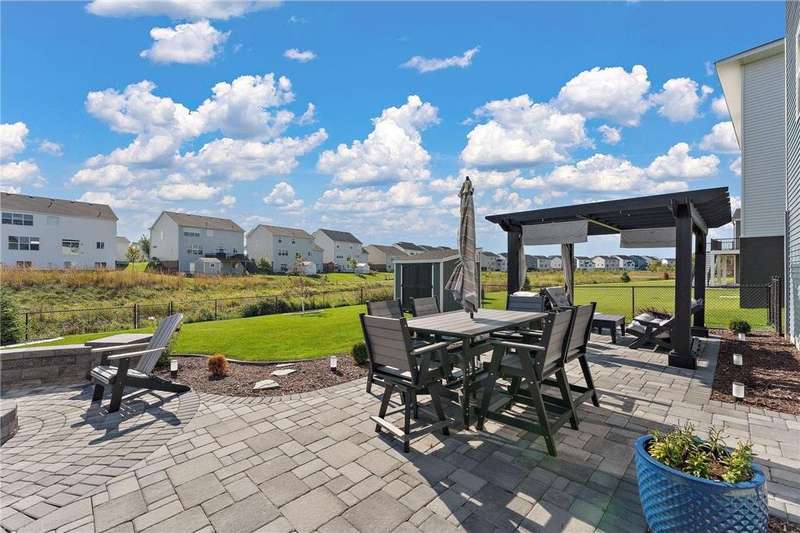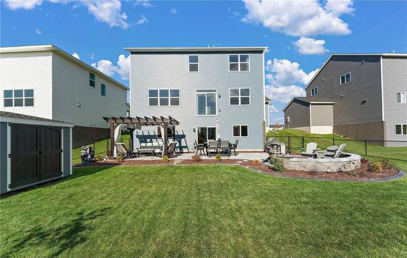 Outstanding 2024-built two-story in the highly-sought after Legacy Bay Farms! Beautifully finished top to bottom with over $95,000 in upgrades to fall in love with this home! Better than new, shows like a model with all the upgrades. From the moment you pull up, you will notice the concrete curbing around the trees & landscaping. Permanent lights surround the front roofline of the home, ready for year-round fun. No more ladders to hang your holiday lights! The lovely front porch leads you into the spacious entry & flex room. Perfect for your home office, piano or library. You will appreciate the large open floor plan! The living room has a gorgeous stone fireplace & mantle, recessed lights plus wide plank flooring across the entire floor. Large picture windows bright up the living room, w/motorized blinds. Your large table will fit comfortably in the dining room w/more options to sit at the breakfast bar. Fantastic kitchen has the large quartz island w/sink, ready for all your food prep. Tiled backsplash, new kitchen lights & newly finished walk-in pantry w/additional counter & storage space! Mudroom has hooks for coats & room for your bench w/half-bath nearby. Upper level has four bedrooms & separate laundry room w/window. New Samsung washer & dryer added plus cabinets & shelf. The landing has a new chandelier & motorized shade for the large window. Lovely tray ceiling & new fan/light in the primary bedroom w/large picture window, new blinds & walk-in closet plus private ¾ bath. Dual sinks, new towel bars, new mirrors, & shower door added. Most bedrooms have walk-in closets, new ceiling fans/lights & fresh paint. Full bath near the bedrooms. Lower level family room has space for large furniture & game area plus the fifth bedroom w/large walk-in closet. Fourth bathroom is nearby. Utility room has room for storage, new Honeywell humidifier added & water softener installed. Step outside to the incredible fenced backyard, ready for all your gatherings. All new! Built-in grill w/electric rotisserie, professionally designed & installed patio brick w/firepit plus light feature & built-in bench, lovely pergola w/covers & new shed nearby! Neatly manicured yard, retractable water hose reels. Garage is newly finished w/new heater added. Don't miss it! Welcome home!