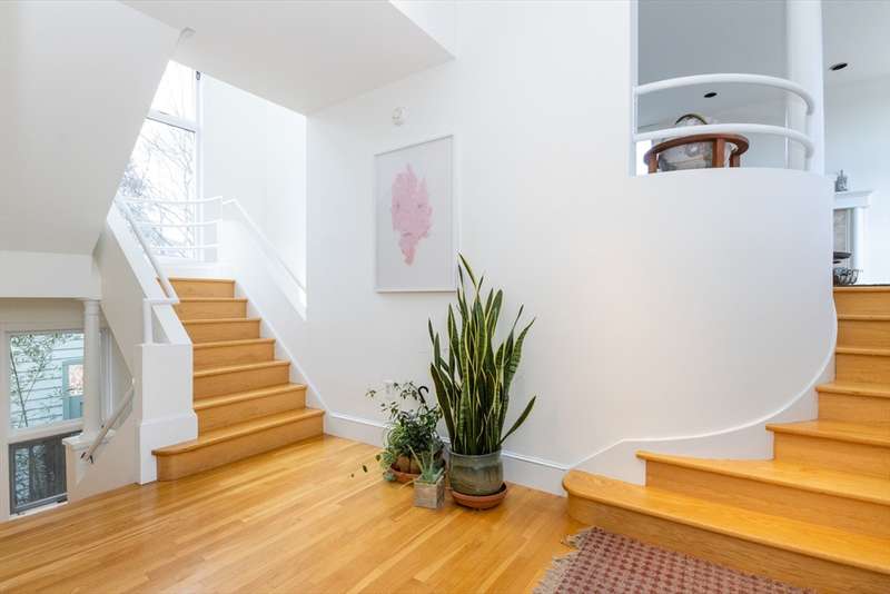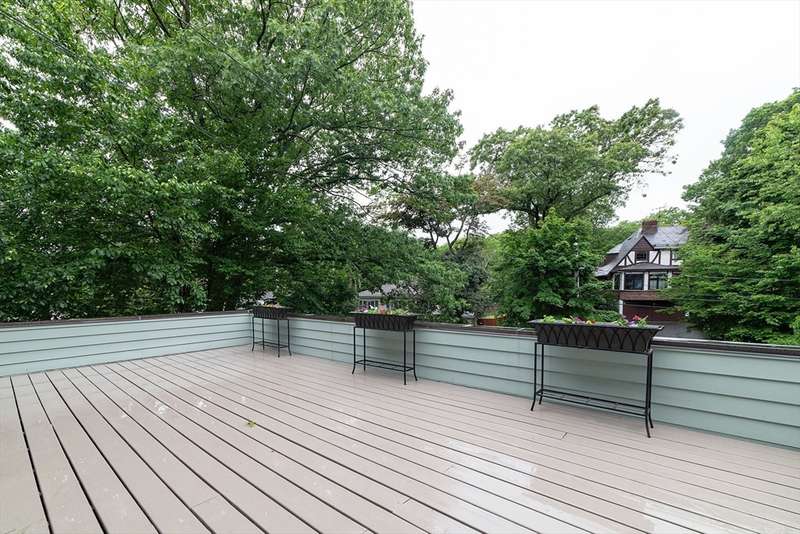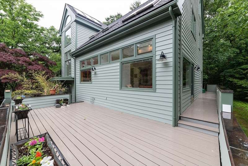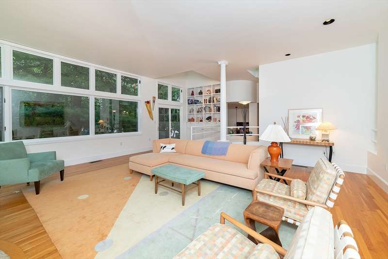 Impressive, custom built contemporary home on an expansive half acre+ wooded lot on tree lined street in Chestnut Hill. Designed by Harvard architect Mollie Moran includes sweeping 10 ft. cathedral ceilings & window walls overlooking lush park like multi level landscape. Elegant living room with marble wood burning fireplace accented with a wall of built-ins & a stunning entertainment sized dining room. Spacious, eat-in kitchen with built in window seat looks out onto private front deck. Adjoins a comfortable family room with wood burning stove & exits through triple patio door to another private deck. Second level includes two bedrooms, a bath & multiple closets with laundry. Also a king size en-suite primary bedroom & an additional office or media room that could easily be used as a bedroom. The third floor suite is perfect for teen or au pair. This is a one of a kind property! 2018 roof, high efficiency HVAC system & more. This is a must see.
