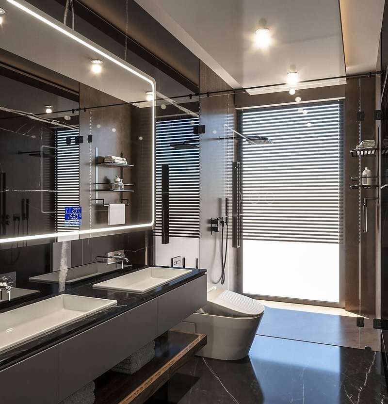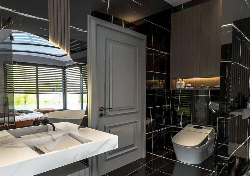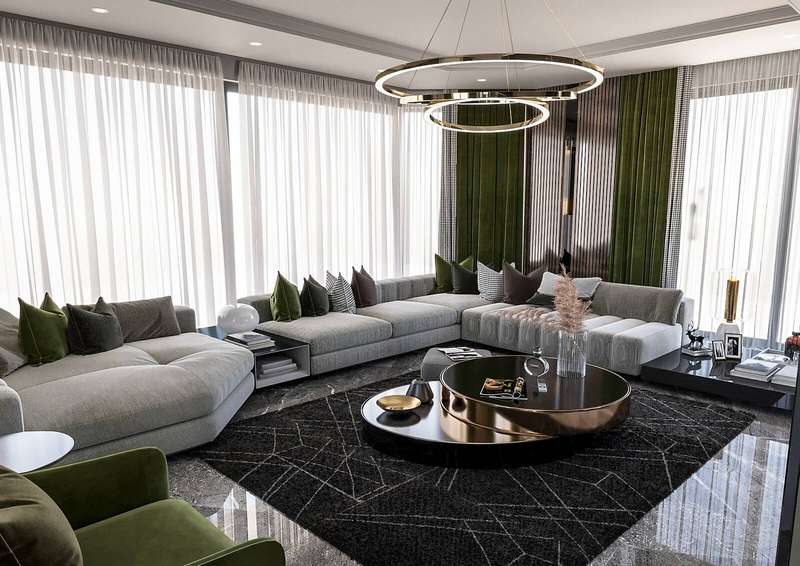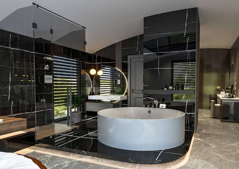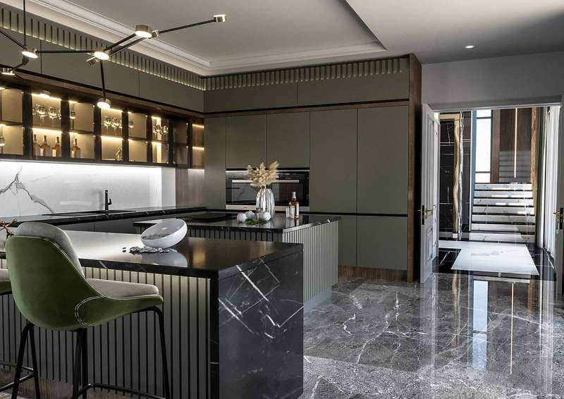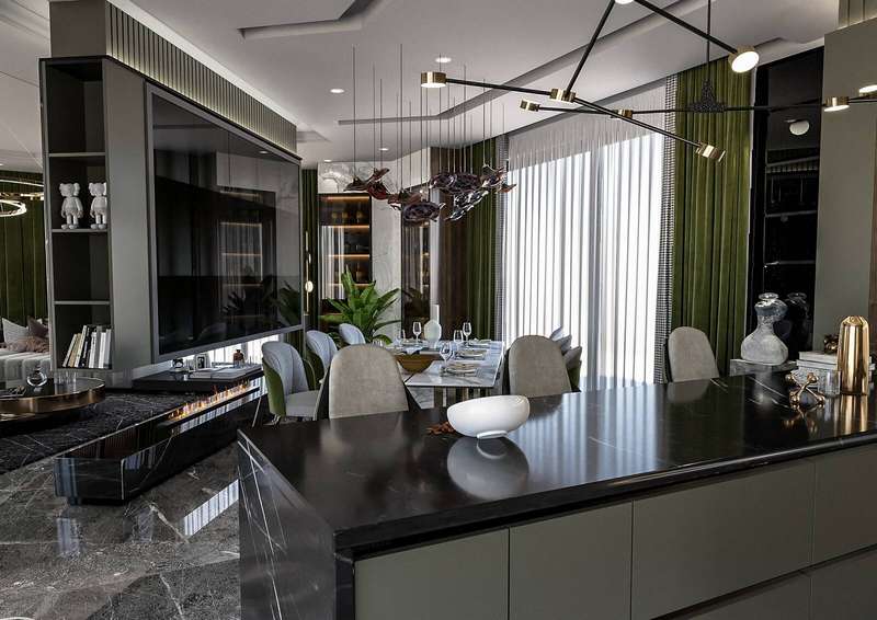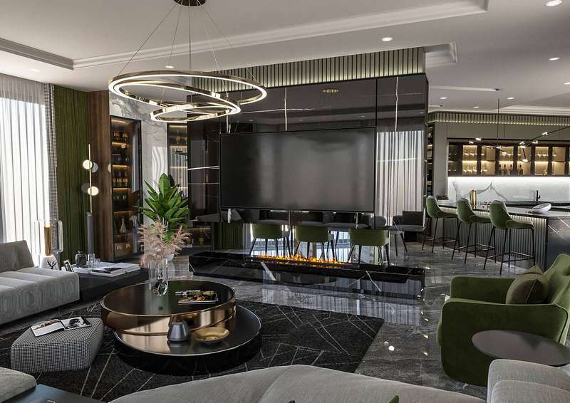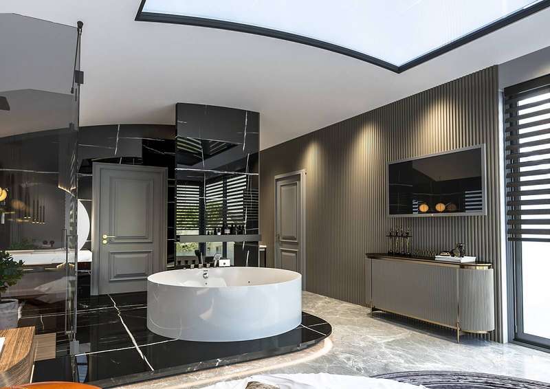The villa provides spacious living areas and consists of five bedrooms, a living room, an open-plan kitchen, six bathrooms, two balconies, and a terrace in the interior design. The modern-designed villa is equipped with ceramic flooring, aluminum double-glazed windows, an acrylic countertop in the kitchen, kitchen, and bathroom cabinets, an underfloor heating system, air conditioning, a smart home system, a fireplace, and a jacuzzi. In addition, the villa will be delivered with Siemens brand white goods.