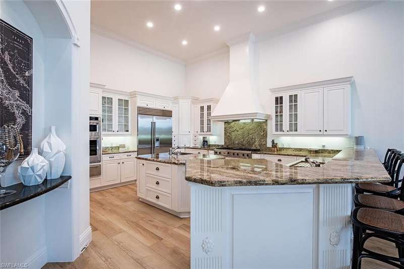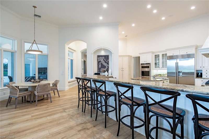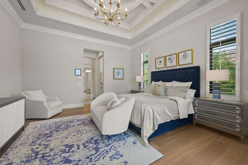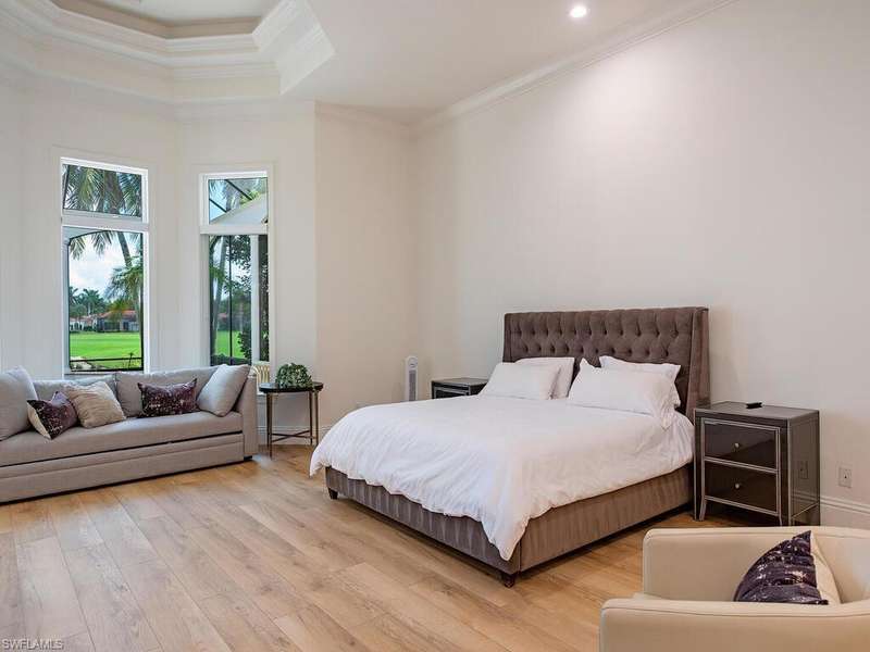 Welcome to Resort Style Living, Welcome to Grey Oaks! Sitting on over 3/4 of an acre, this exceptional home in Grey Oaks offers an easy lifestyle. Featuring five spacious bedrooms plus a den, in addition to 4.5 baths, this one level residence is designed for both comfort and convenience. New flooring throughout adds to the charm of this exquisite home. Move right into this fully furnished home. Neutral colors throughout. Abundant natural light fills the home, highlighting the spectacular lake views that overlook the Palm Course. The master suite is a true retreat, boasting exceptional views, while the generously sized guest bedrooms ensure comfort for family and friends. The heart of the home is the expansive kitchen, which is perfect for gathering, featuring granite countertops, a large island, and high-end appliances, complemented by a separate bar and beverage area for entertaining. Step outside to an expansive outdoor living area, where you'll find a pool and spa as well as