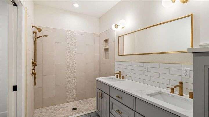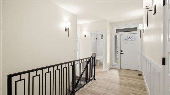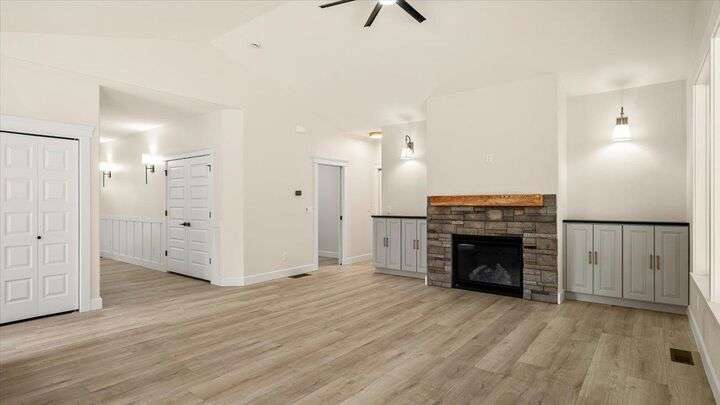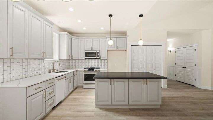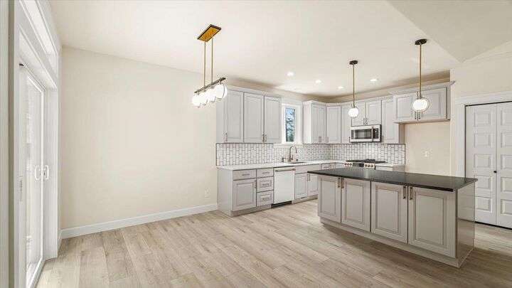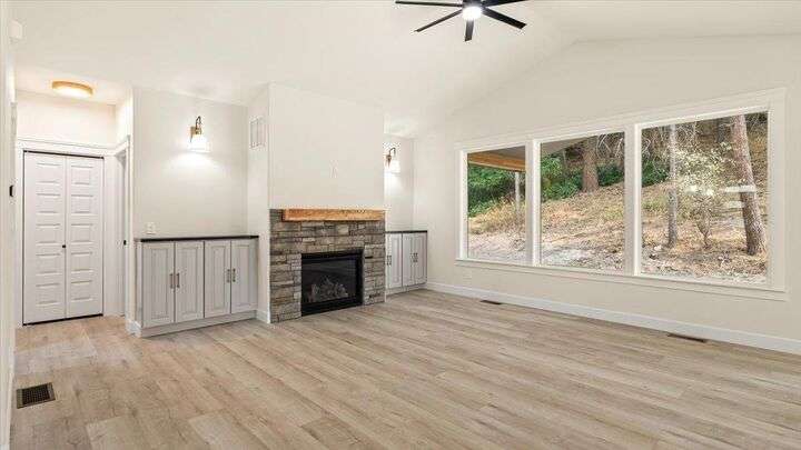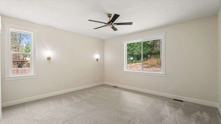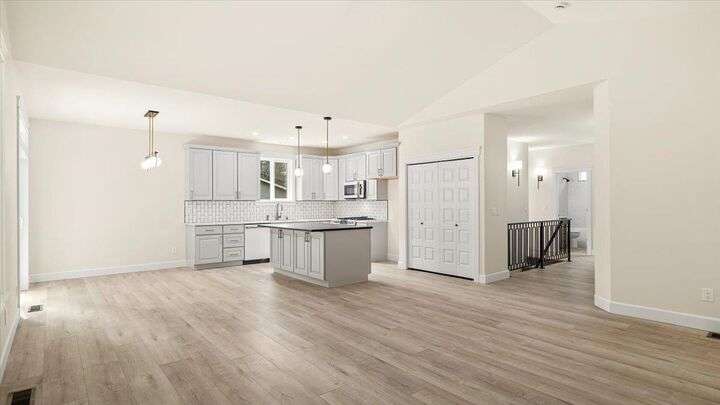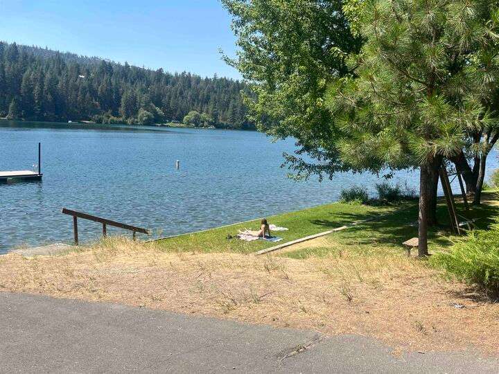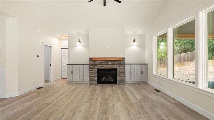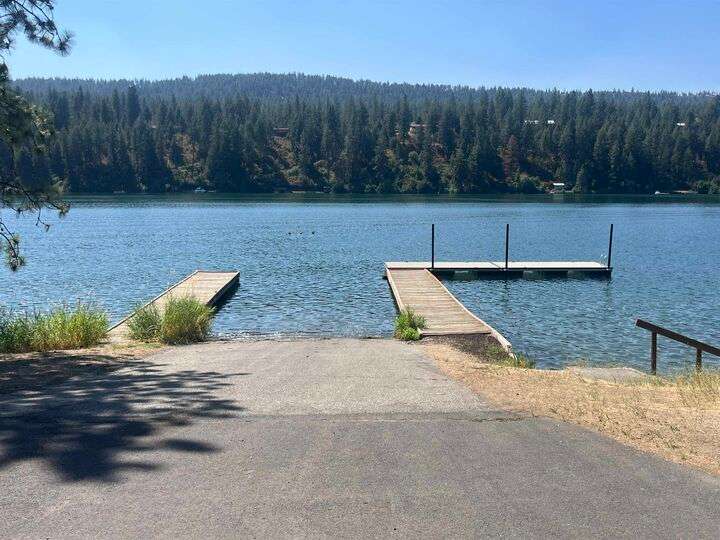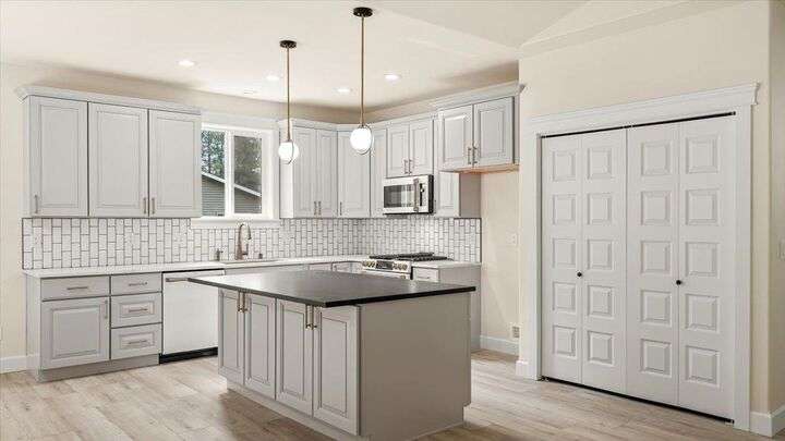 Stunning rancher on a ½ acre lot, just a stone’s throw from Lake Spokane/Long Lake with exclusive Lakeridge Park membership for boating and private lake access! Built by renowned builder Mike Miller, this thoughtfully designed home features a main-level layout with 3 bedrooms, 2 bathrooms, and high-end designer finishes throughout — including stylish black and gold hardware, shaker cabinetry, and quartz countertops. Enjoy the spacious, open-concept living area with Cafe Series appliances, wide plank LVP flooring, wood-wrapped windows, and a striking vertical wainscot entry wall. The modern open stair rail leads to a large unfinished basement w/ potential for more bedrooms, bathroom and a family room. Stay comfortable year-round with a gas furnace and heat pump. Take advantage of the oversized 3-car garage, complete with a deep 3rd bay and 10' wide door-perfect for trucks, toys, or a workshop. Relax or entertain on the 21x15 covered deck, surrounded by natural privacy and mature trees.