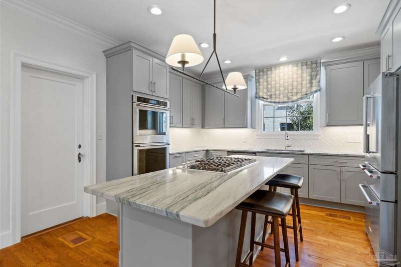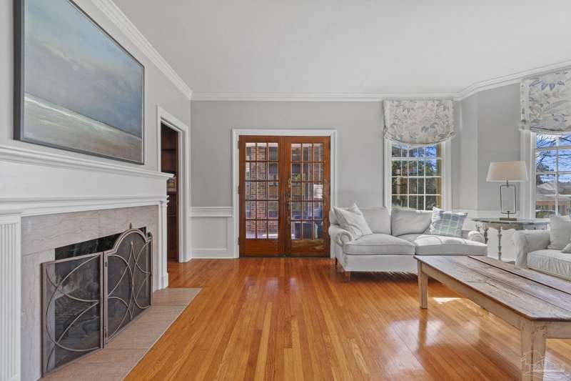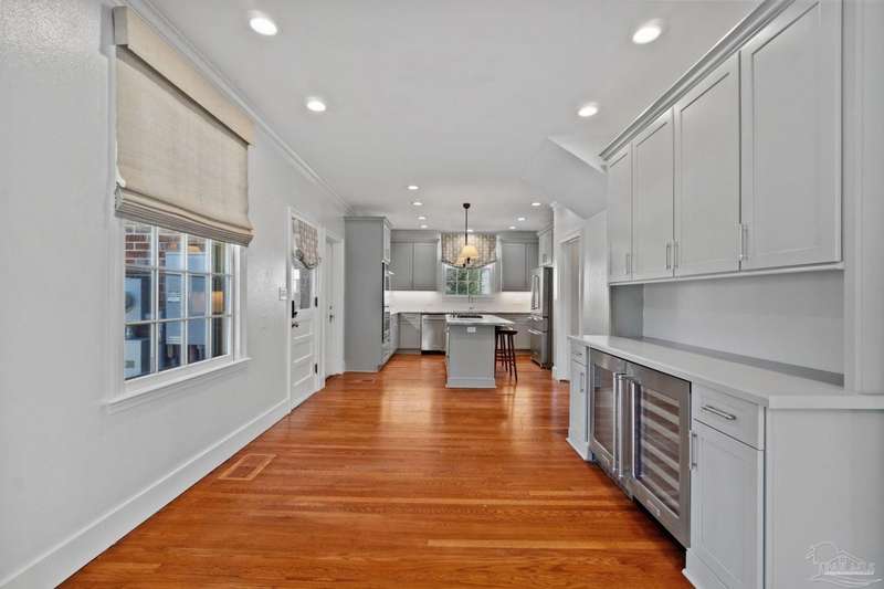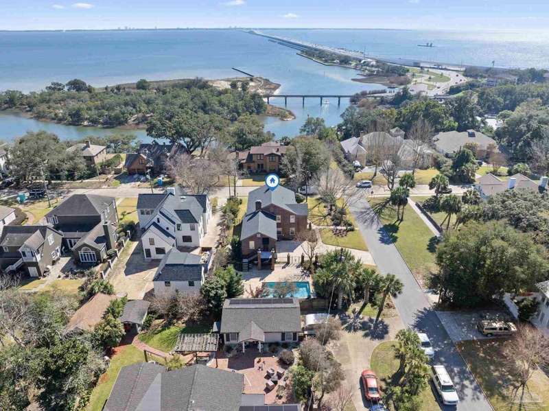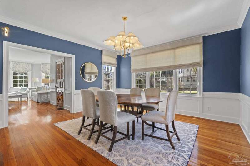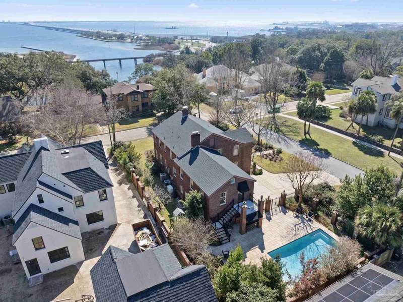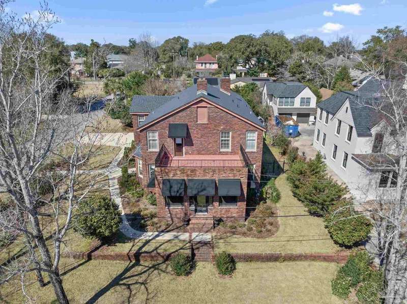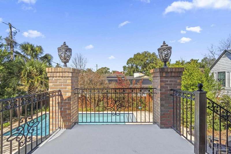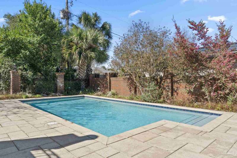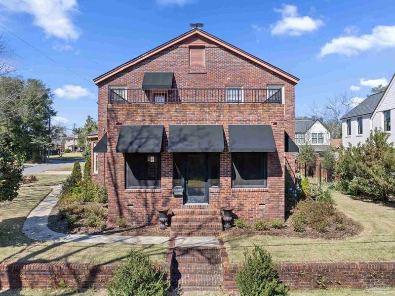 Stunning two-story Tudor-style brick pool home on a coveted corner lot in historic East Hill effortlessly blends timeless charm with modern sophistication. This updated 1937 gem offers elevated views of Pensacola Bay and an award-winning front yard that sets the stage for its character and elegance. Inside, original hardwood floors, crown molding, and impressive ceiling height speak to the craftsmanship, while thoughtful updates enhance everyday comfort. The first floor welcomes you with a spacious living room flooded with natural light, while an adjacent Florida room offers the perfect space for relaxation-seamlessly extending the home's interior living area. The heart of the home, the gorgeous remodeled eat-in kitchen impresses with Kitchenaid stainless steel appliances, marbled Quartzite countertops, soft-gray shaker-style cabinetry, and a striking Arabesque lantern tile backsplash. A generous island provides ample prep space and storage, while the built-in butler's pantry, complete with a beverage refrigerator and wine cooler, ensures effortless entertaining. The first-floor study, featuring original built-in shelving and a fireplace, offers versatile use as an additional bedroom. The master suite boasts a private deck with serene water views, while its sophisticated, completely remodeled bathroom exudes luxury. A 600 sq. ft. multi-purpose room serves as the ultimate entertainment space, and the fourth bedroom-currently converted into an impressive walk-in closet-can easily be repurposed. Designed for outdoor living, the backyard is surrounded by lush landscaping, fruit trees, and a play area. The sparkling pool is complemented by brick pavers and a covered outdoor entertainment area with bar seating, and sink-all tucked away behind a stately brick wall with wrought iron fencing and accent lighting. Additional highlights include a two-bay garage and within walking distance to Publix, neighborhood dining, parks and more.