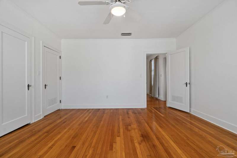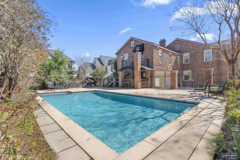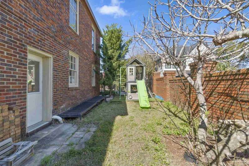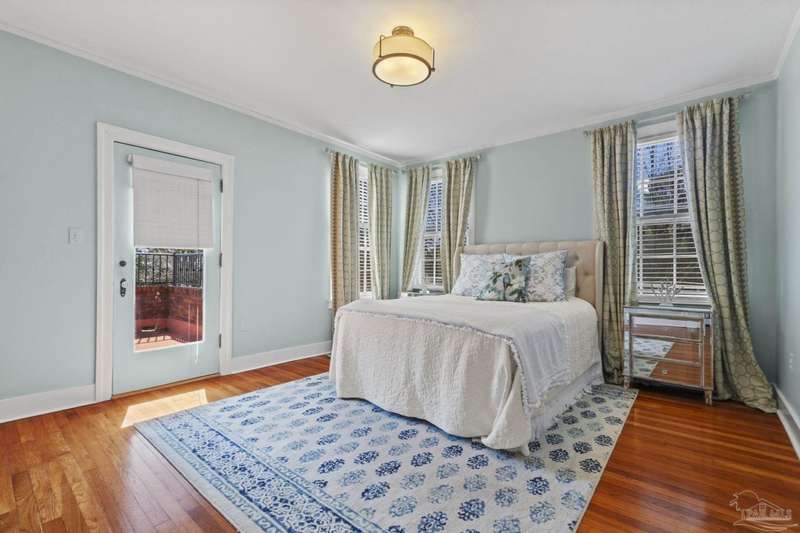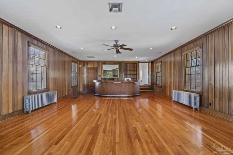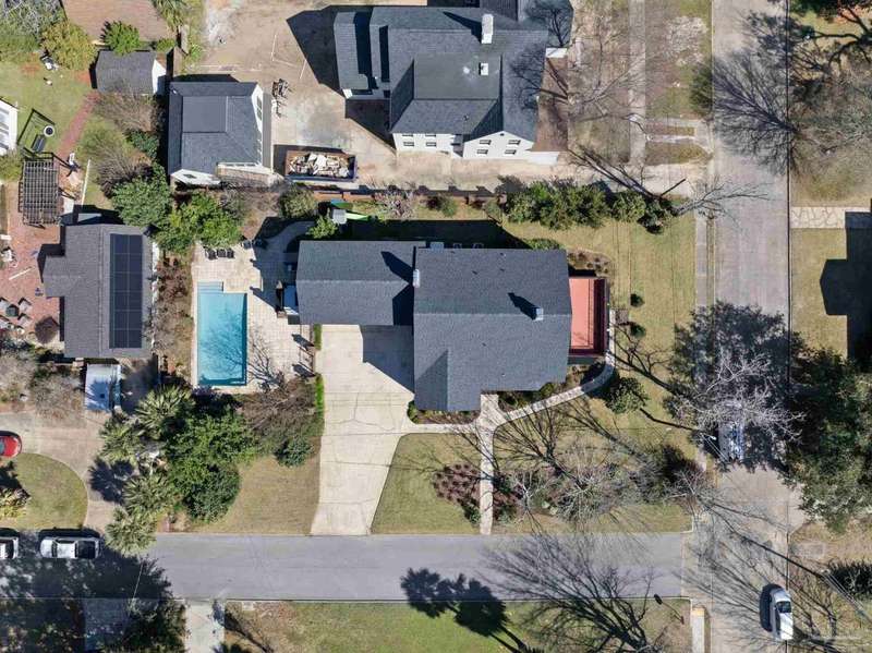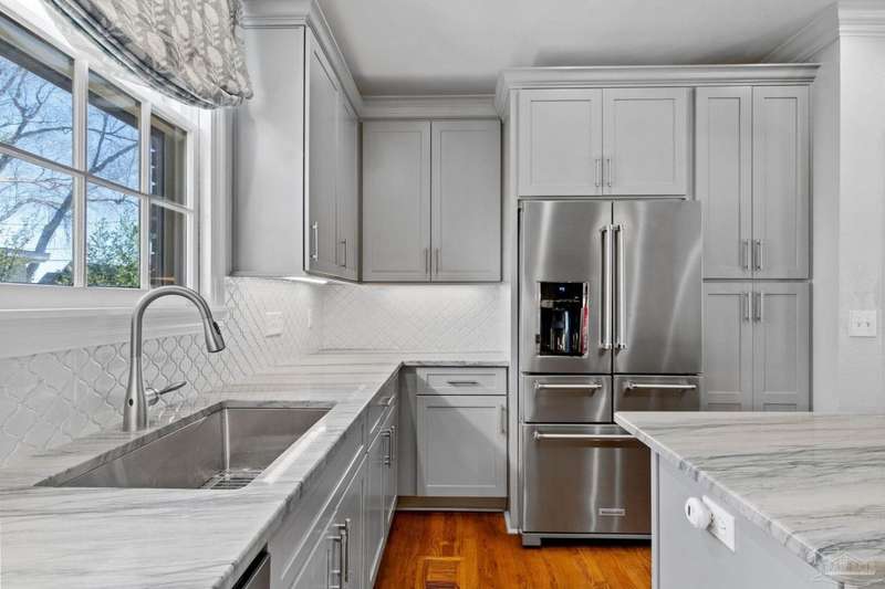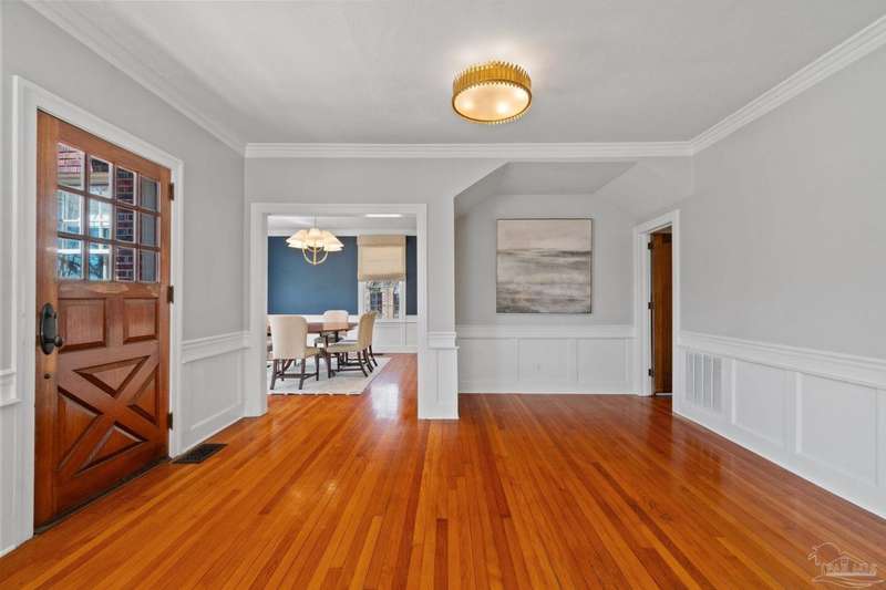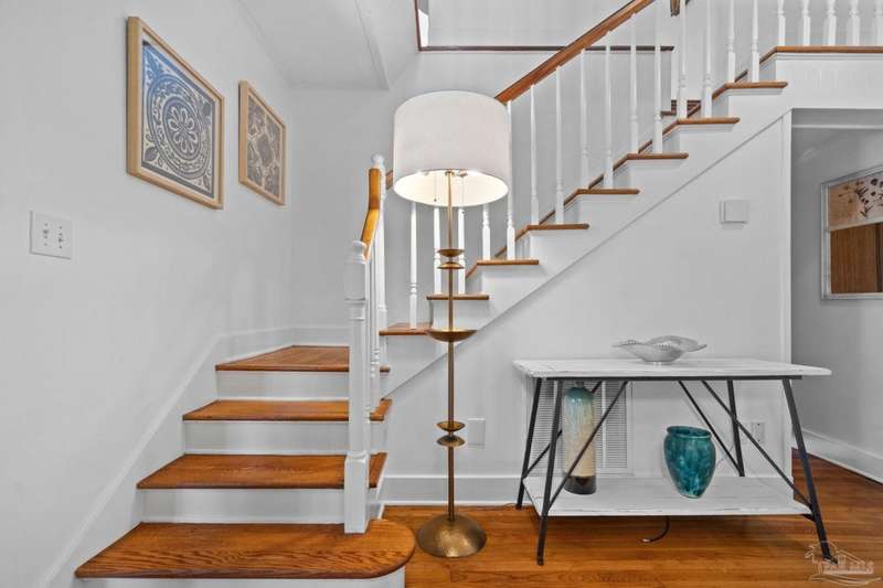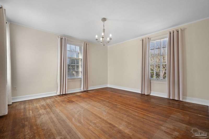 Stunning two-story Tudor-style brick pool home on a coveted corner lot in historic East Hill effortlessly blends timeless charm with modern sophistication. This updated 1937 gem offers elevated views of Pensacola Bay and an award-winning front yard that sets the stage for its character and elegance. Inside, original hardwood floors, crown molding, and impressive ceiling height speak to the craftsmanship, while thoughtful updates enhance everyday comfort. The first floor welcomes you with a spacious living room flooded with natural light, while an adjacent Florida room offers the perfect space for relaxation-seamlessly extending the home's interior living area. The heart of the home, the gorgeous remodeled eat-in kitchen impresses with Kitchenaid stainless steel appliances, marbled Quartzite countertops, soft-gray shaker-style cabinetry, and a striking Arabesque lantern tile backsplash. A generous island provides ample prep space and storage, while the built-in butler's pantry, complete with a beverage refrigerator and wine cooler, ensures effortless entertaining. The first-floor study, featuring original built-in shelving and a fireplace, offers versatile use as an additional bedroom. The master suite boasts a private deck with serene water views, while its sophisticated, completely remodeled bathroom exudes luxury. A 600 sq. ft. multi-purpose room serves as the ultimate entertainment space, and the fourth bedroom-currently converted into an impressive walk-in closet-can easily be repurposed. Designed for outdoor living, the backyard is surrounded by lush landscaping, fruit trees, and a play area. The sparkling pool is complemented by brick pavers and a covered outdoor entertainment area with bar seating, and sink-all tucked away behind a stately brick wall with wrought iron fencing and accent lighting. Additional highlights include a two-bay garage and within walking distance to Publix, neighborhood dining, parks and more.