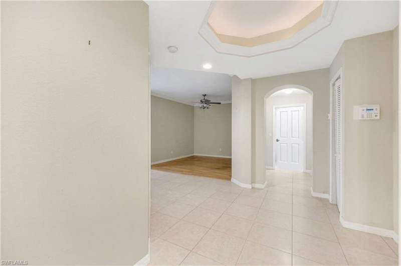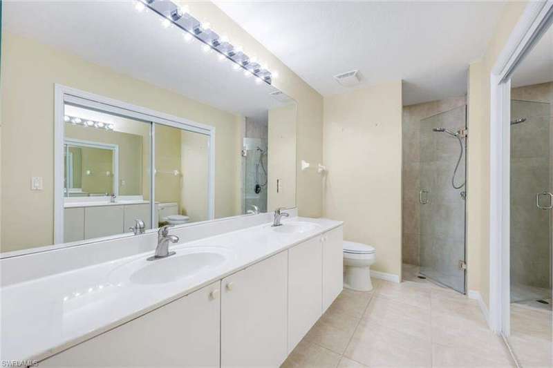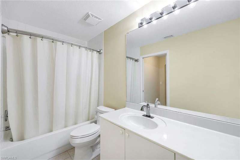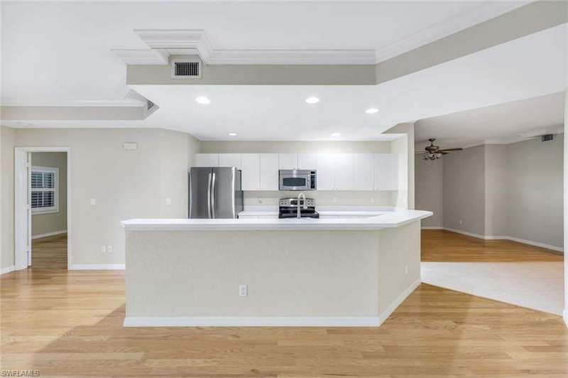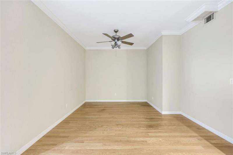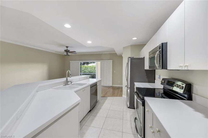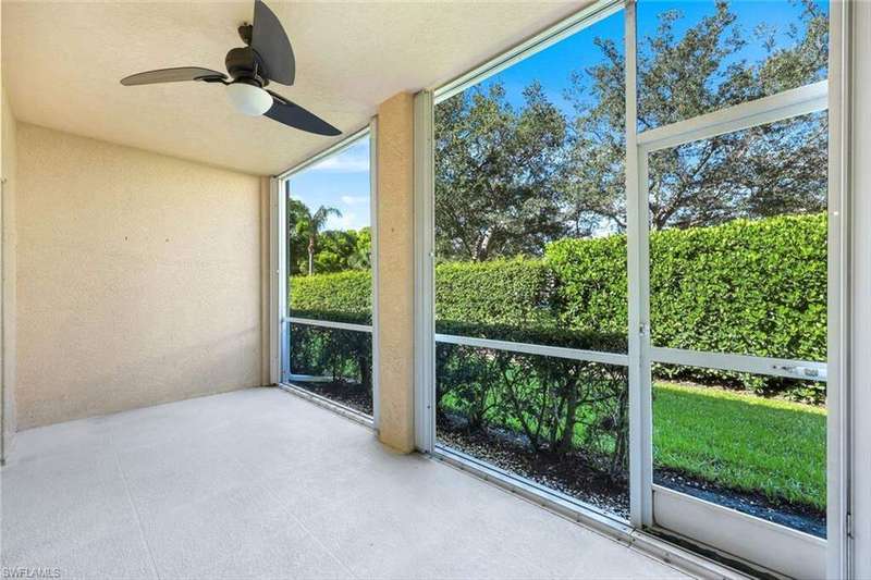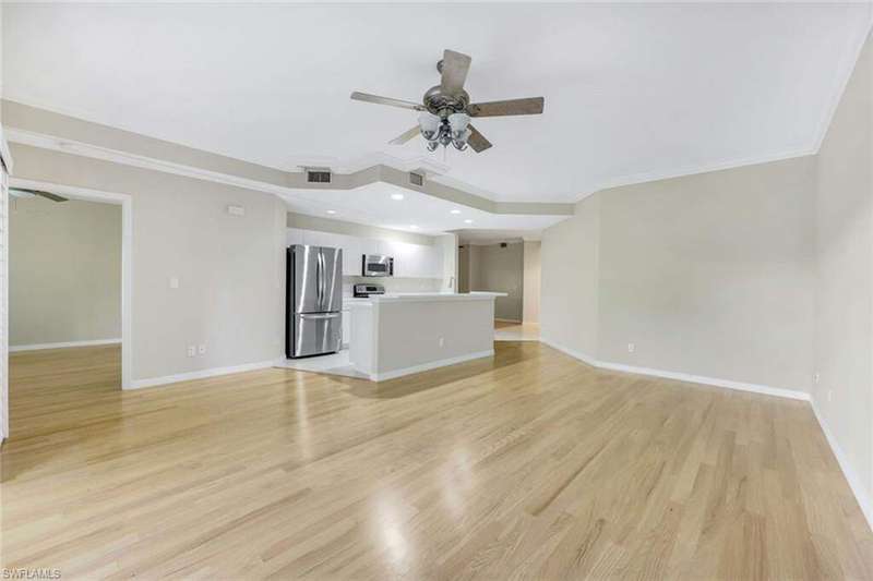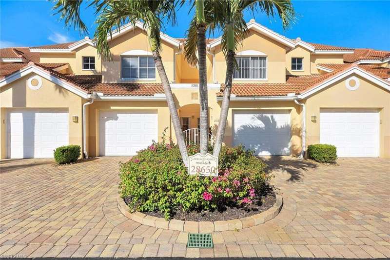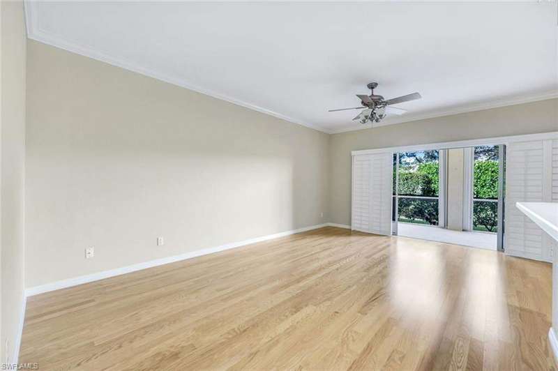 Experience the ultimate in relaxed coastal living in this beautifully maintained 1st-floor carriage home with attached garage. Located in the upscale gated community of Woods Edge which is west of U.S. 41 and just minutes from Bonita Beach. Spacious 2-bedroom + den, with option to easily convert to 3rd bedroom. Enjoy a bright split floor plan with tile and real wood flooring throughout, plantation shutters, crown molding and high ceilings. The Great room concept has open kitchen with expansive breakfast bar, dining area and screened lanai with tranquil landscaped views... perfect for morning coffee or just relaxation. Additional highlights include hurricane shutters. The primary suite features a walk-in closet and ensuite bath with dual vanities and walk-in shower. Just steps to the heated sparkling pool and beautiful clubhouse. Woods Edge is a great location with sidewalks perfect for leisure walks or biking. Low HOA fees and a prime location near dining, shopping, and the Gulf make this an exceptional year-round residence or seasonal retreat.