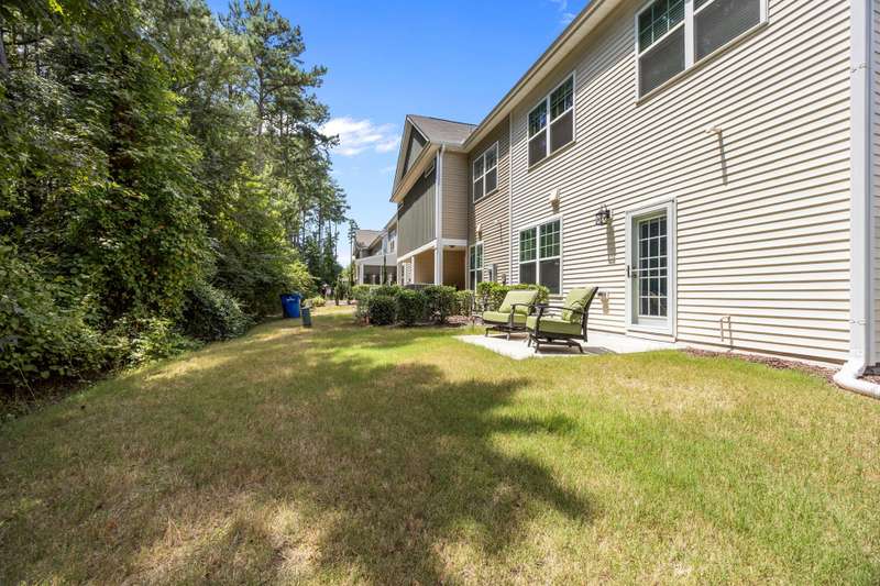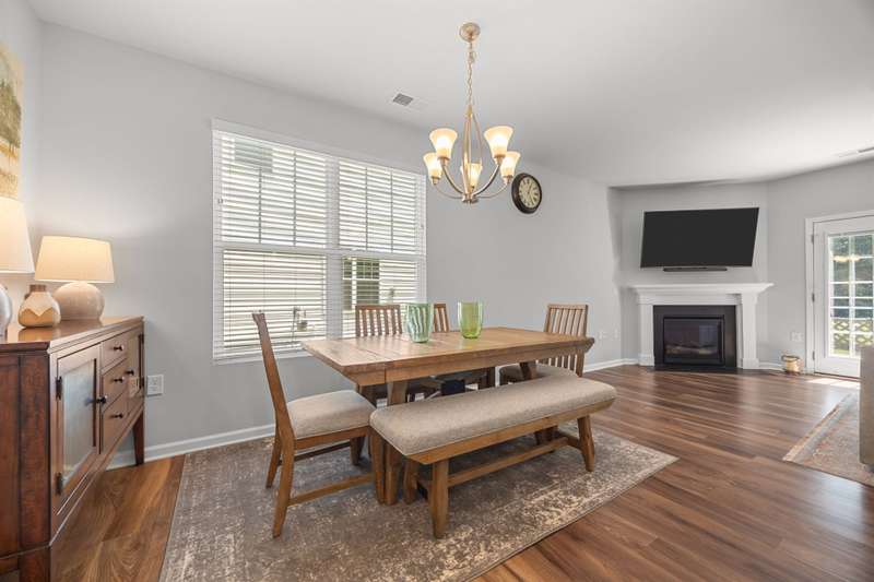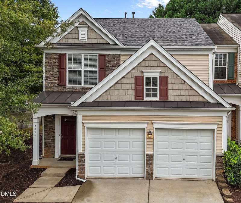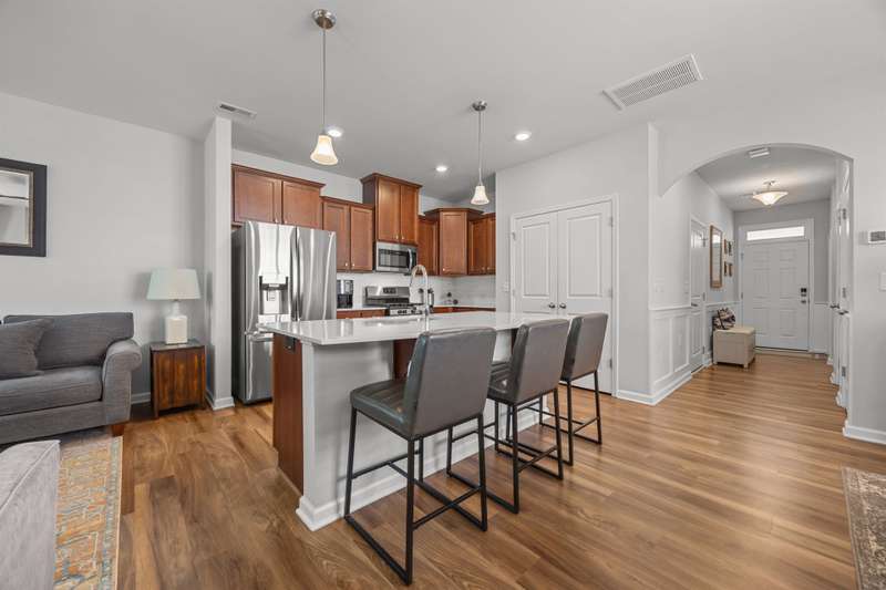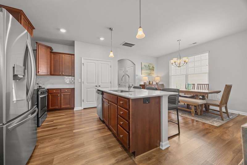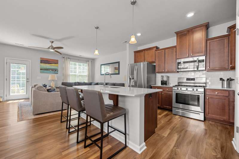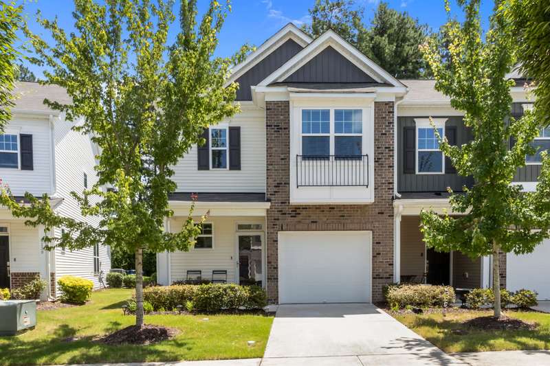 Looking for low-maintenance living with style and space? This bright and beautifully kept end-unit townhome in City Walk might just be the one! You'll love the welcoming covered front porch and all the natural light pouring in. Step inside to find gorgeous LVP flooring throughout the main level and custom trim details that add a touch of charm right from the entry. The kitchen is a total standout?with 42'' staggered cabinets, quartz countertops, a sleek tile backsplash, gas range, and a roomy double-door pantry. It opens right up to a spacious family room where you can cozy up by the corner gas fireplace. Upstairs, the primary suite is seriously impressive?plenty of room to spread out, plus a bathroom with dual sinks, quartz counters, tile floors, and a stylish walk-in shower. Don't miss the walk-in closet! There are two more good-sized bedrooms, a full bath, and a separate laundry room, all on the second floor. Other perks? 9-foot ceilings on both levels, hardwood stairs, a 1-car garage, and access to the neighborhood pool. Out back, enjoy peaceful evenings on your private patio facing the woods. And the location? Super convenient?just minutes to restaurants, shops, and major highways.