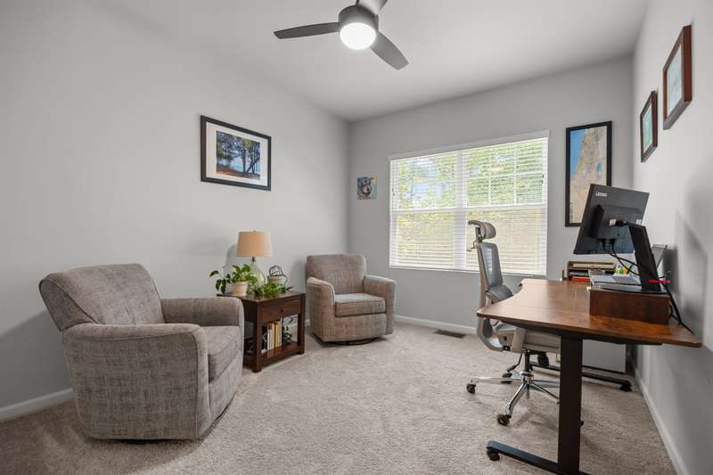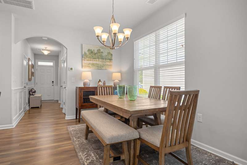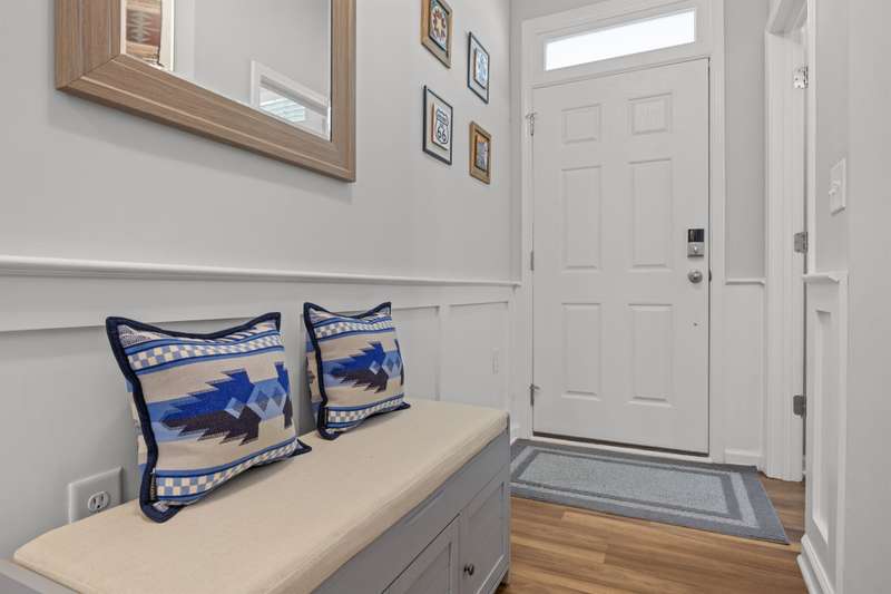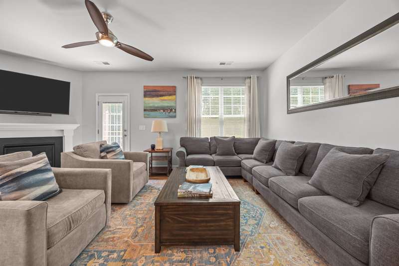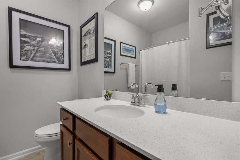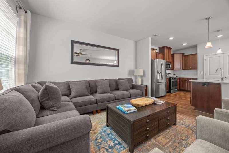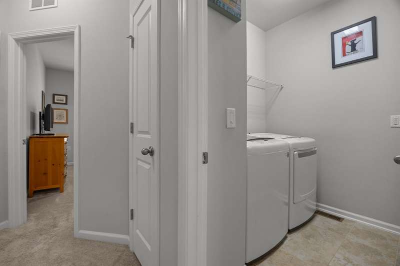 Looking for low-maintenance living with style and space? This bright and beautifully kept end-unit townhome in City Walk might just be the one! You'll love the welcoming covered front porch and all the natural light pouring in. Step inside to find gorgeous LVP flooring throughout the main level and custom trim details that add a touch of charm right from the entry. The kitchen is a total standout?with 42'' staggered cabinets, quartz countertops, a sleek tile backsplash, gas range, and a roomy double-door pantry. It opens right up to a spacious family room where you can cozy up by the corner gas fireplace. Upstairs, the primary suite is seriously impressive?plenty of room to spread out, plus a bathroom with dual sinks, quartz counters, tile floors, and a stylish walk-in shower. Don't miss the walk-in closet! There are two more good-sized bedrooms, a full bath, and a separate laundry room, all on the second floor. Other perks? 9-foot ceilings on both levels, hardwood stairs, a 1-car garage, and access to the neighborhood pool. Out back, enjoy peaceful evenings on your private patio facing the woods. And the location? Super convenient?just minutes to restaurants, shops, and major highways.