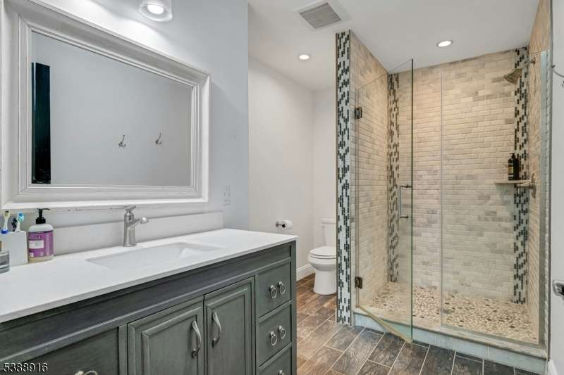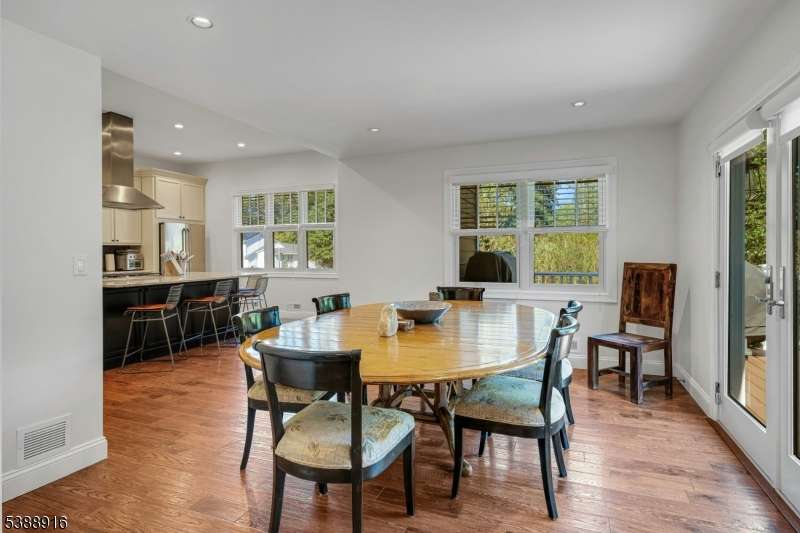 What a find...true no step ranch, beautifully updated, fabulous granite and stainless steel Chef's kitchen with walk-in pantry, a 'wow' center island breakfast bar, stone backsplash and copper farmers sink. Entertain with flair in the formal living rm w/fp and open concept dining rm with french door access to an oversized deck and patio overlooking a very private rear yard. The master bedroom private wing features master bedroom, fully outfitted walk-in closet, stunning master bath with soaking tub, double sink vanity and marble tiled master shower and bedroom 2/office. Additional 2 bedrooms, updated hallway bath, laundry room and mud room alcove plus garage access are located at the main level as well. The finished lower level features recreation room, playroom exercise area, office alcove, utility room and additional storage room with shelving plus an impressive 8' x 10' custom built, temperature controlled wine cellar closet. Neutral decor and updated throughout. Make this lovely home yours today!