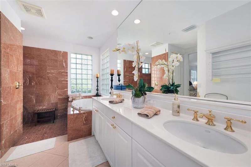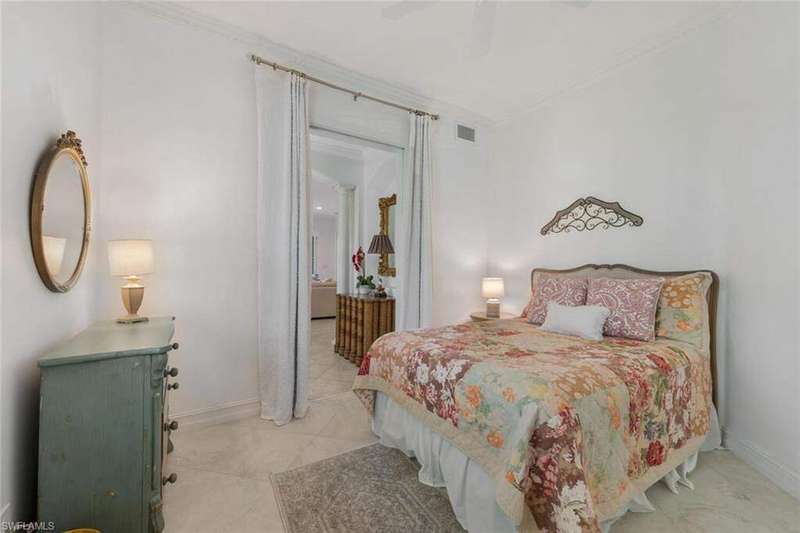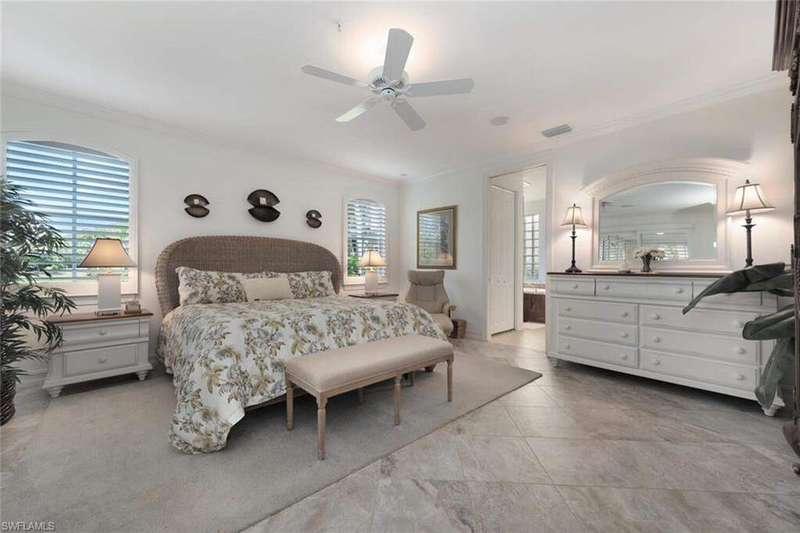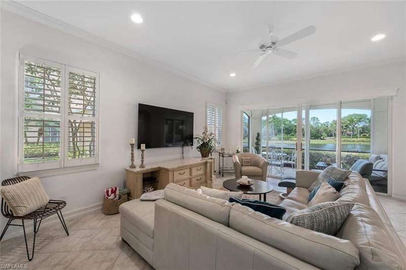 Discover refined living in this stunning first-floor condominium at Bolero at Tiburon, featuring three bedrooms, two baths, and picturesque western lakefront and golf course vistas. Elegant tile flooring flows seamlessly throughout the home. The gourmet kitchen impresses with rich wood cabinetry, granite countertops, modern appliances, and a convenient breakfast bar. Retreat to the luxurious primary suite, complete with a spacious walk-in shower, a separate soaking tub, dual vanities, and a generous walk-in closet. The condominium comfortably sleeps guests with two king beds and one double bed and includes a two-car attached garage for added convenience. Nestled within a private, gated tropical oasis of just sixty residences, Bolero at Tiburon offers exclusive access to a resort-style pool. Steps from your door, the legendary Greg Norman-designed championship golf course and the upscale Ritz-Carlton Resort Hotel await, along with the Medallion Golf membership for an unparalleled golfing experience. Enjoy all the delights of Naples, from pristine beaches to fine dining and shopping, just moments away.