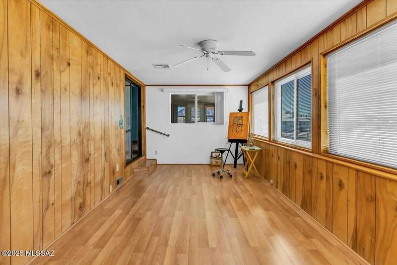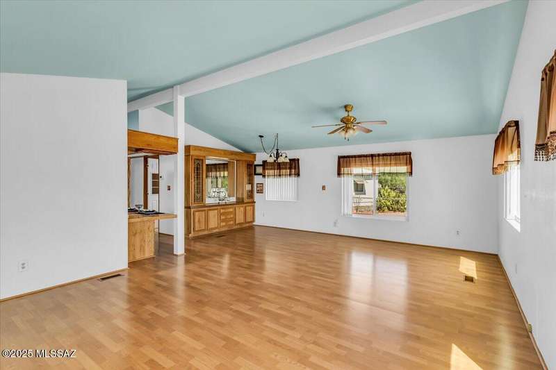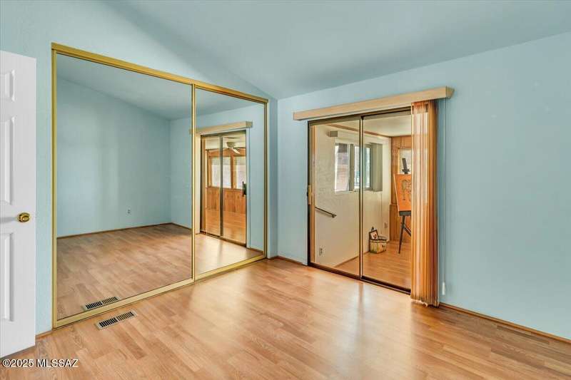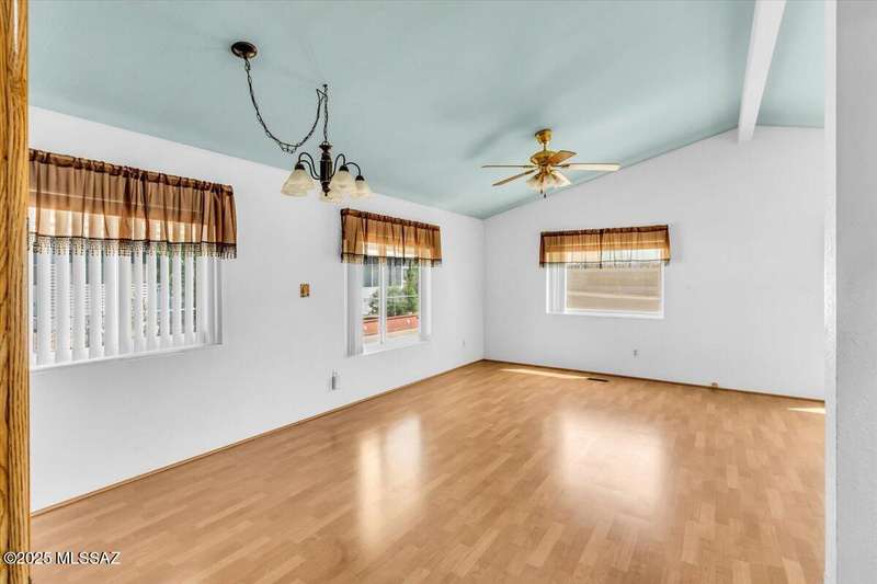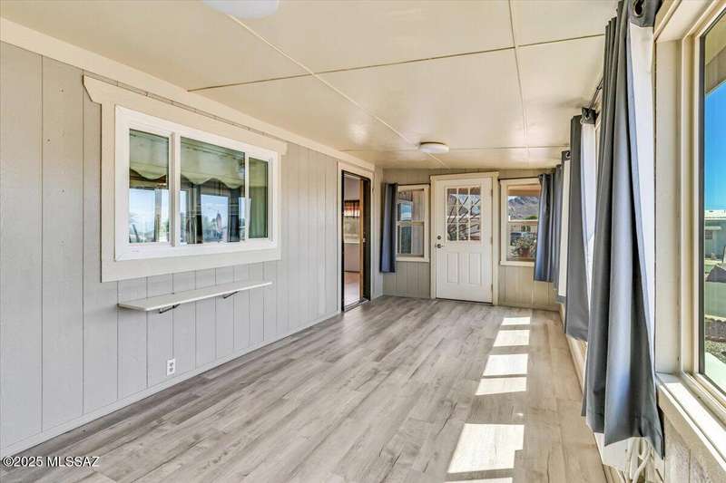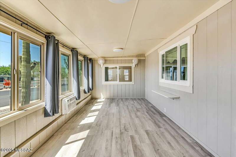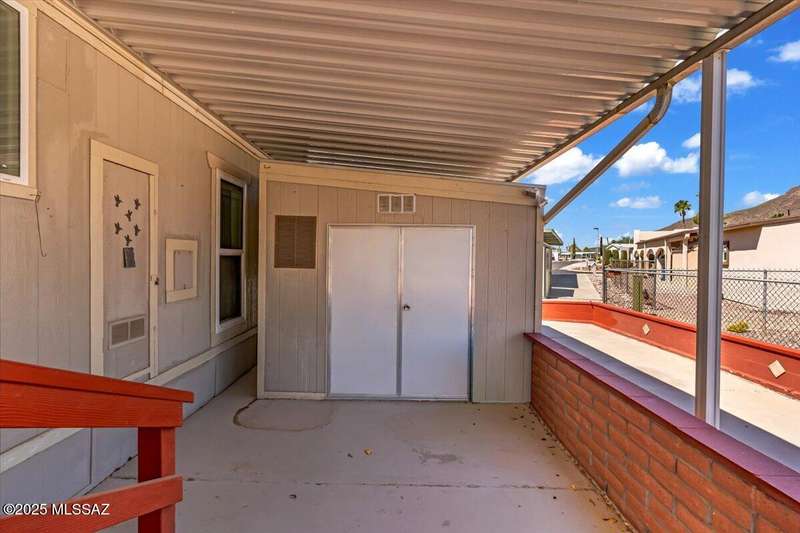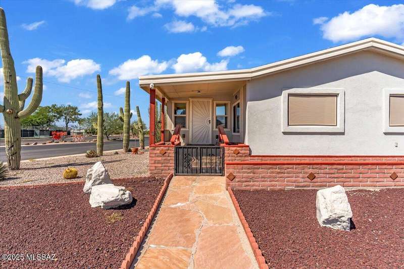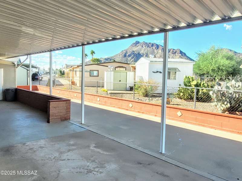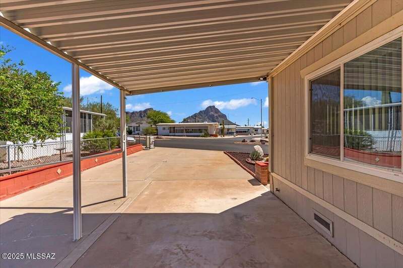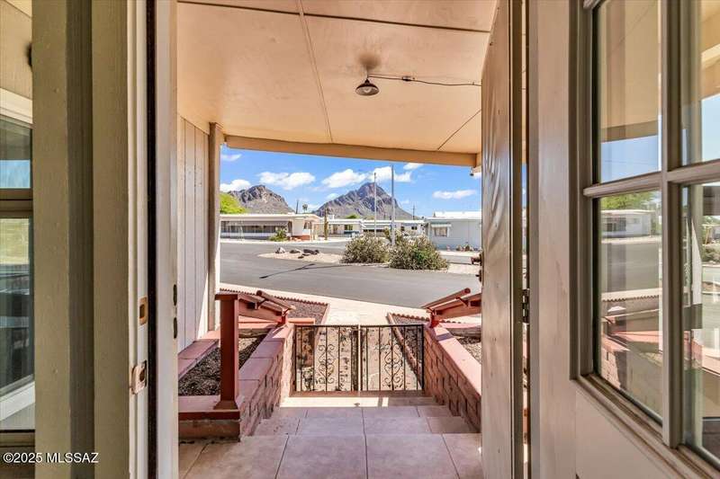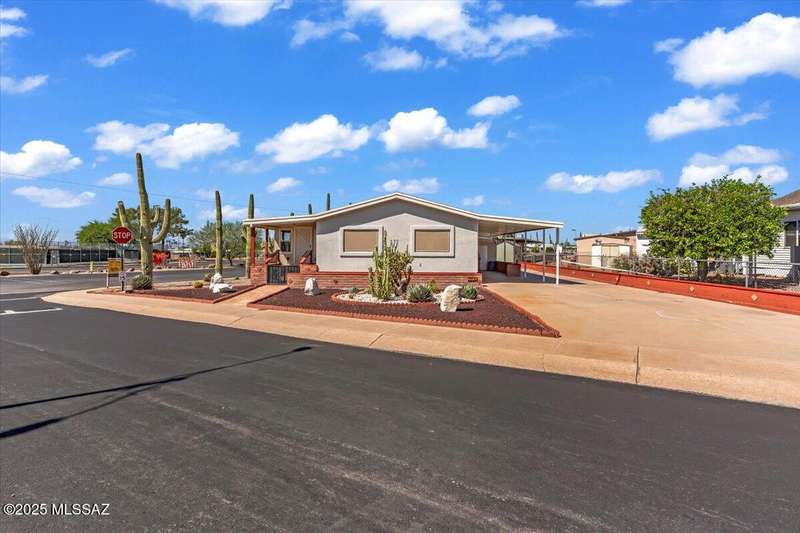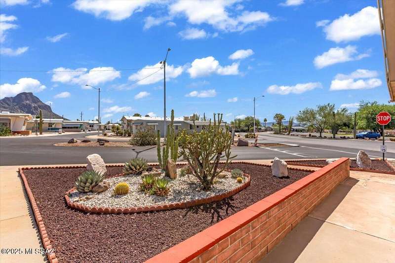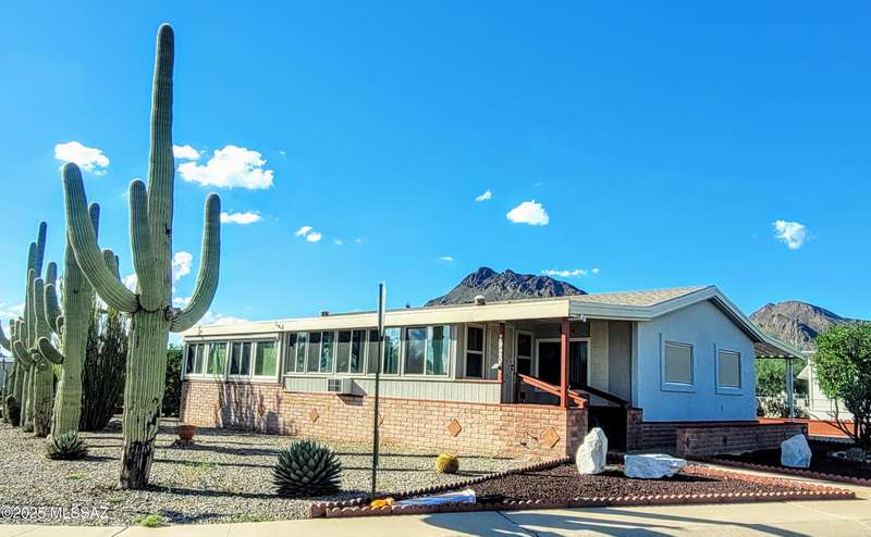 On a desirable corner lot, this charming home offers mountain views and a prime location directly across form the HOA facilities. Updated interior featuring newer windows that fill the space with natural light. The kitchen boasts modern cabinets, the hall bathroom is equipped with a walk-in tub. The primary suite offers a nice size with a wall of cabinets for abundant storage. Enjoy Arizona living year-round in the two separate heated and cooled Arizona rooms, perfect for relaxing or entertaining. The low-maintenance stucco exterior and two sheds- large enough for a golf cart garage. The property is part of a community with unlimited free golf and an impressive list of amenities, including two pools, a spa, a workout facility, shuffleboard, pickleball, tennis courts and you own the land.