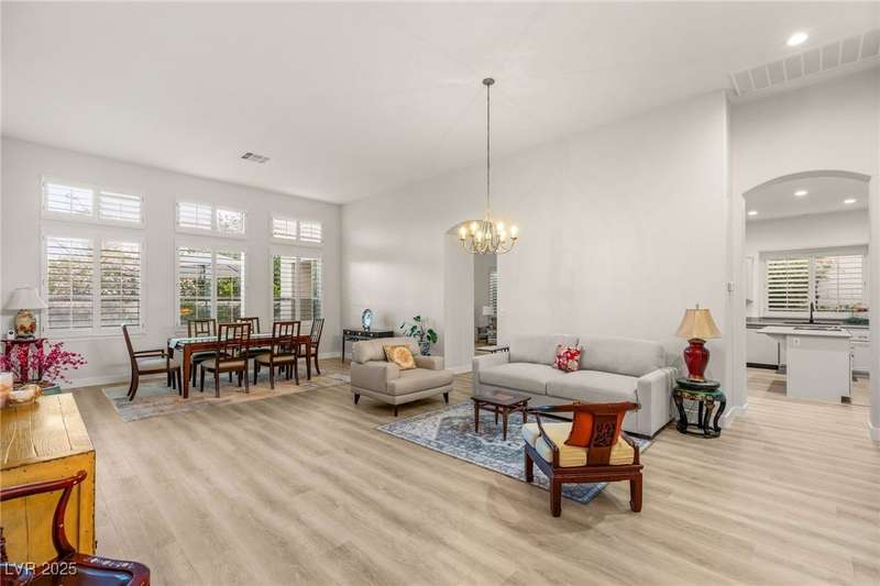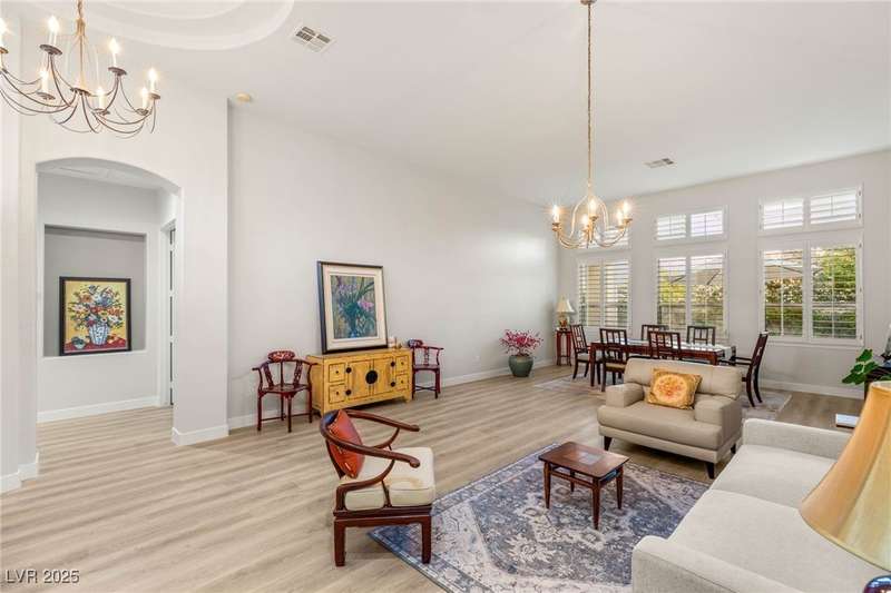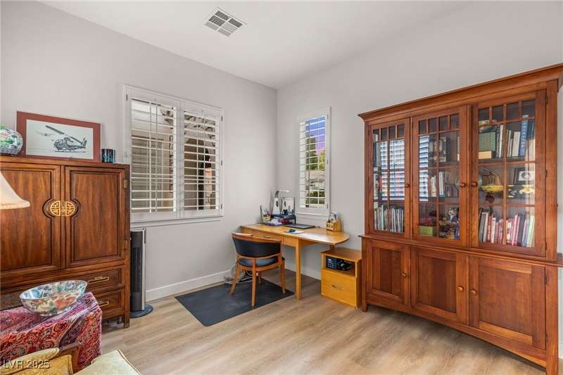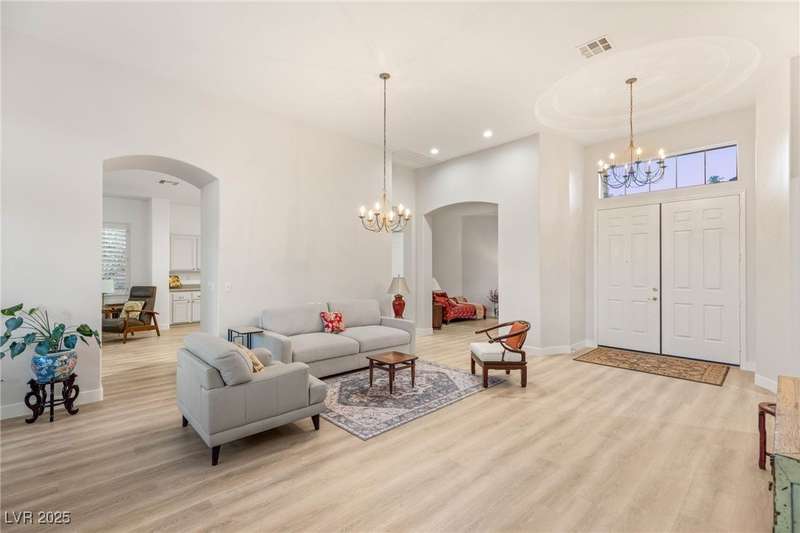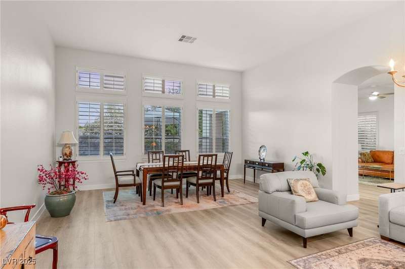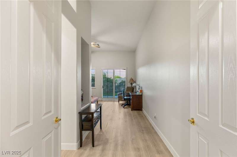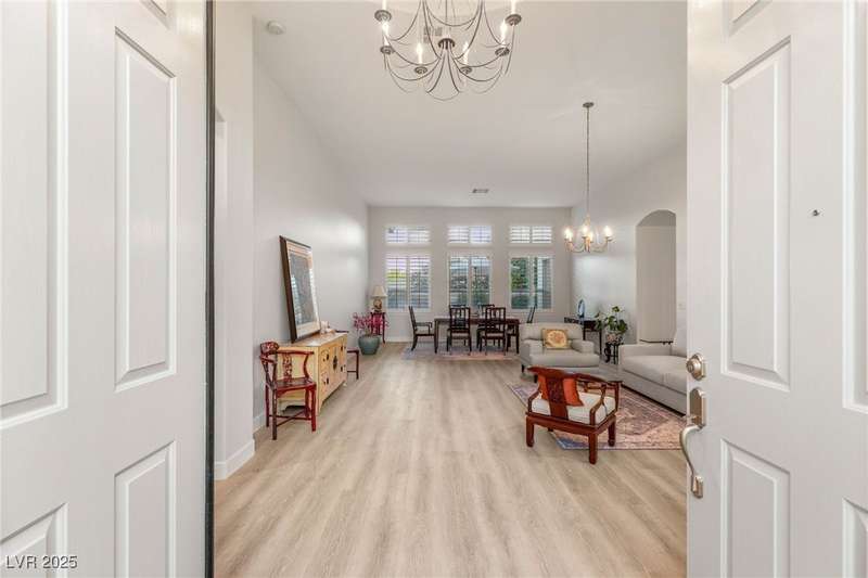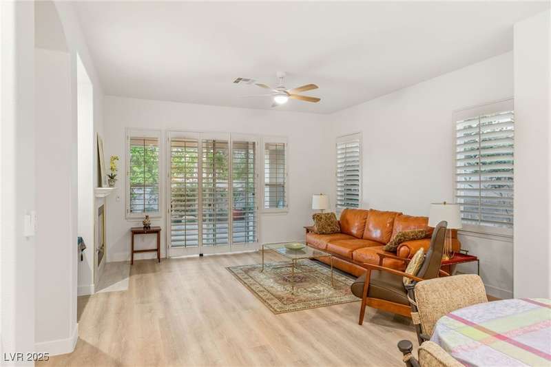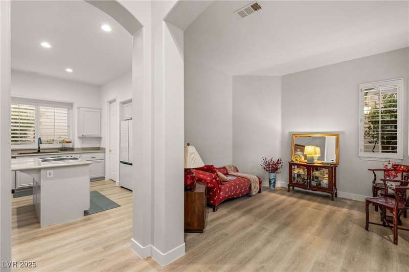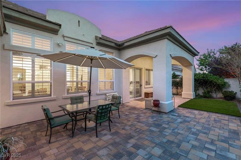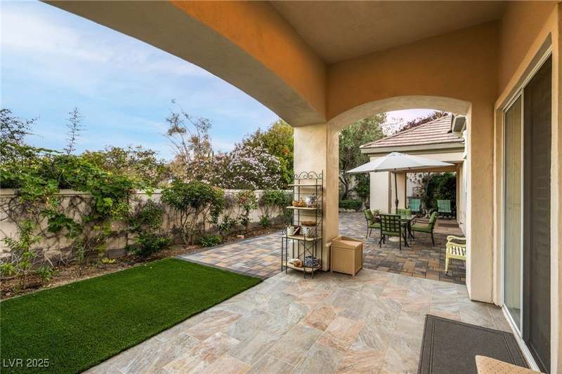 Remarkable, immaculate single-story home located in the prestigious guard gated community of Queensridge! Step through the fully enclosed private courtyard and into a home that perfectly combines elegance with modern upgrades. Recently painted inside and out, this bright open floor plan boasts brand new flooring, soaring ceilings, and windows with custom plantation shutters. The kitchen flows seamlessly into the living and dining spaces, while a spacious den/office adds flexibility for work or leisure. The primary suite is a luxurious retreat, highlighted by a newly remodeled spa-style bathroom with a freestanding soaking tub and oversized shower. Outdoors, enjoy your private oasis with double covered patios, upgraded landscaping, and pavers and patio flooring designed for year-round living. With fully remodeled bathrooms, refined finishes, and unmatched curb appeal, this home offers both comfort and sophistication—an opportunity to own in one of Las Vegas’s most coveted neighborhoods.