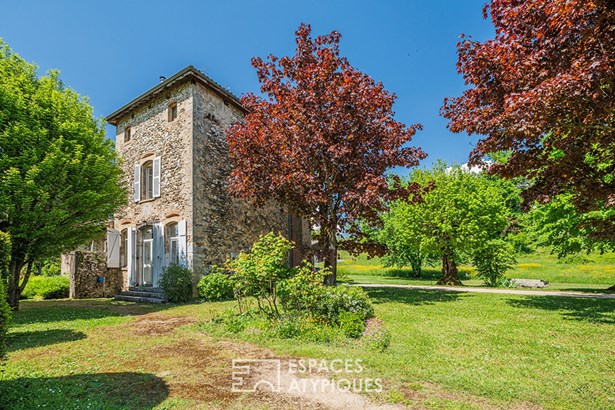 With the foothills of the Vercors as its horizon, enveloped in its intimate park of 7,800 sqm, this property steeped in history is a romantic and unique place. Located in the plain of Saint-Marcellin, a 12th century fortified house, passed down and modified over the years, converted in the 19th century into a silkworm nursery with its now-disappeared spinning workshop, it is today a place of life, reception and transmission forming a remarkable estate with incredible potential. Developing over several buildings a surface area of nearly 650 m2, accompanied by equally exceptional exteriors, it exudes calm, serenity and authenticity. This remarkable complex, having undergone a major and careful restoration in the 90s, is divided into three significant places
