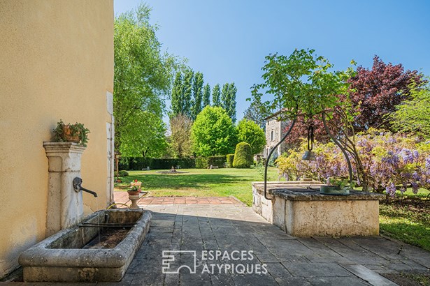 Majestically accompanied by its wooded park, decorated with its remarkable walnut dryer, its sheds with a barbecue area, its pond, its terraces and its spring, this estate offers multiple spaces conducive to reception, conviviality and relaxation. At the entrance, once past the large gate, a vast grassy area also allows the parking necessary for any reception project.