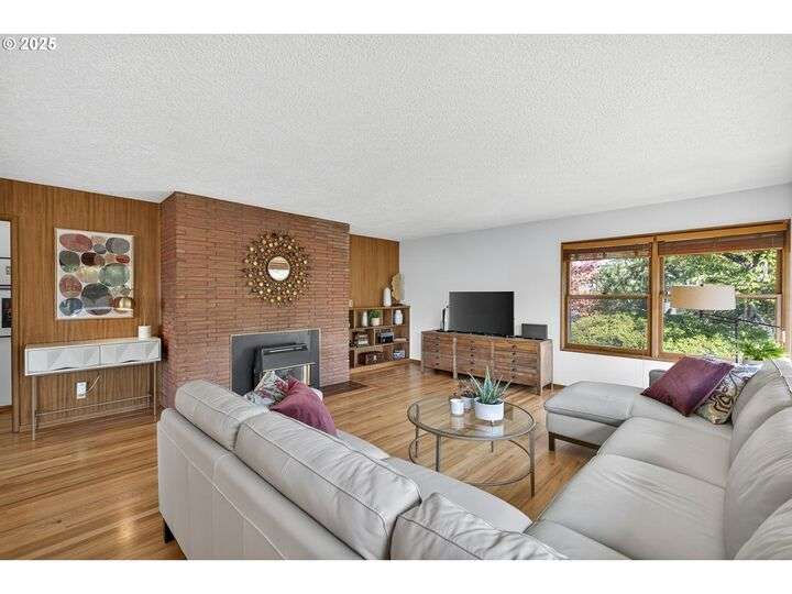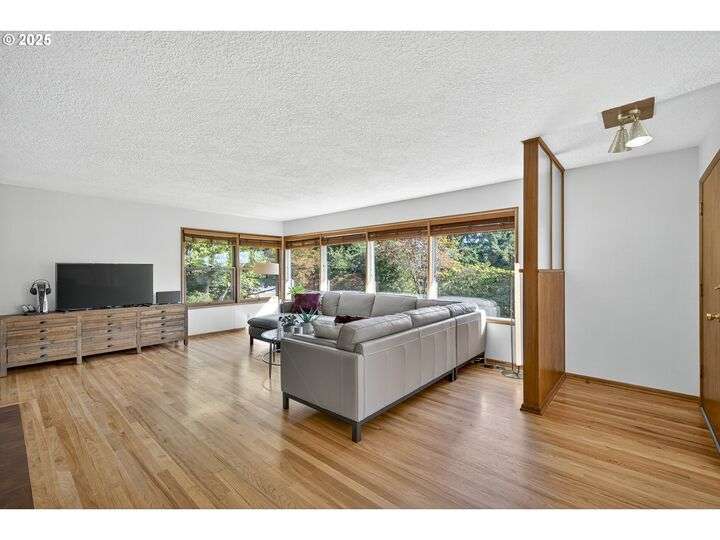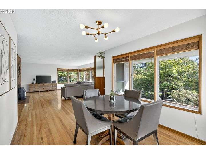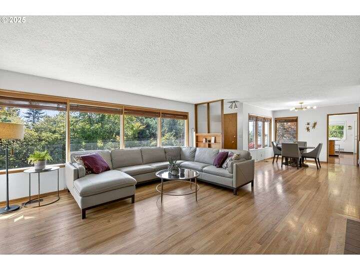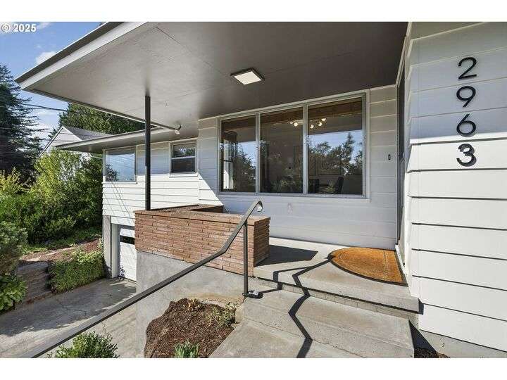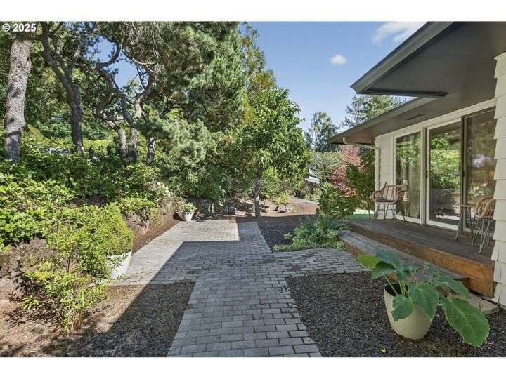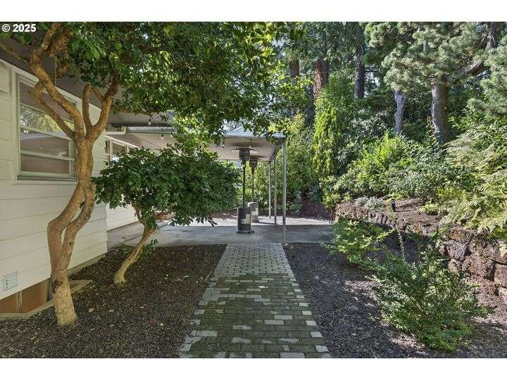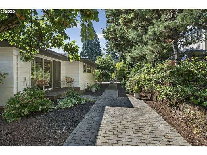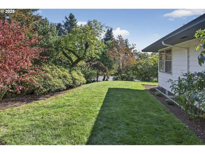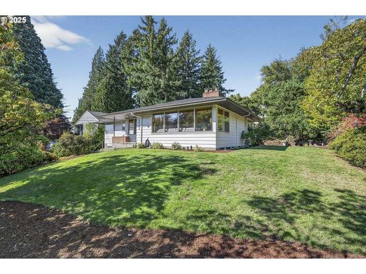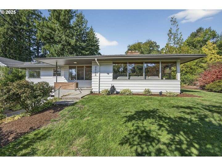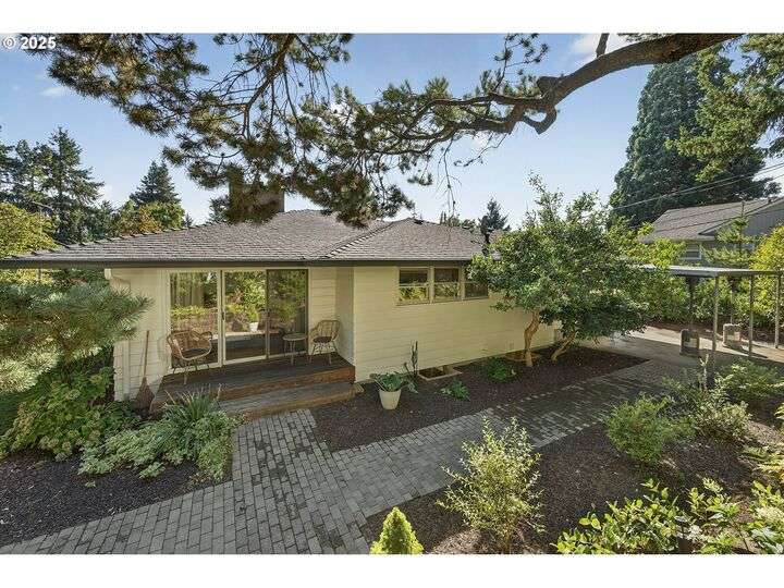 There's so much to love about this mid-century gem in Portland's sought-after Hillsdale neighborhood! Set up off the street, on a corner lot w/ beautiful, mature landscaping on all sides, this home enjoys great privacy and natural light. The living room is unlike any other. It's incredibly spacious, w/ fun, mid-century built-ins and design details, beautiful hardwood floors and lots of great, big, picture windows. The floor plan and positioning of this home is pretty perfect, too. The main floor puts living, dining and kitchen at the front of the home with 3 bedrooms and a full bathroom in the back and easy access to the backyard and patio from the kitchen and one of the bedrooms. Every window enjoys attractive views of the mature, variegated landscaping that surrounds the house. The light, bright lower-level has nice, tall ceilings and includes a big family room, 4th bedroom, 2nd full bathroom and great storage. Well cared for over the years, with valuable system improvements and thoughtful updates aligned with mid-century character and design. Recent updates include: lower-level bathroom remodel (incl new plumbing, shower pan, shower tile, and vanity - '25), new main water line ('25), new electric water heater ('24), new electric panel ('24), EV charging outlet ('24), generator outlet ('24), and new sewer line ('22). The backyard features a spacious covered patio off of the kitchen for year-round use and enjoyment, a covered deck off of one of the bedrooms, blueberry bushes, a Japanese nashi pear tree, blooming camellia bushes and so much more! With its super central location, this home enjoys several, quick commute options into downtown, NW, Lake Oswego and Beaverton. OHSU is just up the hill and a network of quiet, forested, nature trails minutes away. [Home Energy Score = 3. HES Report at https://rpt.greenbuildingregistry.com/hes/OR10134883]