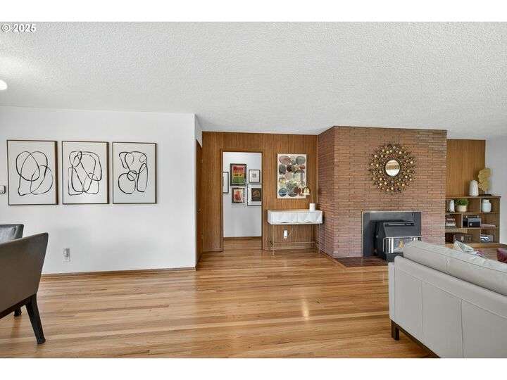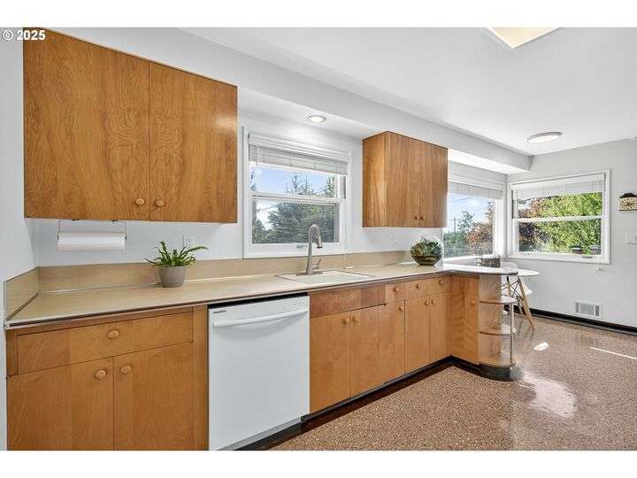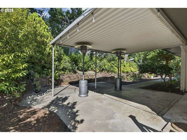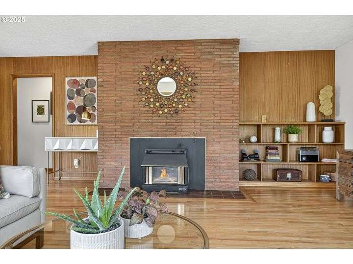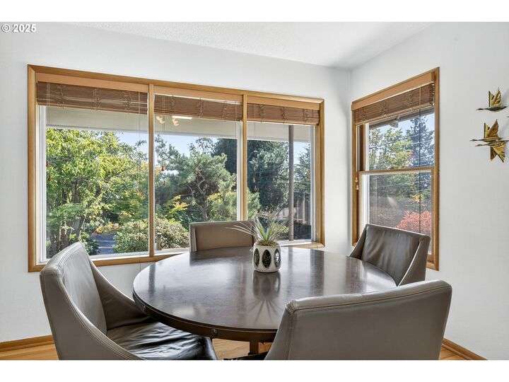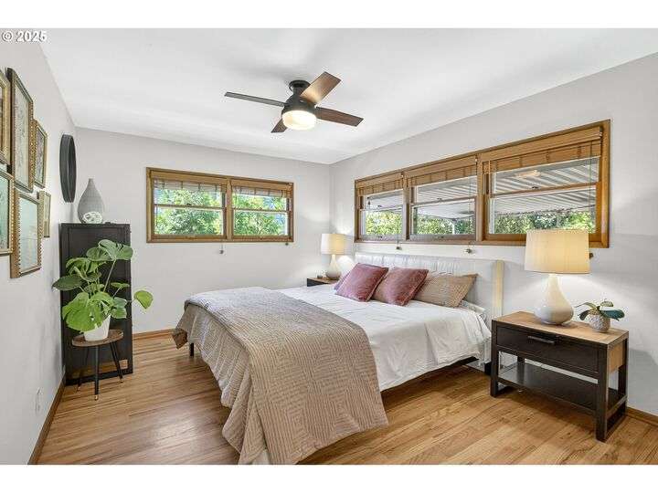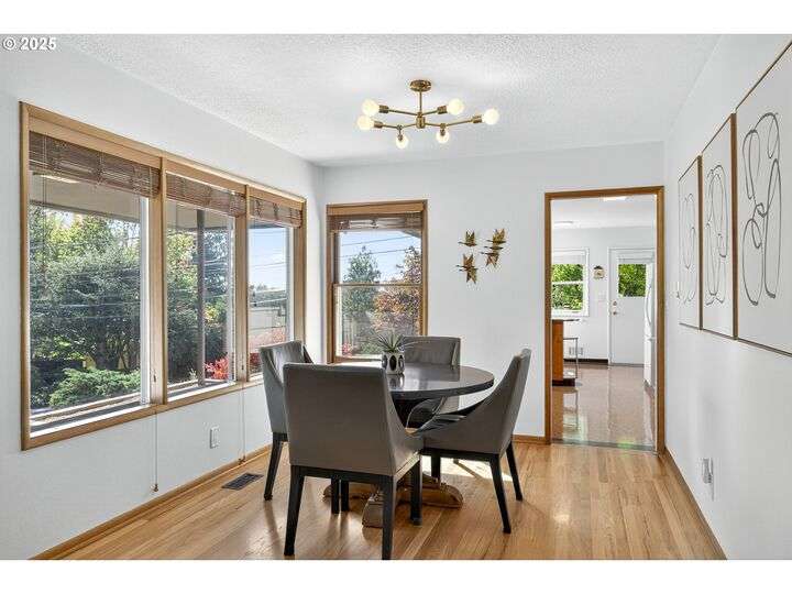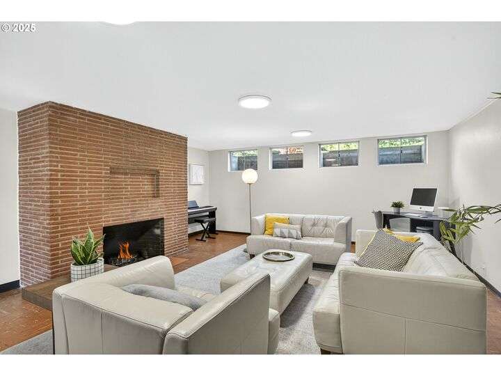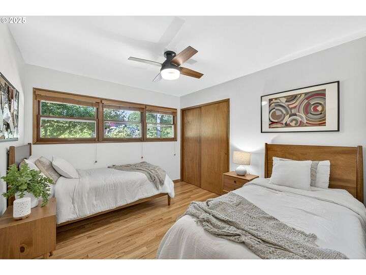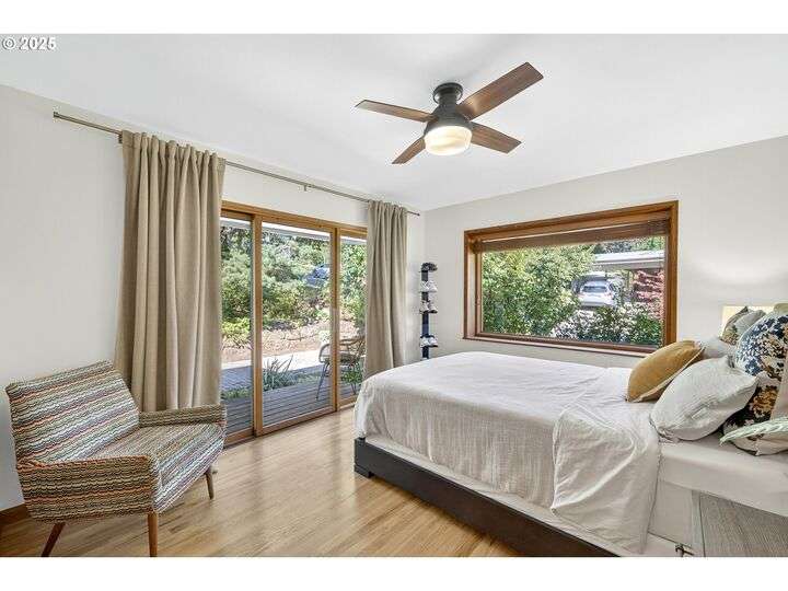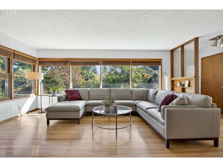 There's so much to love about this mid-century gem in Portland's sought-after Hillsdale neighborhood! Set up off the street, on a corner lot w/ beautiful, mature landscaping on all sides, this home enjoys great privacy and natural light. The living room is unlike any other. It's incredibly spacious, w/ fun, mid-century built-ins and design details, beautiful hardwood floors and lots of great, big, picture windows. The floor plan and positioning of this home is pretty perfect, too. The main floor puts living, dining and kitchen at the front of the home with 3 bedrooms and a full bathroom in the back and easy access to the backyard and patio from the kitchen and one of the bedrooms. Every window enjoys attractive views of the mature, variegated landscaping that surrounds the house. The light, bright lower-level has nice, tall ceilings and includes a big family room, 4th bedroom, 2nd full bathroom and great storage. Well cared for over the years, with valuable system improvements and thoughtful updates aligned with mid-century character and design. Recent updates include: lower-level bathroom remodel (incl new plumbing, shower pan, shower tile, and vanity - '25), new main water line ('25), new electric water heater ('24), new electric panel ('24), EV charging outlet ('24), generator outlet ('24), and new sewer line ('22). The backyard features a spacious covered patio off of the kitchen for year-round use and enjoyment, a covered deck off of one of the bedrooms, blueberry bushes, a Japanese nashi pear tree, blooming camellia bushes and so much more! With its super central location, this home enjoys several, quick commute options into downtown, NW, Lake Oswego and Beaverton. OHSU is just up the hill and a network of quiet, forested, nature trails minutes away. [Home Energy Score = 3. HES Report at https://rpt.greenbuildingregistry.com/hes/OR10134883]