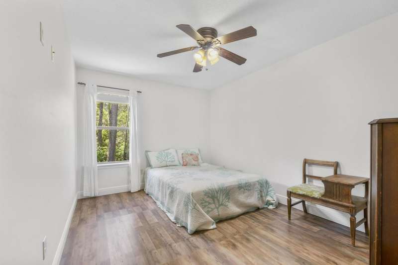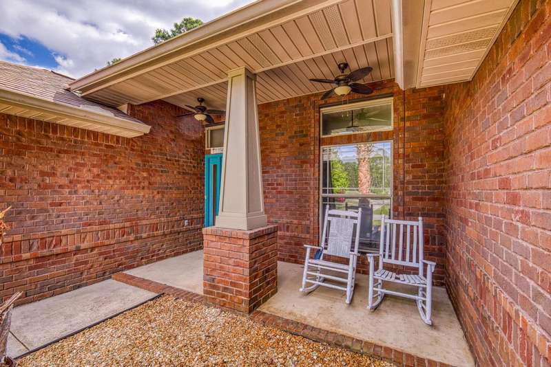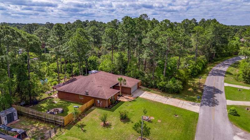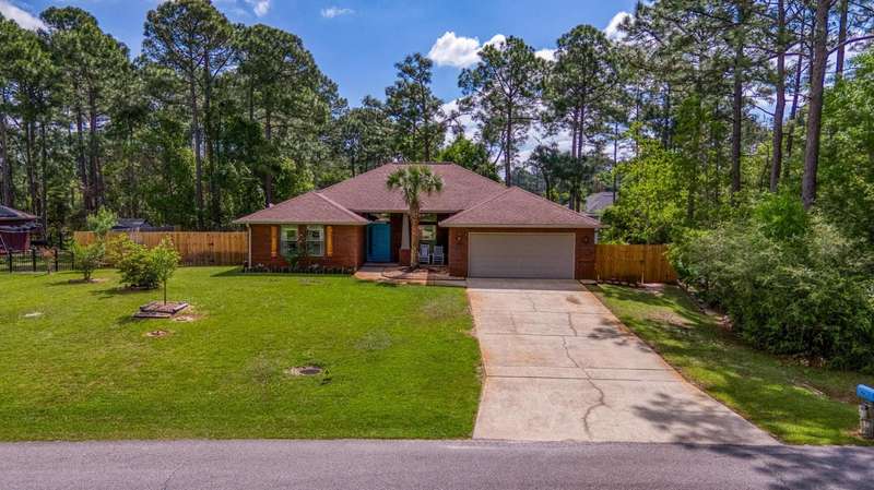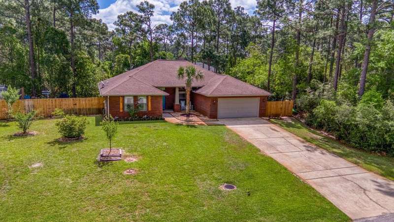 Discover tranquility in this meticulously maintained, freshly painted, all-brick residence nestled within the desirable Holley By The Sea community and adjacent to a lush wooded area just teeming with birds, flora and fauna. Built in 2010, this inviting home offers a perfect blend of comfort and privacy, ideal for those seeking a peaceful retreat. This home boasts 4 generously sized bedrooms - all with walk in closets - and 2 full bathrooms - both with double vanities, providing ample space for family and guests. A separate office, flex room or 5th bedroom offers the perfect environment for remote work, a quiet study or guests. Solid floors like vinyl plank and tile are throughout the home with the exception of the back bedroom which has new wall to wall carpet. You will be welcomed w ith a covered front porch with ceiling fan, a bright and airy entry foyer and high ceilings, but your eyes will be drawn to the back yard with its large covered patio, additional trellis covered hot tub and the natural beauty of a lush wooded back yard. There are roses, lemongrass - great to keep the mosquitos away - pear trees, blueberries and blackberries. There is also a large side lawn area with a fire pit and plenty of room for games and pets. Back inside - the kitchen features granite counter tops, tile floors, pantry, breakfast bar, large dining area overlooking the back yard and electric appliances. The main bedroom is HUGE and ensuite bath features cultured marble double vanity, separate shower, garden tub, water closet and walk-in closet. You will love the solid all brick exterior, gutters and hurricane shutters. Enjoy all of the HBTS amenities including the Multi-Million Dollar Rec Center with its pools, parks, tennis, pickleball, fitness center, ballfields, basketball courts, fishing pier, boat launch and waterfront RV Guest Rental Area, and still be close to Military Bases, Shopping, Restaurants and of course the Navarre Beach - voted one of the best, most relaxing beaches in the Country! Make arrangements to see this home today!