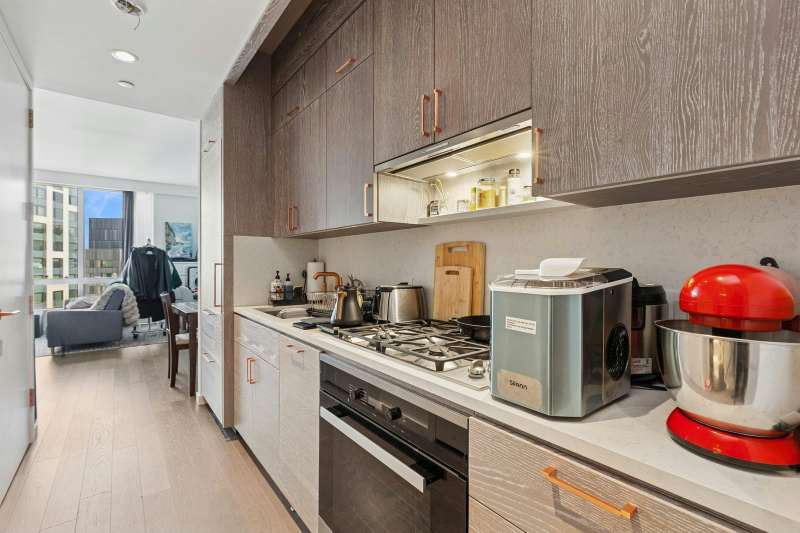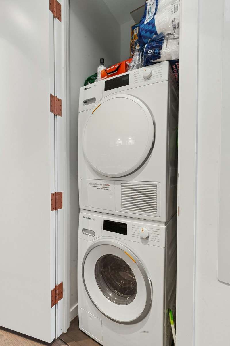 As walking in through the entry foyer, you will find one large walk-in closet, washer/dryer in unit and a custom tiled bathroom with radiant heat flooring, the custom waterworks fittings and the illuminated makeup mirror. The kitchen is equipped with white quartz countertops, waterworks custom faucet and premium Miele appliance package including integrated refrigerator, integrated dishwasher, gas cooktop, convection oven and speed oven.