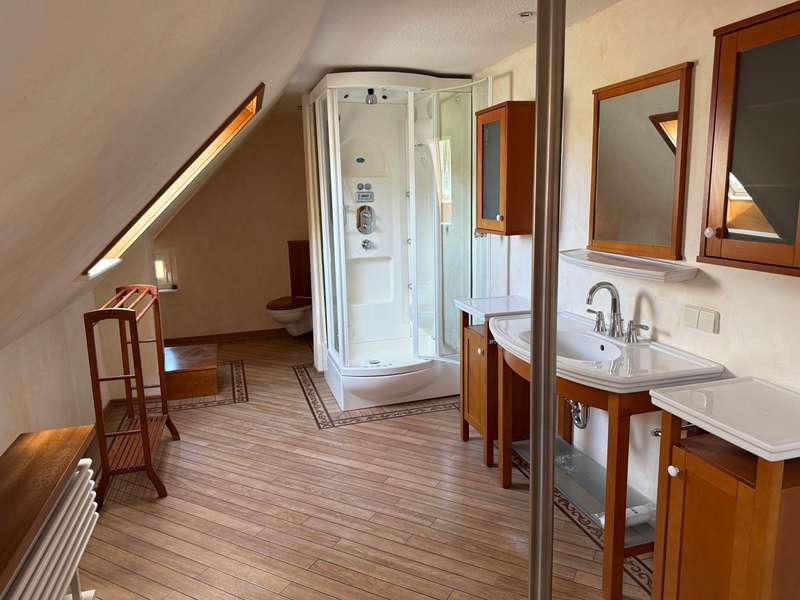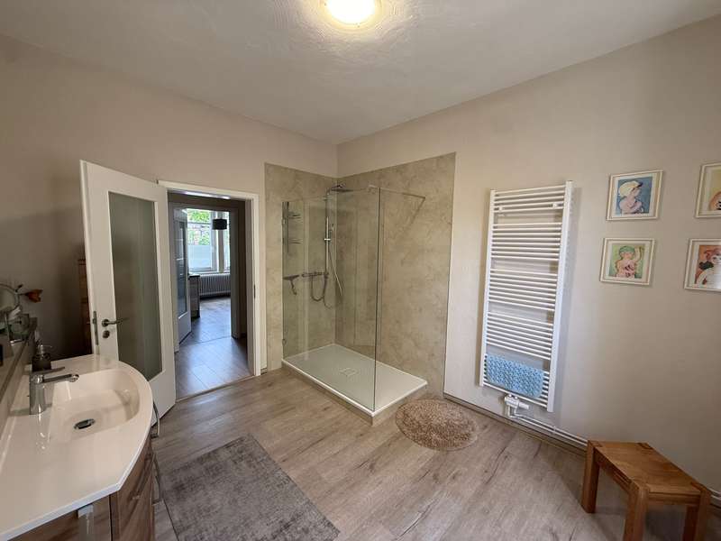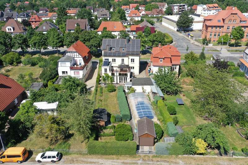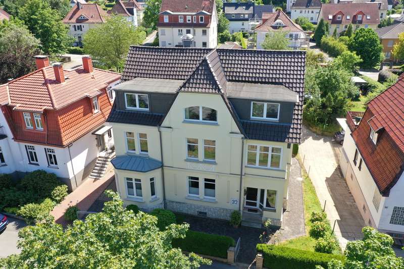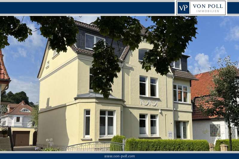 Welcome to a villa that offers a wide range of possible uses. Built around 1912 - in the Wilhelminian era - the villa combines historic old building flair with modern and contemporary technology and living options. Ideal for families, discerning couples, multi-generations or living and working under one roof. The villa has a total of approx. 281 m² of living space, which is divided between the first floor, second floor, attic and a small granny apartment. The area on the first floor used to be a doctor's surgery and was converted into living space, so that there is now a very nice and fully furnished residential unit with 3 rooms, kitchen incl. fitted kitchen and a modern bathroom with shower. The upper floor and attic are perfect for living in an extraordinary space. There is plenty of space here for a family or couples who want to live generously. There is a cute bay window room on the upper floor, which is perfect for relaxing or reading a book. There is also a spacious living and dining area with adjoining fireplace room, kitchen including fitted kitchen and a bathroom with shower. Stucco elements and a stucco rosette in the living room create the atmosphere of an old building. An absolute highlight is the sunny roof terrace with a view of the garden and pool area. Sitting here in the evening - reviewing the day and enjoying the sunny weather - a little dream. Then there is the top floor with a room, bedroom with walk-in dressing room and sauna as well as the master bathroom with wellness shower and wellness bathtub. The floors are connected by a historic real wood staircase. There is also a basement area with various rooms offering plenty of space for storage, two garages, a carport, garden shed and much more. The beautifully ingrown garden with the covered pool offers ideal conditions for relaxing and unwinding and conveys a Mediterranean feeling. We could write a lot more about this impressive villa and its spaciousness - just come and view it for yourself. - We look forward to hearing from you and showing you around. Poll Finance will be happy to assist you with financing.