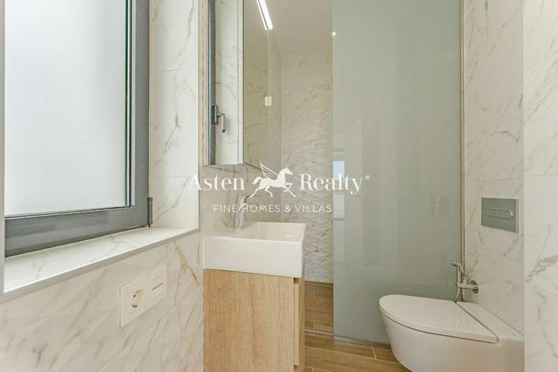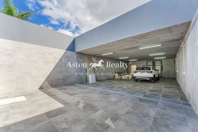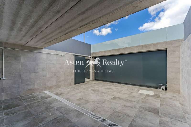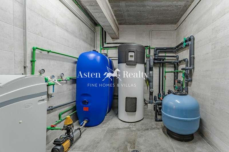 The main level has a huge living room with an open plan kitchen and a guest toilet, which leads out onto a large covered terrace overlooking the pool, prepared for the installation of counter-current and heating. Outside there is a garden of 40 m2 and preparations for the installation of a jacuzzi, outdoor shower and outdoor kitchen. There are irrigation channels all around the perimeter.