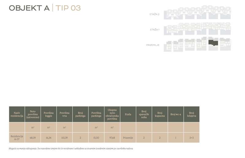 Apartment A-T03 - ground floor - living area 68.39 m2 (2 bedrooms + 2 bathrooms + toilet) + balcony (16.34 m2) + garden (110.39 m2) + 2 x parking (2 x 15 m2); total net calculable area 97.68 m2 = 498,168 EUR