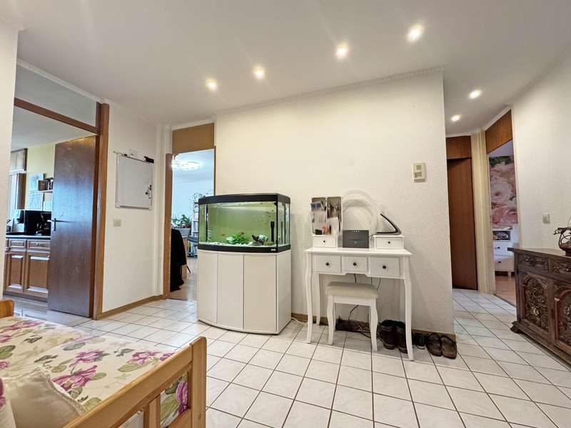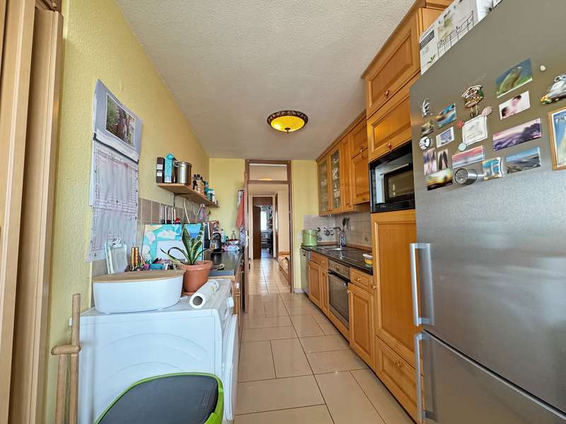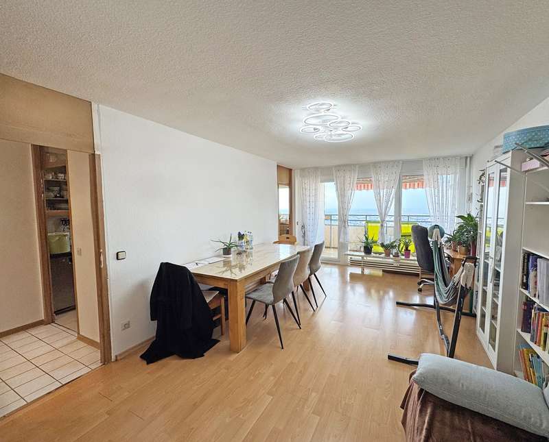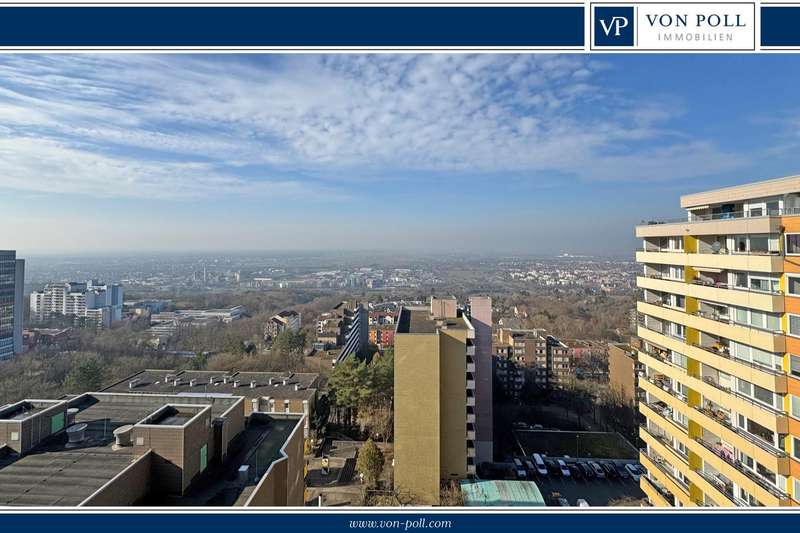 This well-maintained apartment with a living space of approx. 91 m² is located on the 13th floor of an apartment building that was built in 1979. It is located in a quiet but well-connected residential area, which impresses with its advantageous room layout and practical furnishings. The apartment comprises a total of three rooms, including two bedrooms. The spacious living and dining area is characterized by its brightness, which is ensured by large windows with natural light. From this area, you have access to one of the two balconies, which is also equipped with an awning. The second balcony is accessible via one of the bedrooms and offers further opportunities to enjoy the outdoors. The kitchen is equipped with a functional fitted kitchen and offers sufficient storage space as well as space for all standard electrical appliances. A separate guest WC completes the offer, while the main bathroom is equipped with a bathtub and WC. The apartment is heated by central oil heating and meets the well-maintained standard with solid furnishings. Classic flooring has been laid in the living rooms and bedrooms, while easy-care tiles have been laid in the kitchen, bathroom and guest WC. A particular advantage of this apartment is the existing elevator, which provides convenient access to the floor. There is also a cellar room that offers additional storage space. An underground parking space is available for your vehicle, providing secure and convenient parking. The location of the apartment impresses with its easy accessibility to shopping facilities, public transport, schools and kindergartens. The surrounding area is characterized by a well-developed infrastructure and short distances to all important facilities for daily needs. Thanks to the well thought-out layout, the apartment is suitable for both couples and small families and ensures a pleasant living atmosphere. For further information or to arrange a viewing appointment, please do not hesitate to contact us at any time.