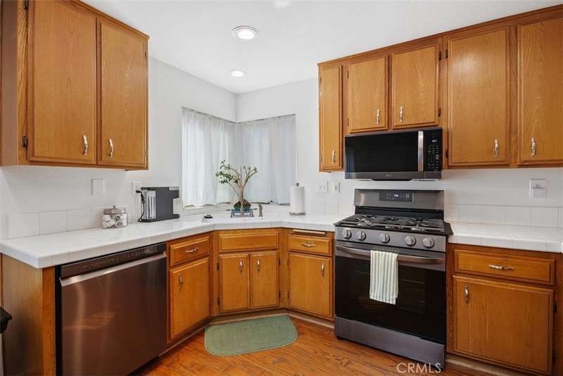 The kitchen is a cook's delight, featuring warm wood floors, tile counters, and all LG stainless appliances, including a five-burner gas stove, microwave, and dishwasher. A window over the sink frames the backyard, bringing in natural light and a touch of nature as you prepare meals. Kitchen is open to the family room (currently used as a dining room). The formal dining room is currently being used as a sitting room. Just off the entry is a convenient half bath with granite counters, thoughtfully updated for style and function.