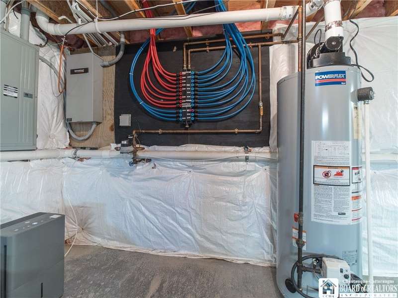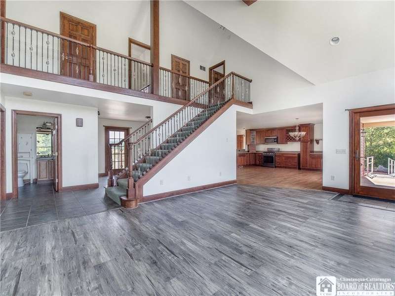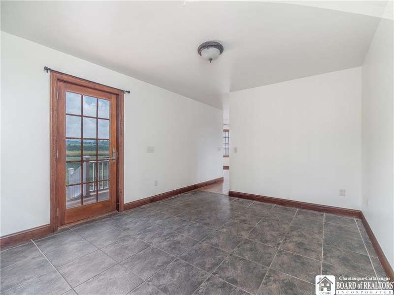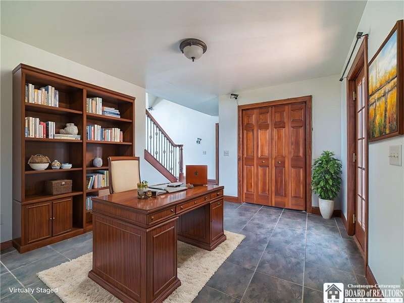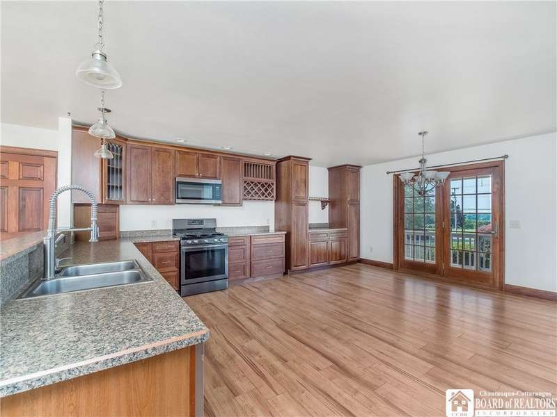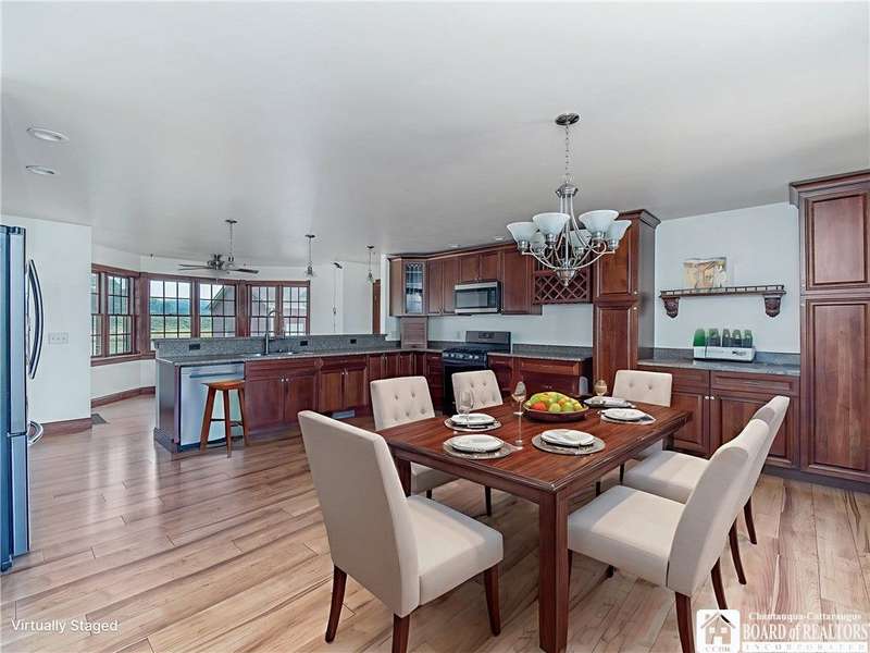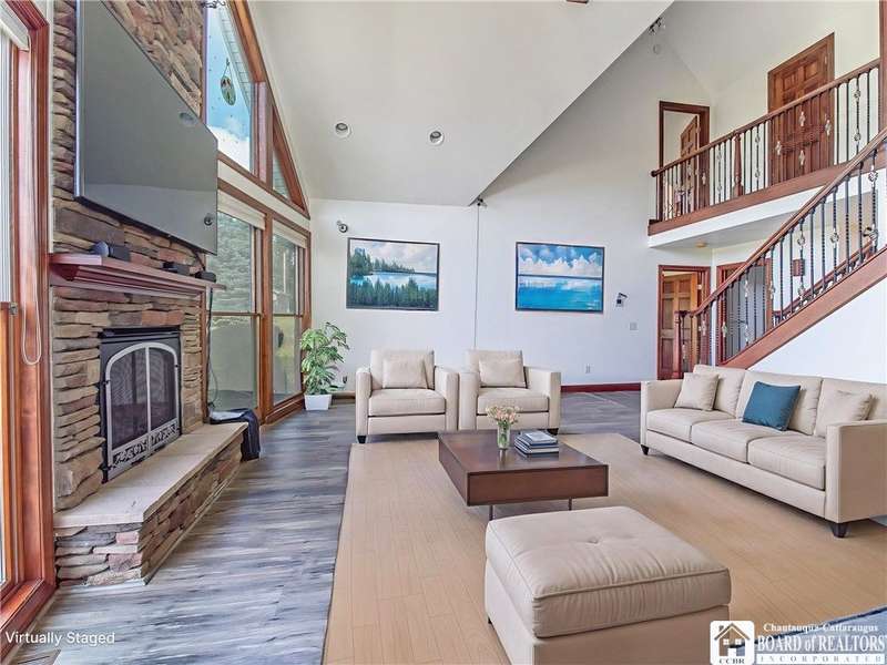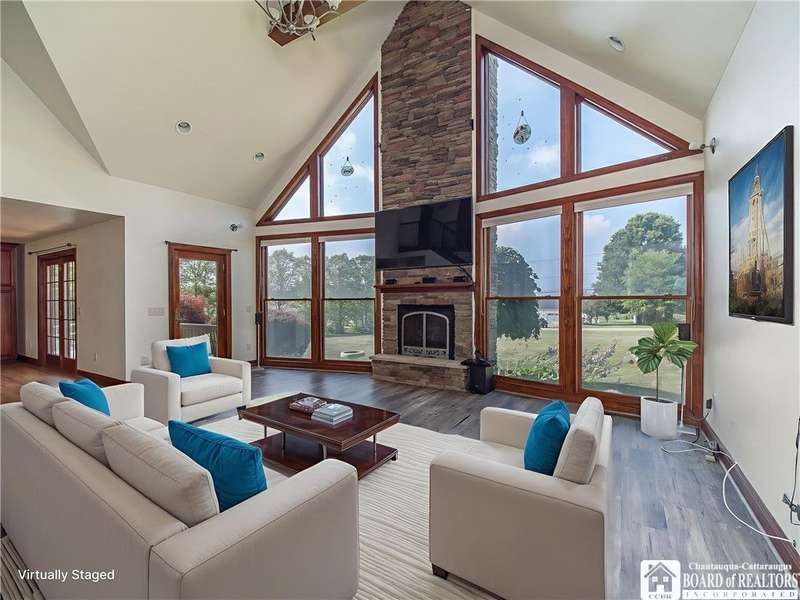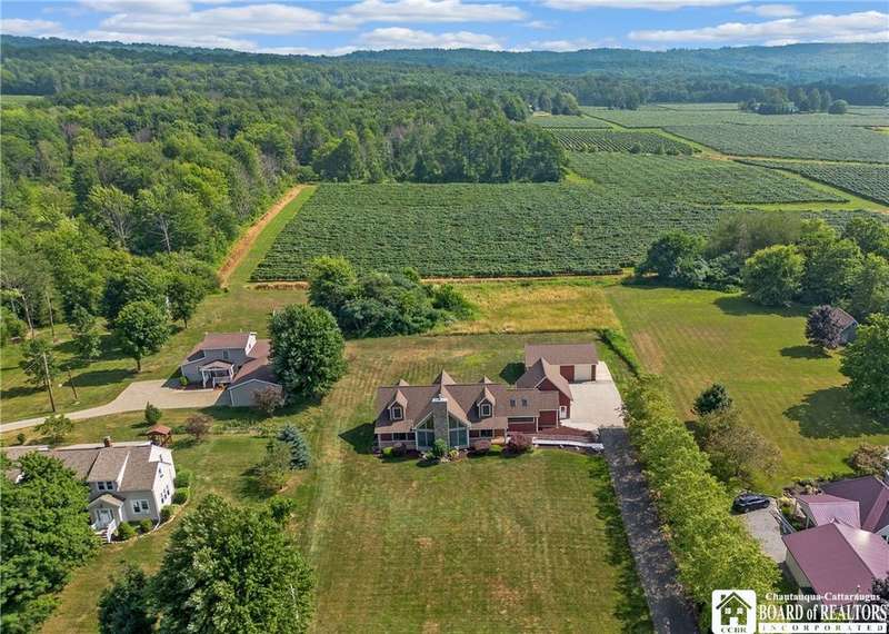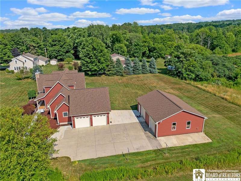 Curb appeal and so much more! Set on over an acre with scenic views, this thoughtfully designed home offers more than 2,600 square feet of comfortable living space. Step inside to panoramic windows, vaulted ceilings, and an open, airy layout. The living room features a stunning gas stone fireplace, surround sound, and a striking staircase.The first floor offers a large, functional kitchen with cherry cabinets, a gas stove, and plenty of storage. There's room for everyone to gather in the eat-in dining area, plus a breakfast nook with a view of the backyard and vineyards. The spacious primary bedroom includes private patio access, a walk-in closet, and an en-suite bath. Also on the first floor: a versatile den or office space?perfect for working from home?and a convenient half bath.Upstairs, you'll find two spacious bedrooms, each with built-in desks and generous closet space, along with a full bathroom and two hallway closets for extra storage.The full, partially finished basement adds flexibility, featuring two finished rooms ideal for a craft room and home office. A pool table and shuffleboard are included, making this a great space for entertaining or a family room.Additional features include an indoor swimming pool with jets and a resistance swim system, a rinse-off shower, and a half bath with laundry. The pool room includes a Lifebreath HRV system. Out back, enjoy the covered deck and peaceful vineyard views?a private setting for relaxing or entertaining. The property also includes an attached 2-car garage and a 30' x 40' detached garage?complete with heat, electric, a compressor, and a 30-amp RV outlet with a parking pad.Other highlights include central heat and air, a whole-house generator, an electric pet fence, and easy access to the snowmobile trail. You'll also enjoy being just minutes from local restaurants, shopping, antique stores, a seasonal farmers market, and more.All of this in the Village of Westfield?a great place to call home!