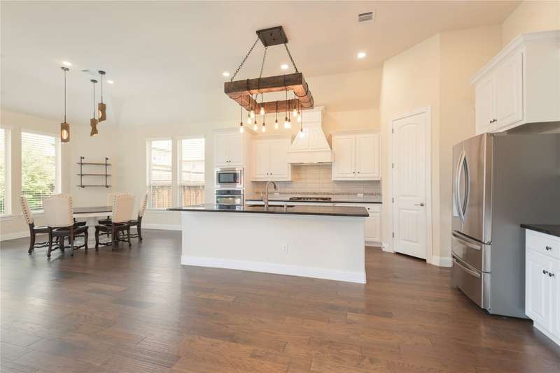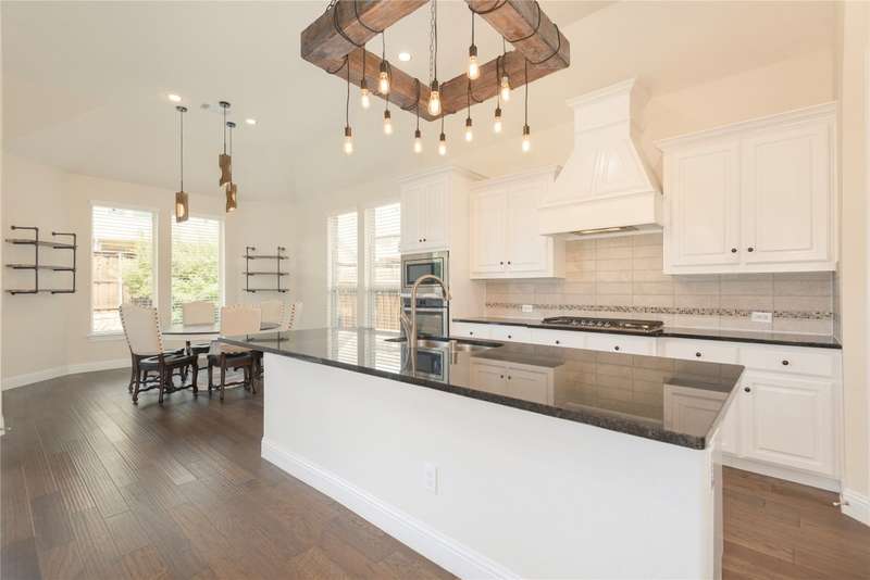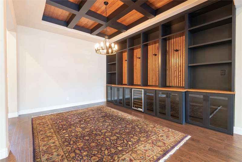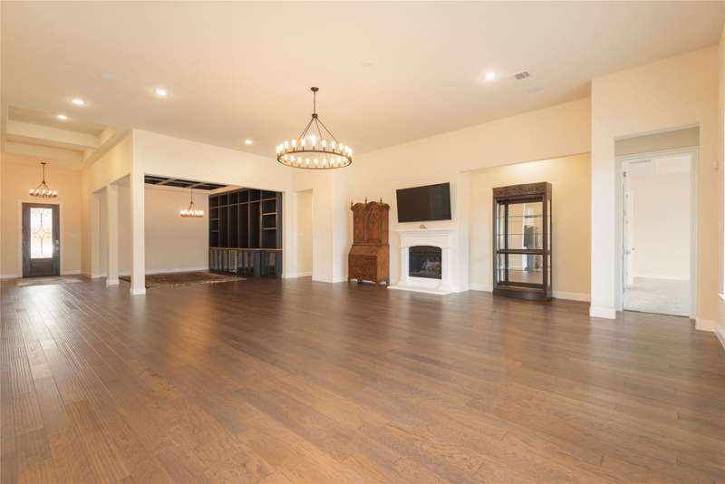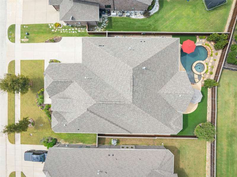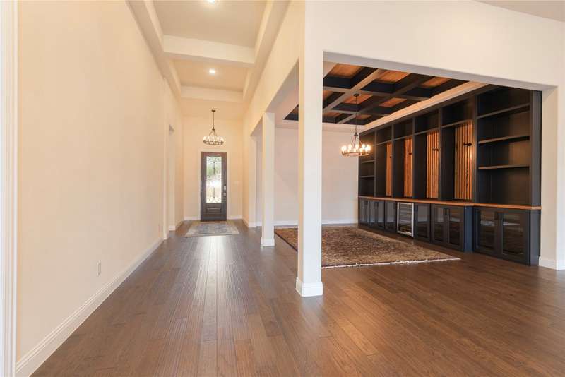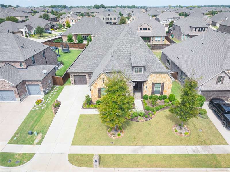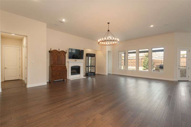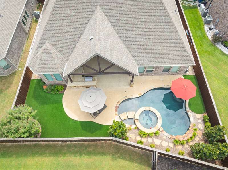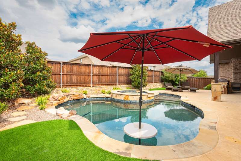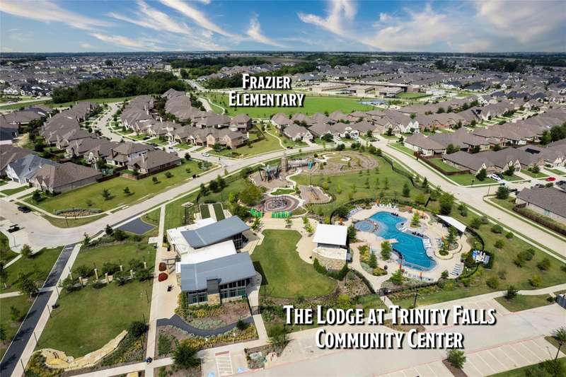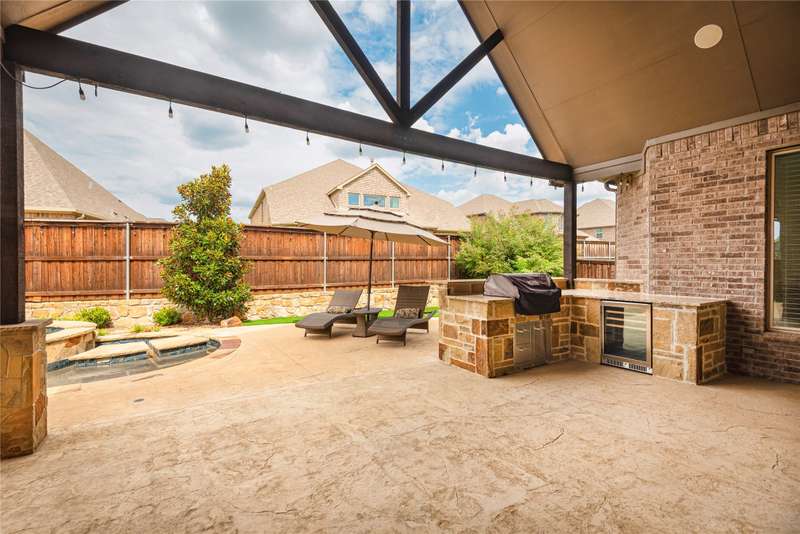 WELCOME HOME to this stunning, sought-after single-story retreat in the vibrant Trinity Falls community. This meticulously maintained home checks all the boxes with luxurious upgrades, smart design, and a private backyard oasis. Step inside to find a grand entry hall leading to the elegant Formal Dining Room, complete with a coffered ceiling, full wall of floor to ceiling lighted built-ins, beverage fridge, gorgeous chandelier, perfect for entertaining in style. Expansive Family Room features a centered gas log fireplace, furniture niche, wall of windows offering panoramic views of your private outdoor entertaining area with built-in BBQ and resort-style pool. Kitchen includes a massive breakfast island, abundance of cabinetry, walk-in pantry, stainless steel refrigerator, gas cooktop all next to the Breakfast Room. Engineered wood flooring flows throughout the main living areas, including the home office, while ceramic tile is thoughtfully placed in all bathrooms and the Utility Room. The Utility Room is both beautiful and functional, offering a full-size stackable washer and dryer, porcelain farmhouse sink, folding or craft table, window, and space for a freezer. The 3-car garage is spotless and upgraded with brand-new epoxy flooring, perfect for storage, hobbies, or simply protecting your vehicles in style. Outside, enjoy your own outdoor paradise featuring a covered patio, built-in grill, lush turf, and a sparkling pool with water feature and umbrella table. Cathedral patio with ceiling fan just perfect outdoor entertaining. Trinity Falls is a 2,000-acre master-planned community offering an exceptional lifestyle with 2 community pools, 2 clubhouses, a fitness center, Dog park, splash pads & multiple playgrounds, Fishing lakes & natural open space parks, Winding hike and bike trails, Disc golf course & outdoor amphitheater. Frazier Elementary School is located within the community. You'll be just minutes from the new H-E-B, and convenient access to US Hwy 380.