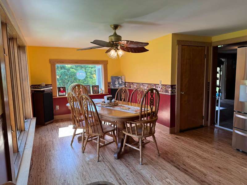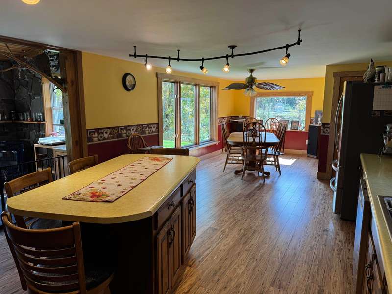 Privacy surrounds you on this open five-acre parcel, just minutes from the charming village of Johnson. The entrance, featuring a slate floor, opens into a spacious and bright kitchen with an adjoining dining area. This level also includes an office nook, a living room warmed by a cozy pellet stove, and the primary bedroom with an en-suite bath and a three-season porch. The second floor offers three additional bedrooms, a full bath, and a centrally located family room. An exciting bonus is a large, two-story barn, perfect for various creative projects. The beauty of the surrounding landscape truly must be seen to be appreciated.
