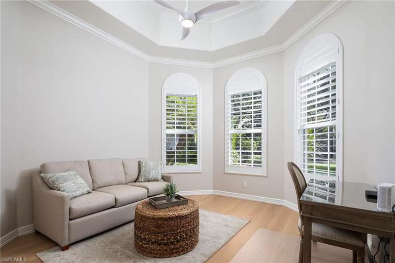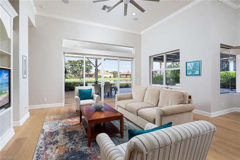 Step into an exceptional expression of luxury living within one of North Naples most sought-after country club communities. This meticulously renovated estate spans over 3,700 square feet of thoughtfully designed interiors, blending timeless architecture with the convenience of modern technology. Every element has been curated with precision between 2021 and 2025. The home showcases reimagined indoor and outdoor kitchens with premium appliances, quartz and granite finishes, and under-cabinet lighting. Flooring transitions seamlessly from rich hardwood in living areas to soft carpeting in bedrooms and elegant tile in baths. All bathrooms have been retiled with updated sinks, fixtures, and His-and-Her primary suites. Enhanced lighting, plantation shutters, and a custom entertainment center elevate everyday living. Impact-resistant windows and doors, wind-rated garage systems, new HVAC, water heaters, and roof with gutters ensure peace of mind. Smart-phone integration allows effortless c