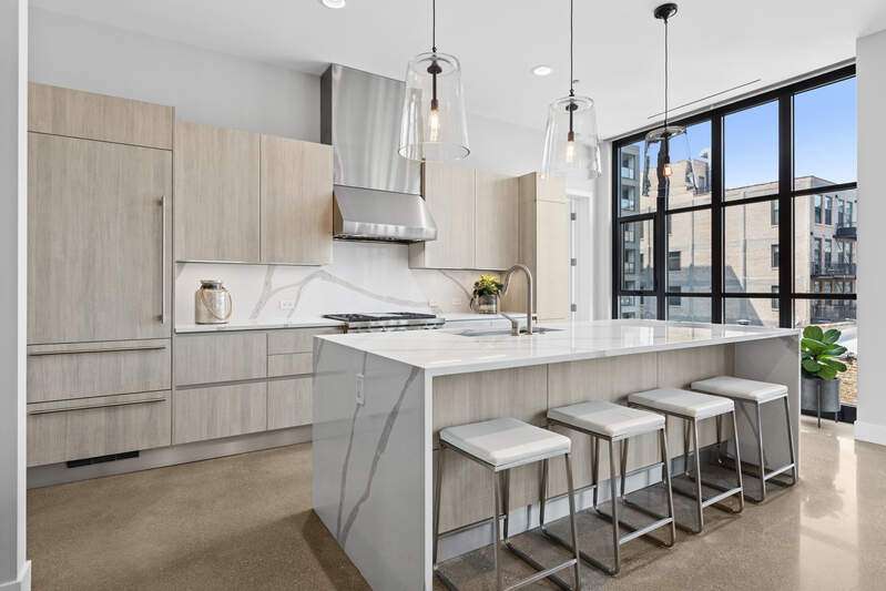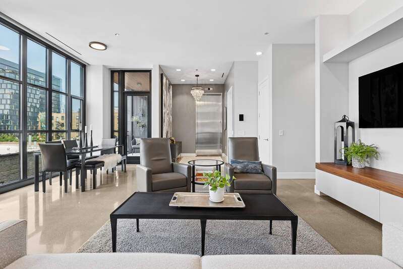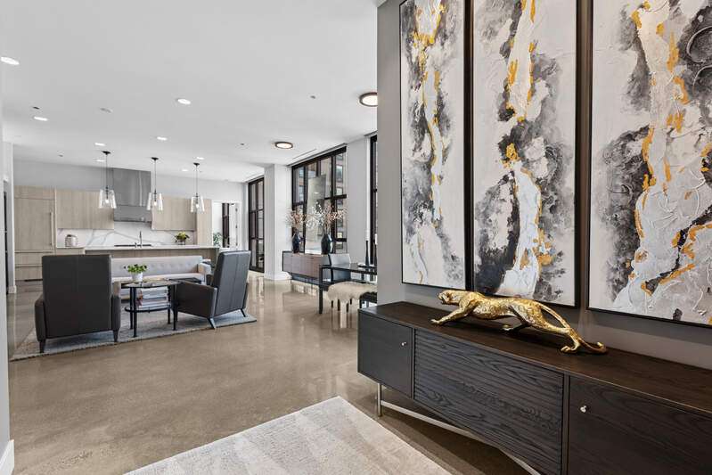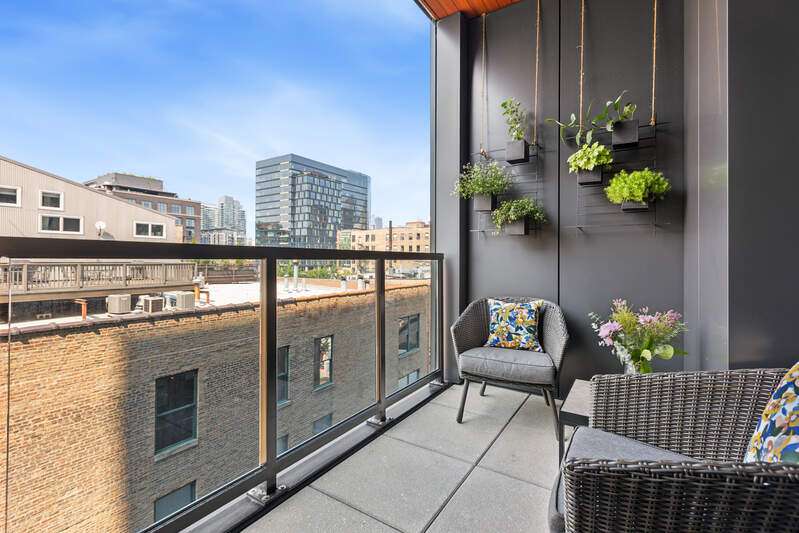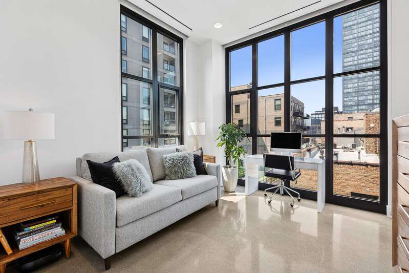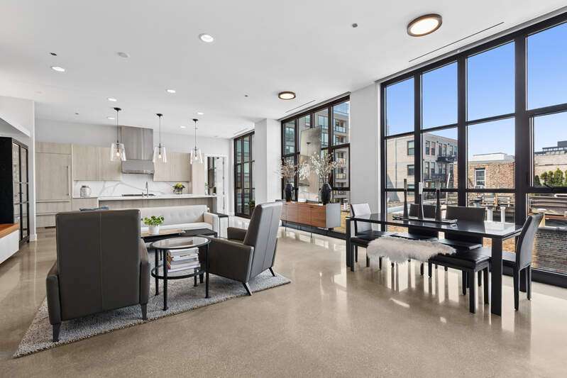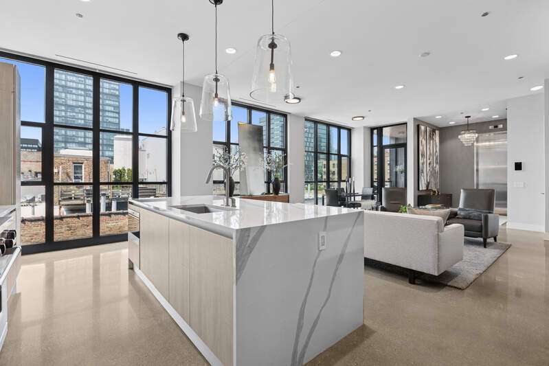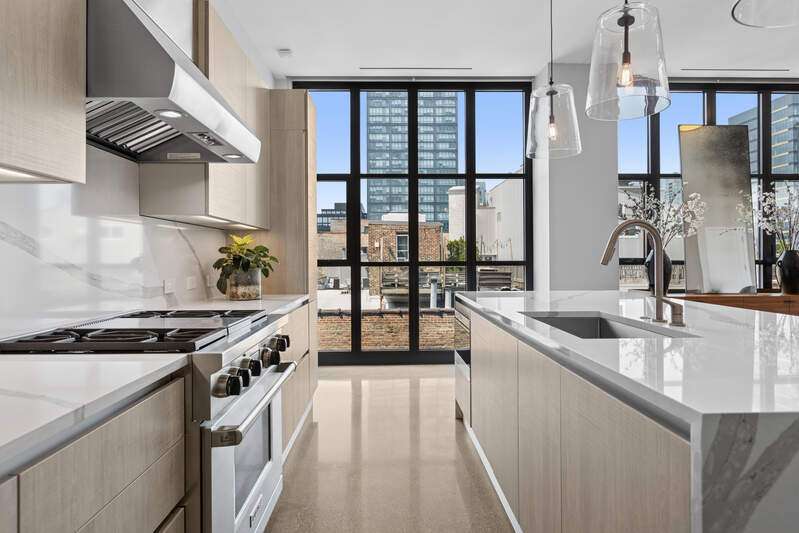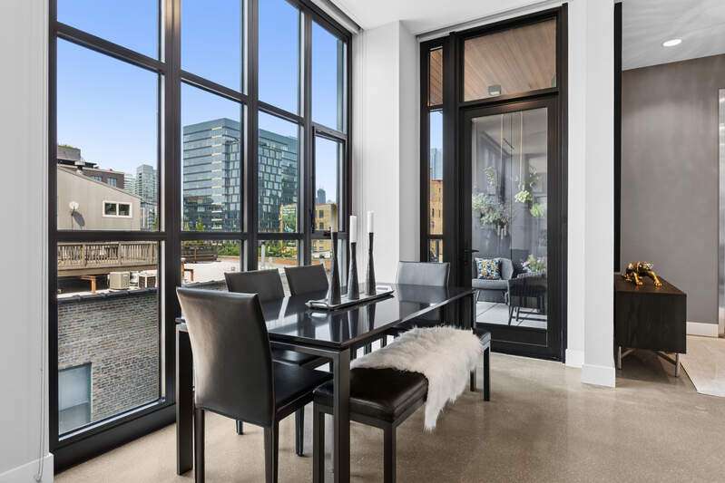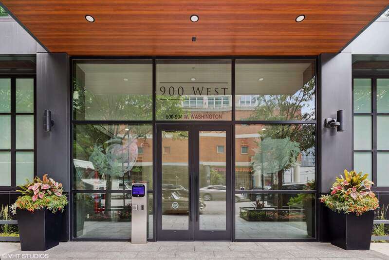 Experience refined, healthy living in this designer 2-Bed, 2.1-Bath residence at 900 West Washington - West Loop's Premier LEED Gold-Certified boutique building. Enter your home directly via a private elevator into a sleek, modern open floor plan with soaring 10'6" ceilings and radiant-heated polished concrete floors throughout. The space is bathed in natural light from floor-to-ceiling, sound-resistant windows and enhanced by upgraded lighting, creating a bright, serene atmosphere ideal for both everyday living and entertaining. At the heart of the home is a true chef's kitchen, outfitted with custom Italian Scavolini cabinetry, a premium Sub-Zero/Wolf appliance package, and a dramatic 10-foot quartz waterfall island with pendant and under-cabinet lighting. Two spacious pantries provide exceptional storage, while coordinating Scavolini media cabinetry in the living area adds both function and design continuity. Anchoring the living room is a custom fireplace wrapped in steel- an elegant, modern statement piece. The expansive living and dining areas open to an outdoor terrace featuring recessed lighting, a gas line for grilling, and views of the dynamic West Loop. The primary suite is a luxurious retreat with a custom walk-in closet and spa-grade en suite bathroom showcasing dual floating Scavolini vanities, integrated sinks, Hansgrohe/Axor waterfall fixtures, a frameless glass shower with Milestone surround and Cosentino tray, heated towel bars, and a LUM-lit Robern mirror. The second bedroom also boasts an en suite bath and custom closet. Additional highlights include an upgraded laundry room with full-size LG washer/dryer and built-in storage solutions. This is green living at its finest with MERV-13 filtration-delivering hospital-grade air quality, 75% green roof, energy-efficient features, radiant heated sidewalks, and parking available for electric cars. A garage parking spot ($50k) with capabilities for a 2-car lift complete this rare offering. This architecturally significant building features just 22 residences and is located in the heart of the vibrant West Loop-just steps from Fulton Market, Michelin-starred restaurants, designer boutiques, SoHo House, and Mary Bartelme Park.