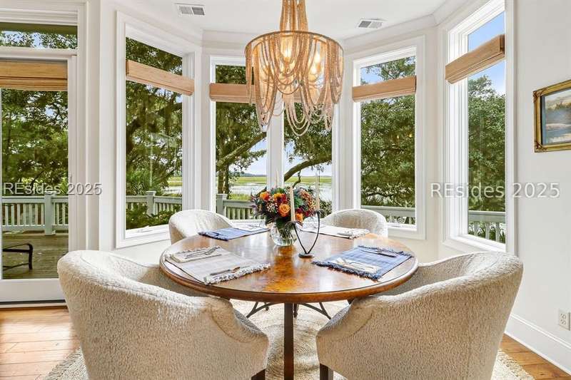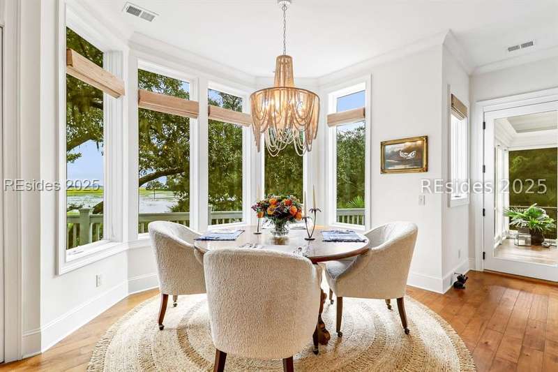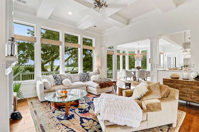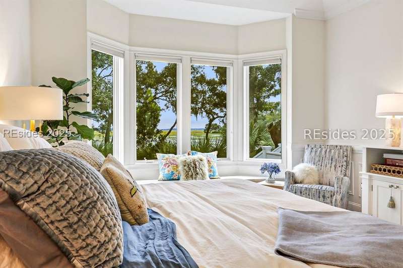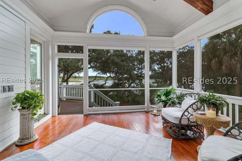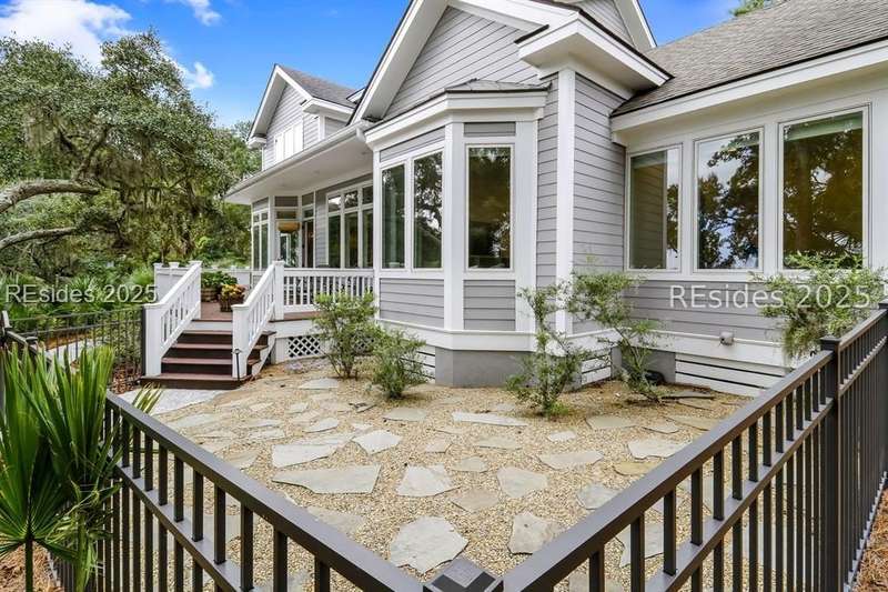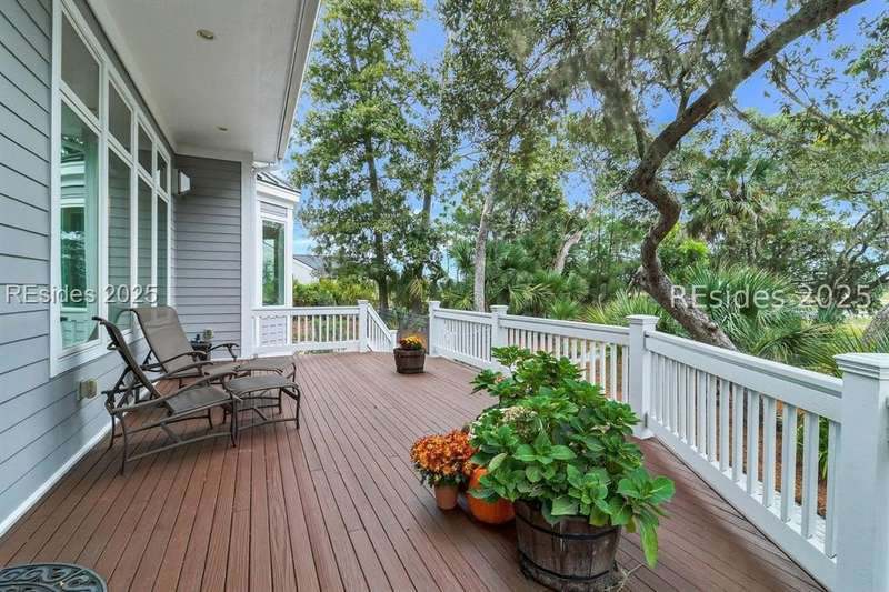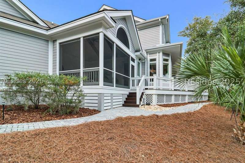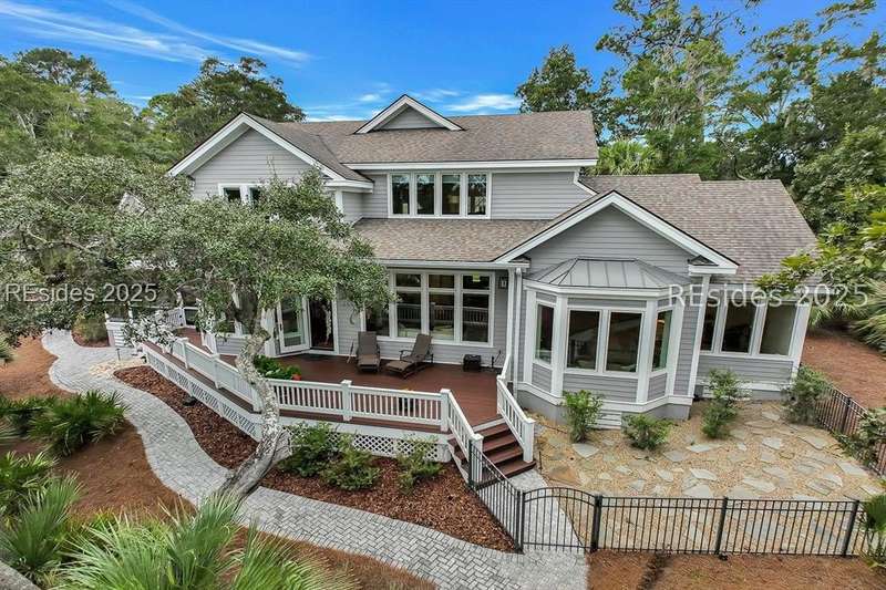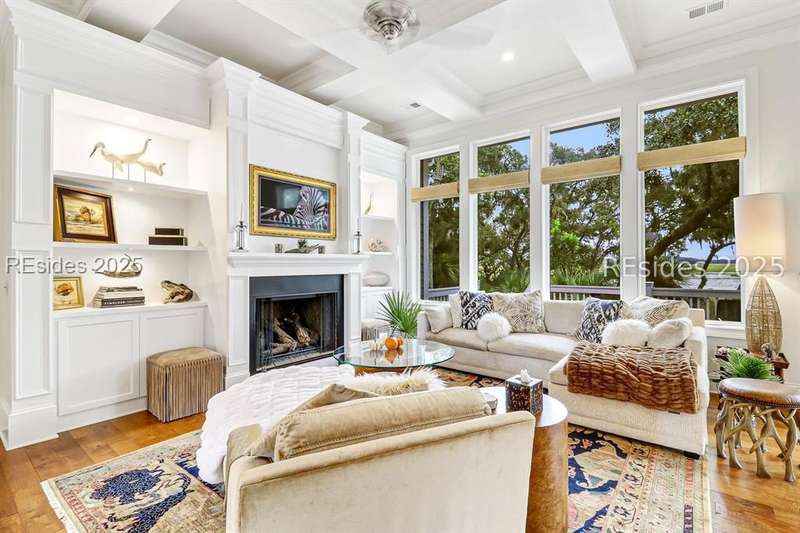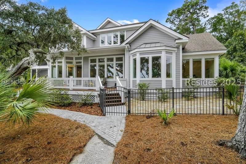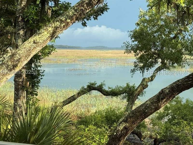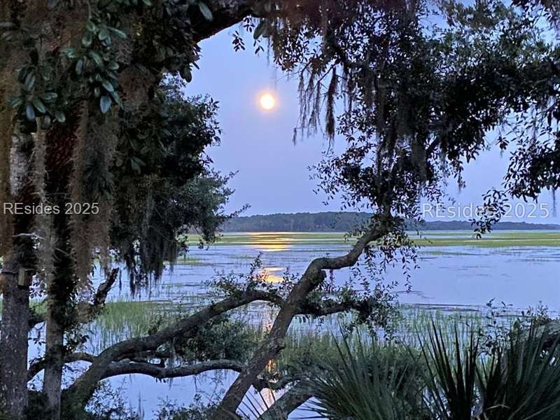 RARE OPPORTUNITY! Experience miles of panoramic tidal marsh & deepwater views with this 2015 built residence by renowned custom home builder in private, amenity rich Moss Creek. Interior features/recent improvements include wood flooring, 10-20 vaulted/tray/coffered ceilings, 8 interior doors, millwork & extensive built-ins by master craftsmen, granite counters, designer curated fixtures/hardware/lighting/window treatments, 2 gas fireplaces, walls of windows (w/transom windows) to view, stainless steel appliance package, spray foam insulation, imressive storage space including walk-in attic, closets & garage w/extensive built-ins. Very livable floor plan offers island kitchen open to dining & great room, walk-in pantry, much desired screened porch, bonus/media rm, office/den (4th BR), powder rm, laundry/mud room, ample/well-appointed guest BR suites & expansive/private primary suite with updated 5 Star bath, large walk in closet + multi-purpose flex room. Exterior offers attractive/durable Hardie board siding, charming covered front porch, all new front yard & plantings, extensive rear decking & brick paver walkway, must have fenced dog run, low voltage path & uplighting, majestic live oaks & pebbled walkway to secluded marsh front firepit. All sited on high elevation, quiet/private, end of cul de sac lot with Blue Heron Sanctuary to front and preferred southeastern exposure to rear offering excellent natural light, picturesque sunrises, and stunning, shaded late afternoon/evenings great for relaxing and entertaining friends and family. This is the home you've been dreaming about...
