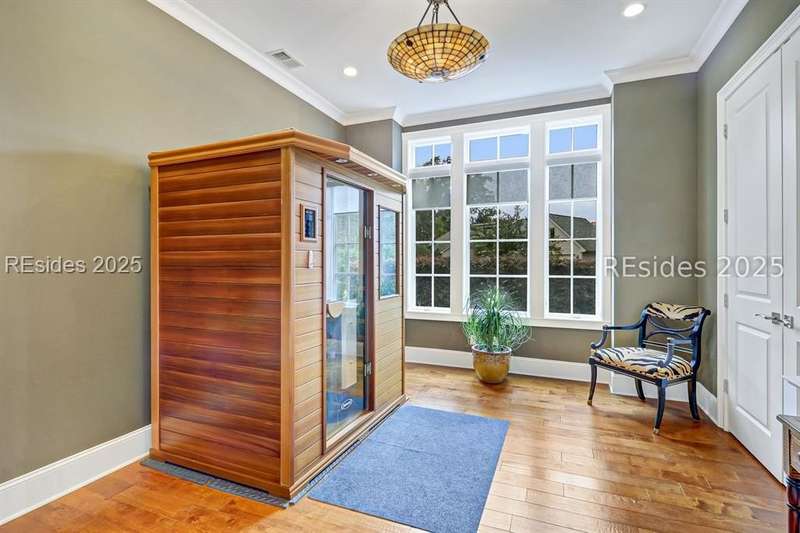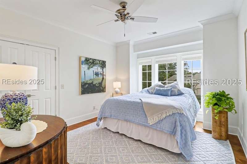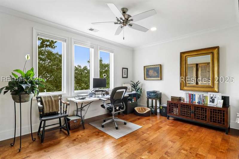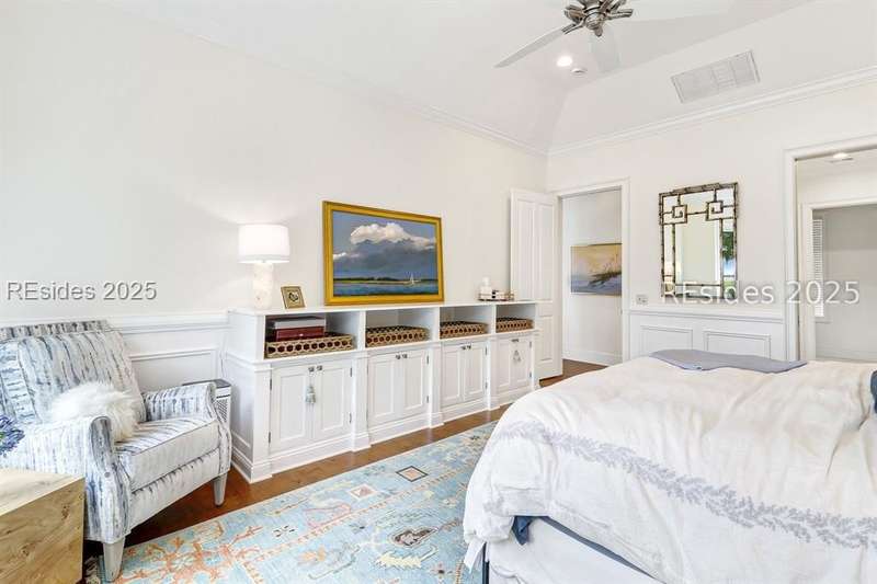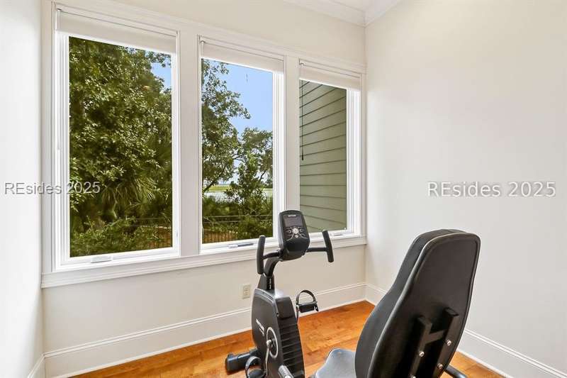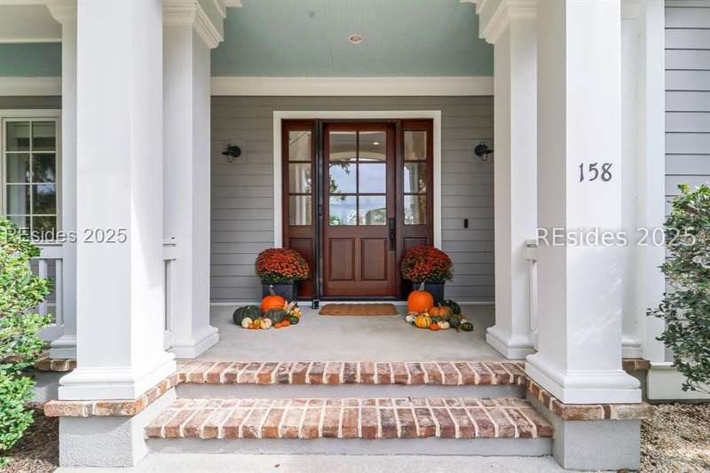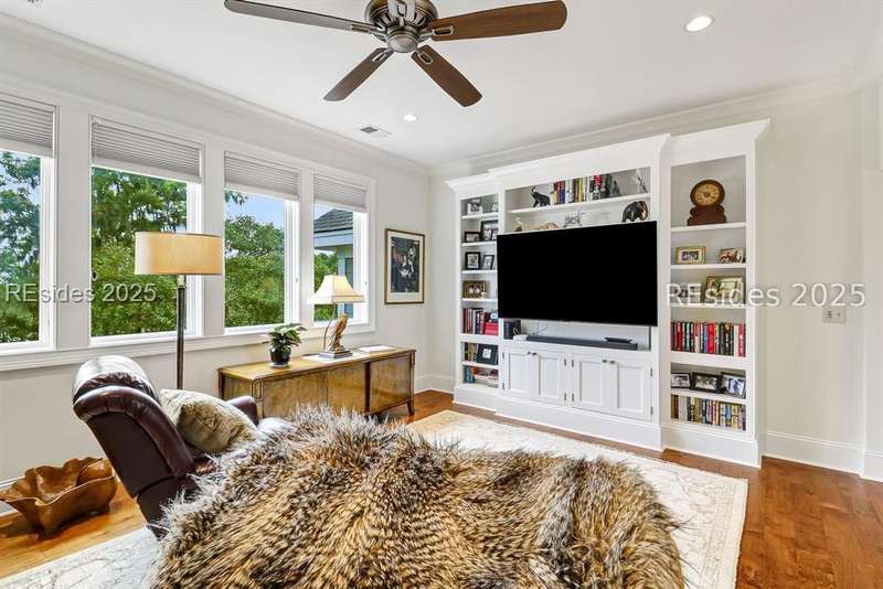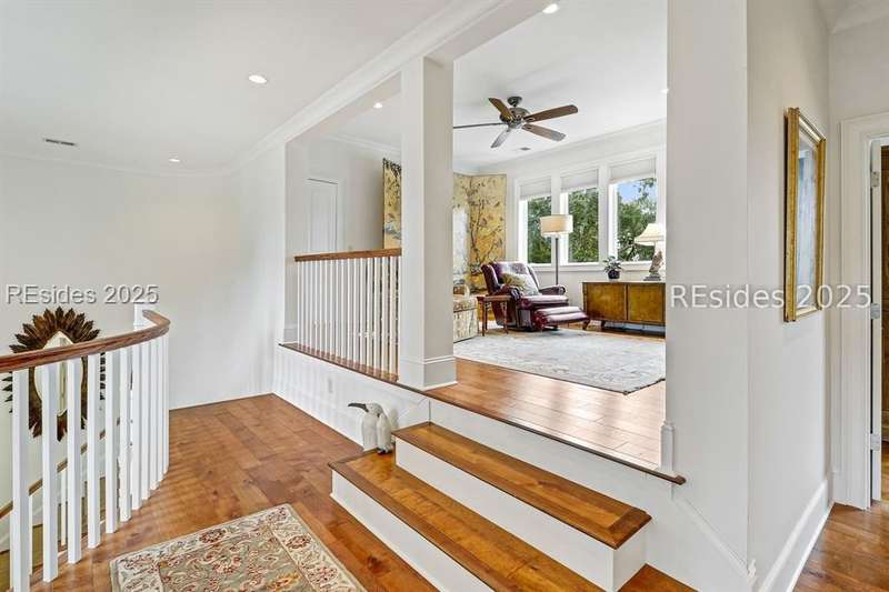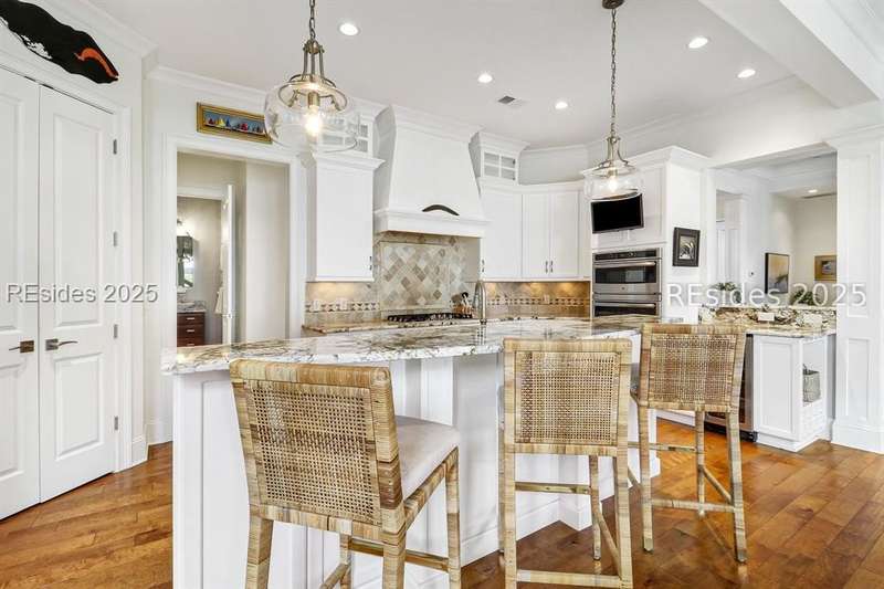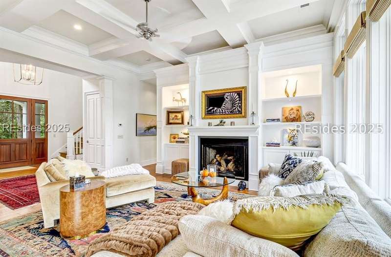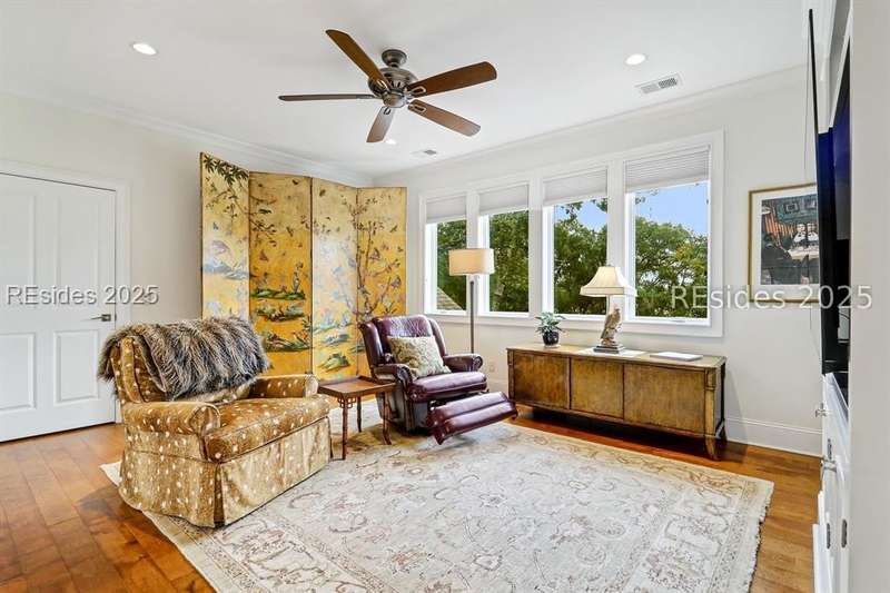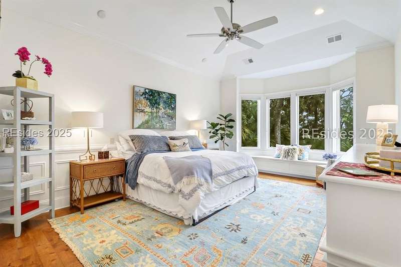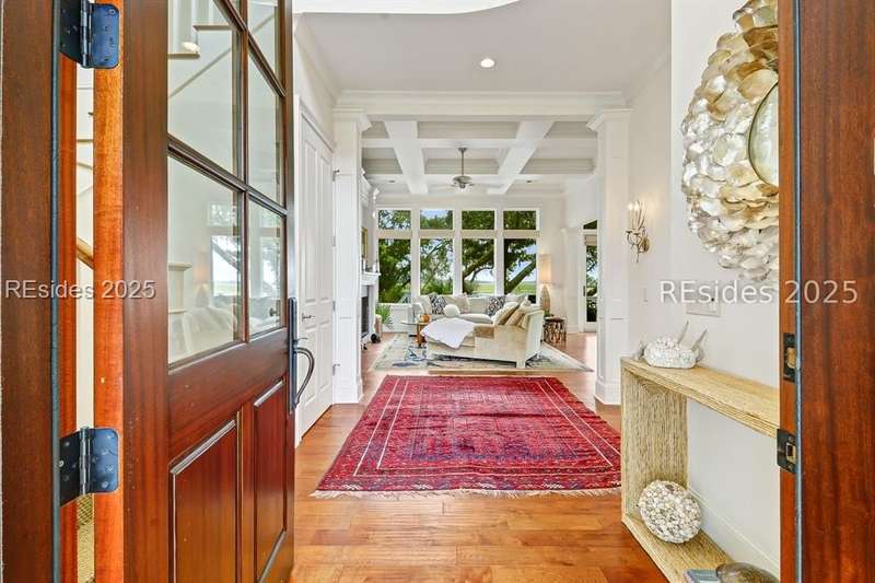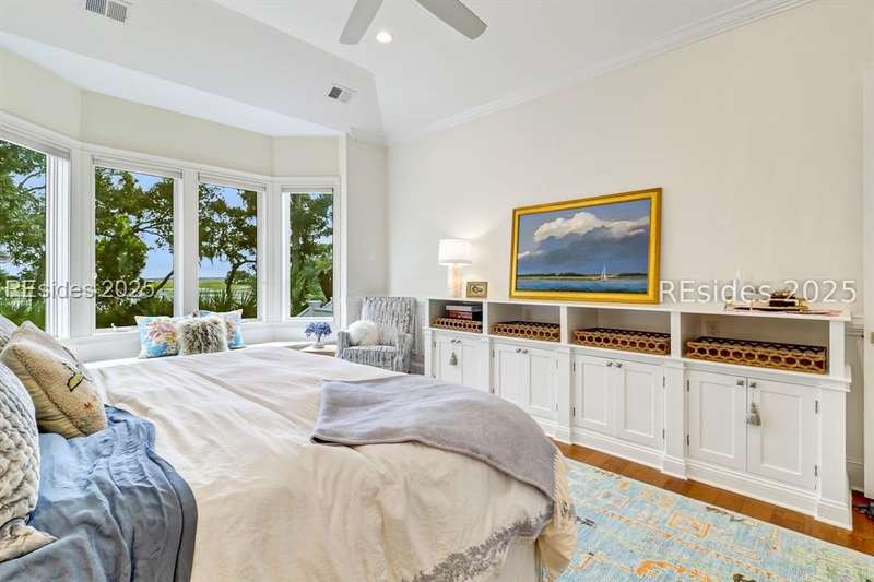RARE OPPORTUNITY! Experience miles of panoramic tidal marsh & deepwater views with this 2015 built residence by renowned custom home builder in private, amenity rich Moss Creek. Interior features/recent improvements include wood flooring, 10-20 vaulted/tray/coffered ceilings, 8 interior doors, millwork & extensive built-ins by master craftsmen, granite counters, designer curated fixtures/hardware/lighting/window treatments, 2 gas fireplaces, walls of windows (w/transom windows) to view, stainless steel appliance package, spray foam insulation, imressive storage space including walk-in attic, closets & garage w/extensive built-ins. Very livable floor plan offers island kitchen open to dining & great room, walk-in pantry, much desired screened porch, bonus/media rm, office/den (4th BR), powder rm, laundry/mud room, ample/well-appointed guest BR suites & expansive/private primary suite with updated 5 Star bath, large walk in closet + multi-purpose flex room. Exterior offers attractive/durable Hardie board siding, charming covered front porch, all new front yard & plantings, extensive rear decking & brick paver walkway, must have fenced dog run, low voltage path & uplighting, majestic live oaks & pebbled walkway to secluded marsh front firepit. All sited on high elevation, quiet/private, end of cul de sac lot with Blue Heron Sanctuary to front and preferred southeastern exposure to rear offering excellent natural light, picturesque sunrises, and stunning, shaded late afternoon/evenings great for relaxing and entertaining friends and family. This is the home you've been dreaming about...