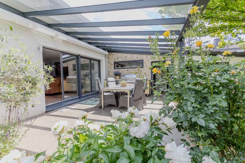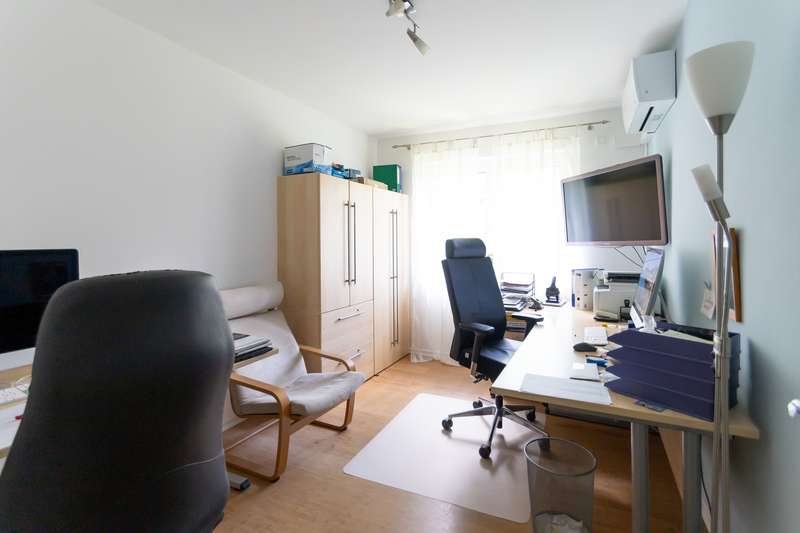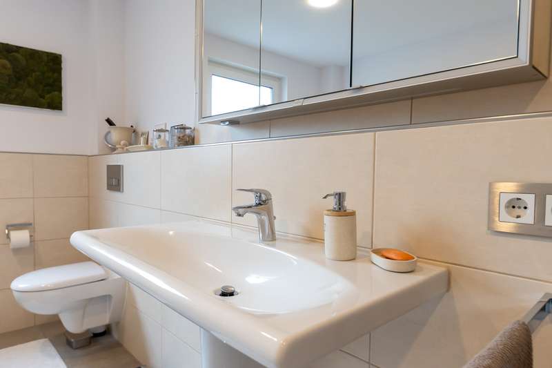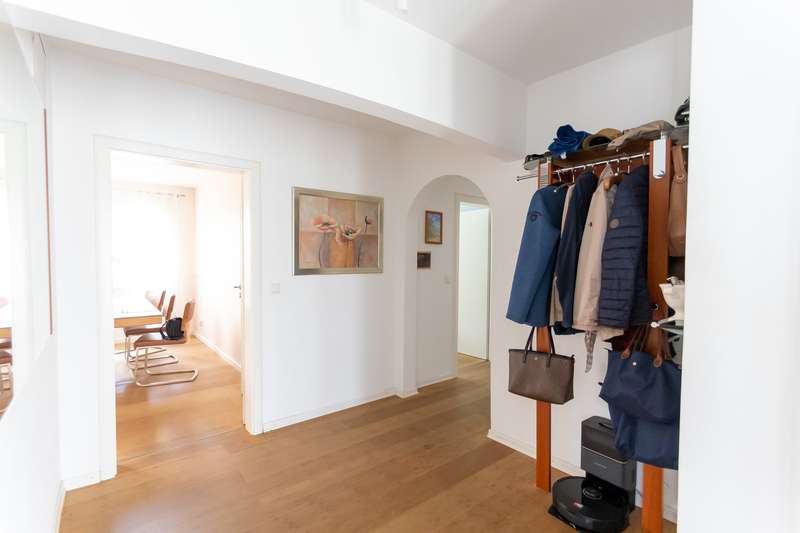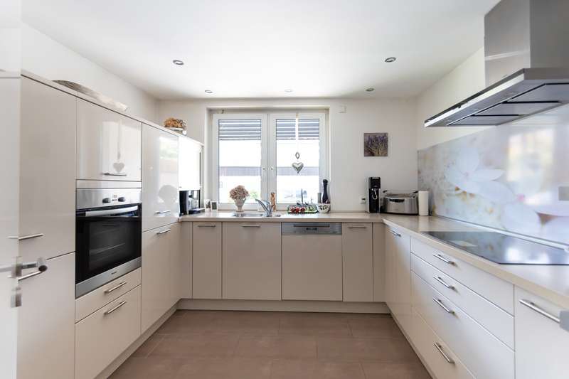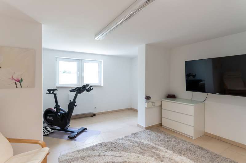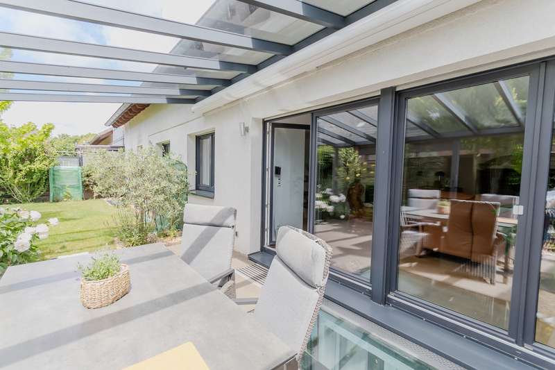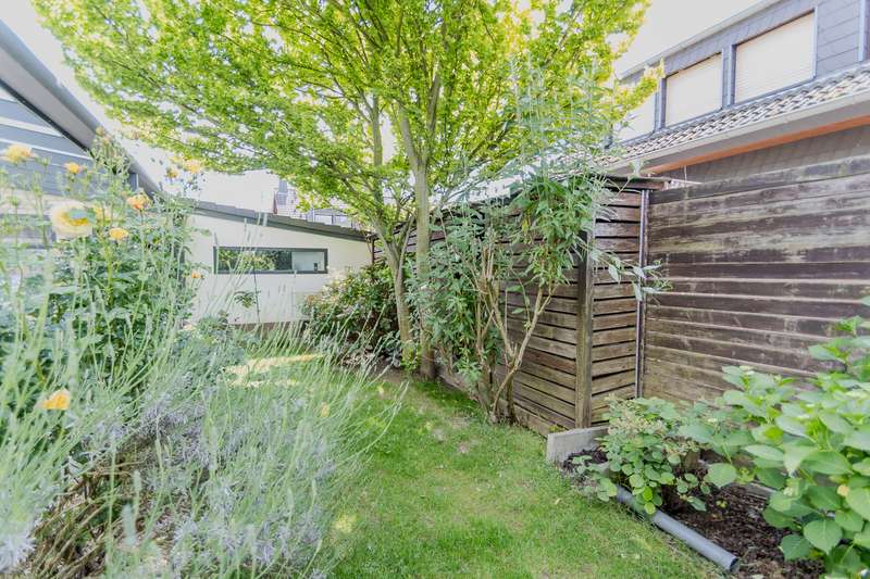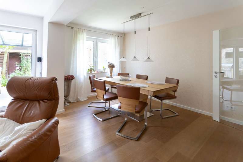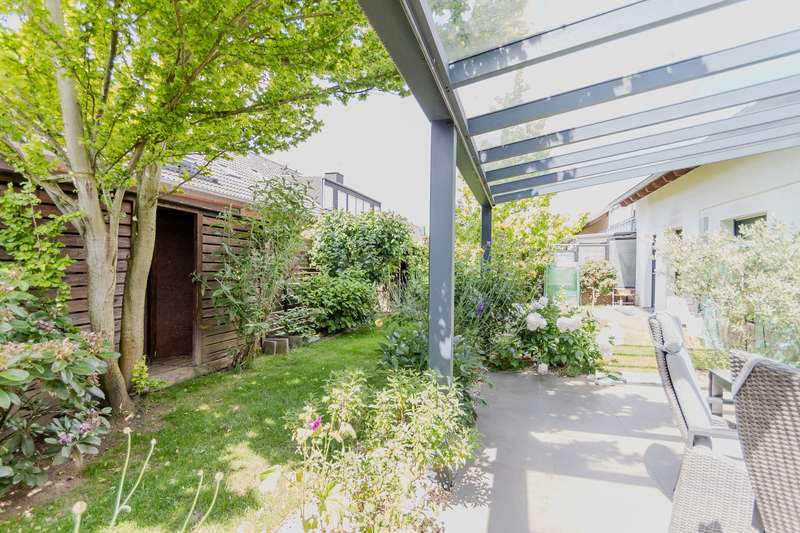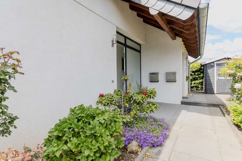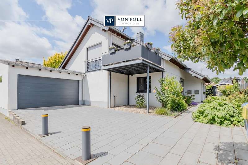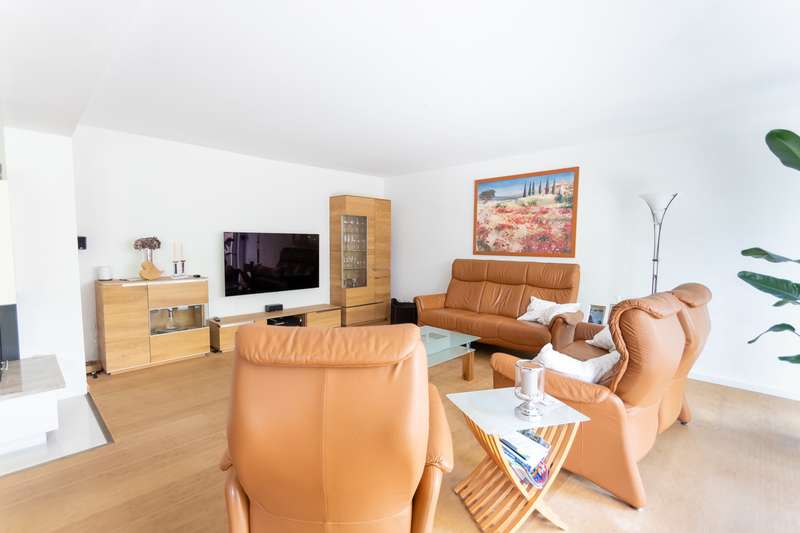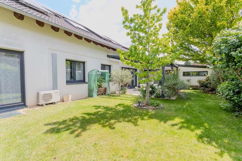 This high-quality detached house, built in 1970 and last completely renovated in 2013, offers ideal space for living and relaxing on a generous living area of approx. 182 m². The house-within-a-house is part of an overall property that is divided into two self-sufficient residential units in accordance with a condominium agreement, whereby each unit is accessed and maintained independently. The associated plot covers around 483 m² and offers an exclusive right of special use of the garden as well as the garage with adjoining workshop and additional parking spaces. There are a total of six rooms on the ground floor and basement, including four bedrooms, which offer a wide range of possible uses. Upon entering the house, visitors are greeted by a spacious entrance area with a checkroom and storage room. The bright living room is equipped with floor-to-ceiling windows that lead to the well-kept garden and has an inviting fireplace with a convection heating function. Adjacent is an open-plan dining room area and an exclusive, modern kitchen equipped with an induction hob, extractor hood and other high-quality brand appliances. There are two bathrooms, one of which is a spacious en-suite master bathroom with a bathtub and a large, barrier-free shower, while the other has a shower and WC. One of the children's bedrooms is located on the garden side and benefits from a beautiful view of the greenery. The basement offers two comfortable rooms with underfloor heating and windows that can be used as additional living or work spaces. There is also a laundry room, a storage cellar and a technical room containing the heating system, the PV system with storage and the network technology. The outdoor area impresses with a fully enclosed and bright garden that invites you to relax. The terrace is equipped with a high-quality roof and has internal shading. There are also firewood shelters to store the wood for the fireplace in the living room. There is a spacious double garage with an electric sectional door for vehicles. In the adjoining workshop area, which is also equipped with a sectional door, there are fresh water and waste water connections that open up further possibilities for use. This house-within-a-house concept is characterized by upscale fittings and the combination of modern building technology, which ensures a pleasant living environment. It is ideal for families looking for a spacious and functional home. A viewing on site will show you the full potential of this property.