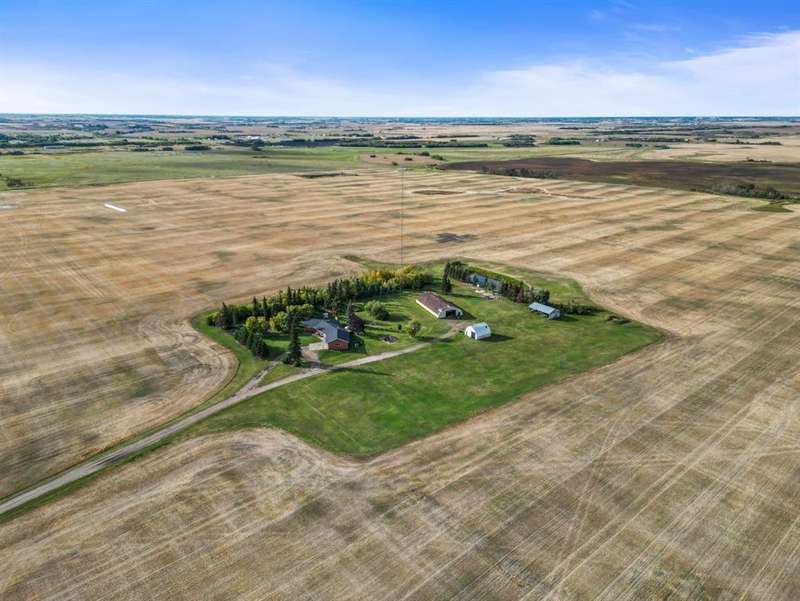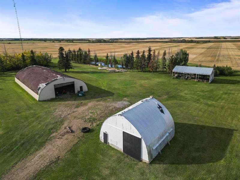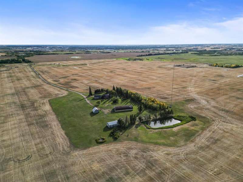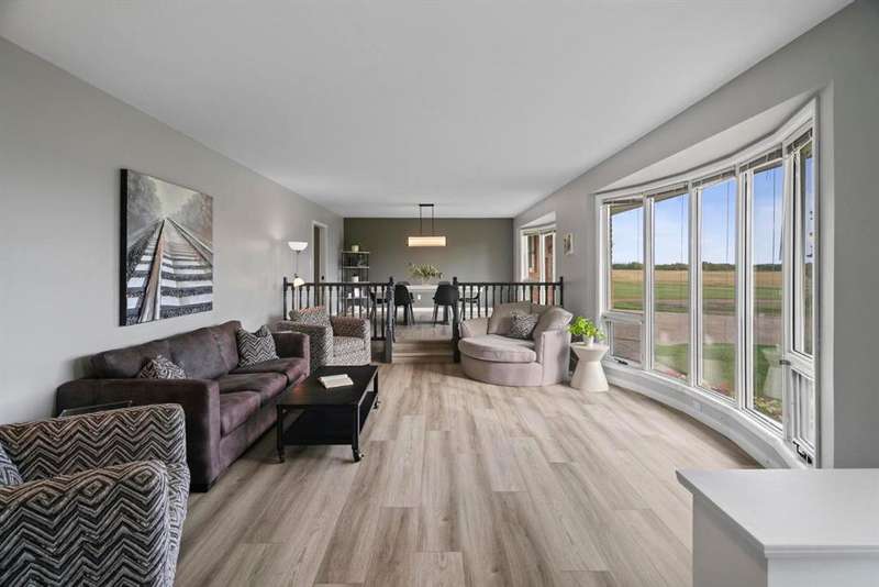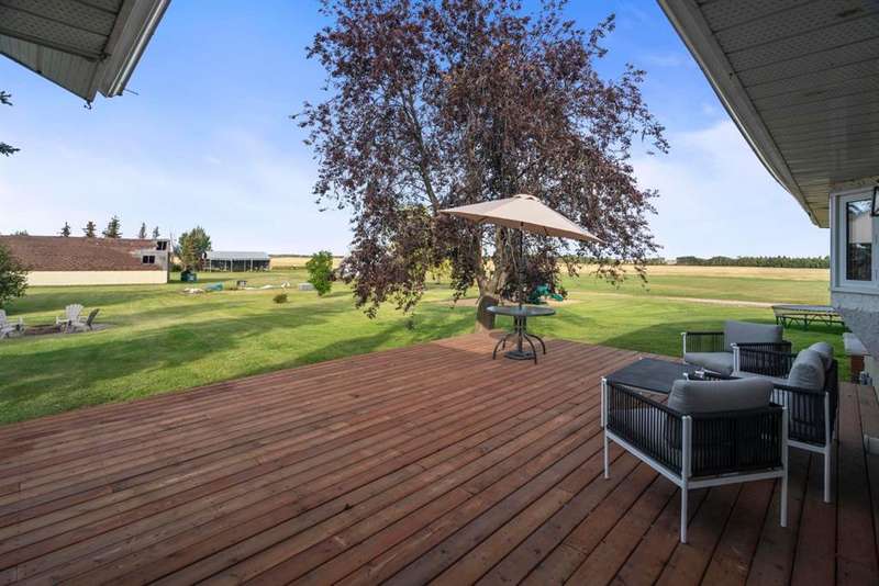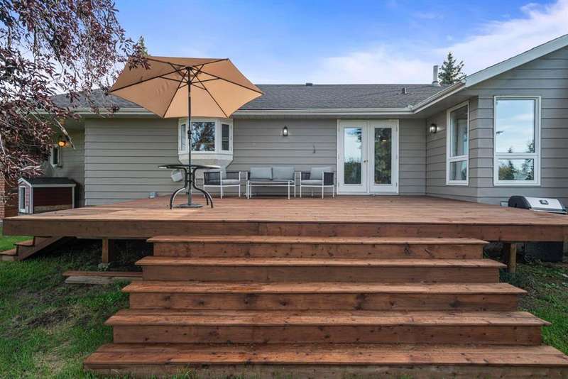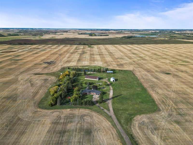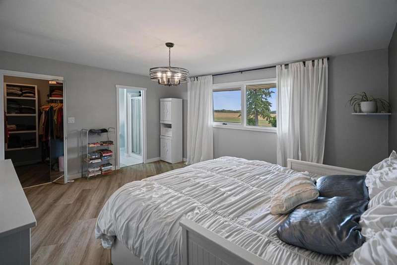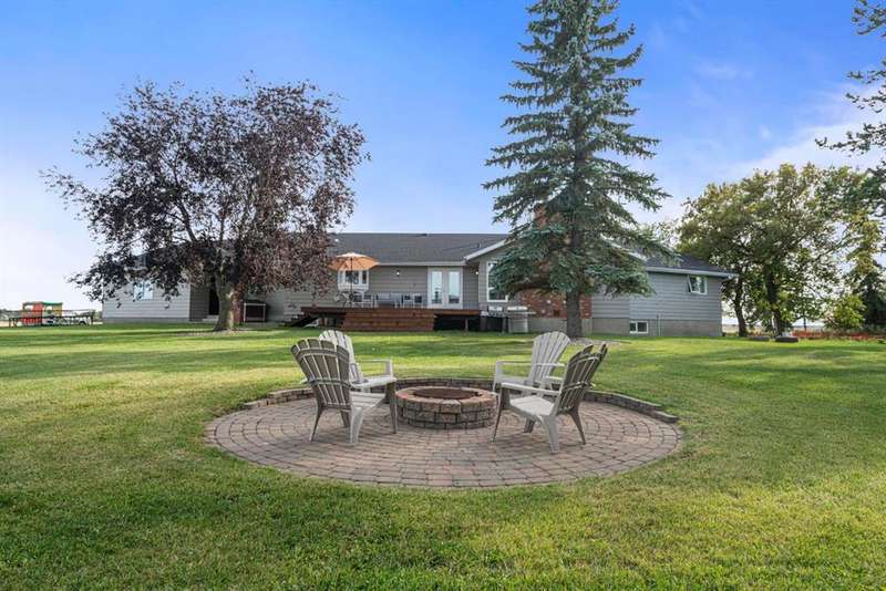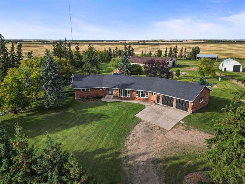 Looking for an acreage only minutes out of town? Here it is! This stunning large bungalow with just over 13 acres of land may be just the property you've been waiting for. From the moment you enter this truly remarkable home you'll notice the bright and spacious floor plan that flows from front to back. The main floor boasts a nice front living room, excellent kitchen/dining space, a formal dining room, 3 bedrooms, main floor laundry room and another rear family room with a beautiful brick fireplace. The primary bedroom has a walk-in closet and 3pc ensuite. The lower level is fully finished and includes a wide-open family and entertainment room, wet bar with fridge and stove, Stunning fireplace with custom cabinetry built-ins, flex room, office space, three more bedrooms, 3pc bathroom with custom tiled shower, an excellent storage space and in-floor heating. Outside is an oasis with rear back deck, wonderful large garden, a quonset that needs work but could make a very usable space and lots of trees, making this acreage truly a must see. Acreages of this size, quality and location to town don't come on the market that often. A one-of-a-kind property at a remarkable price!