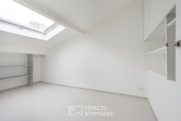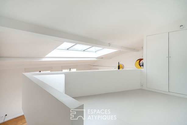 In the heart of the village of Faidherbe-Chaligny, at the end of a quiet, paved and planted courtyard, this 132m2 loft (111m2 Carrez) is located on the top floor of a 19th century building.