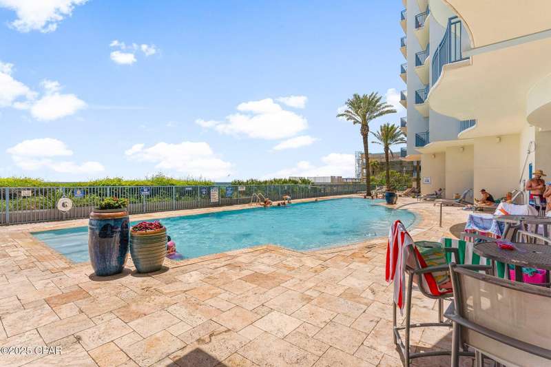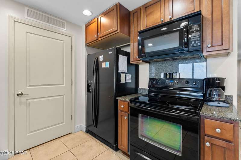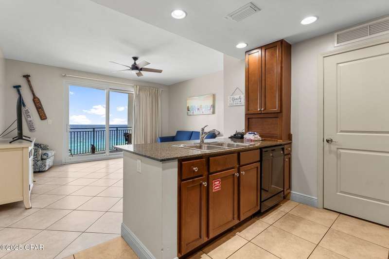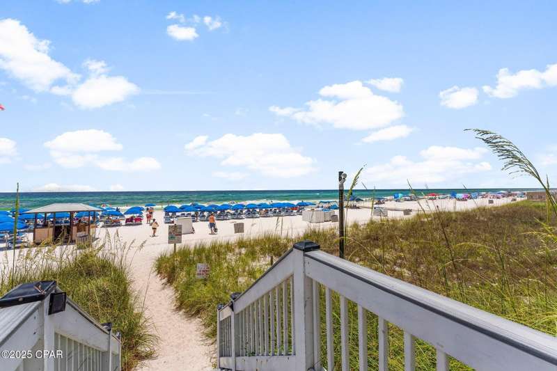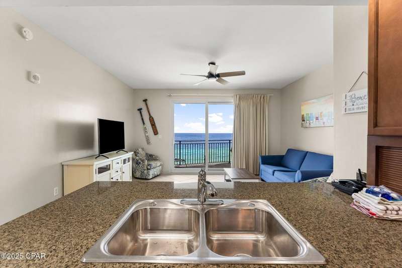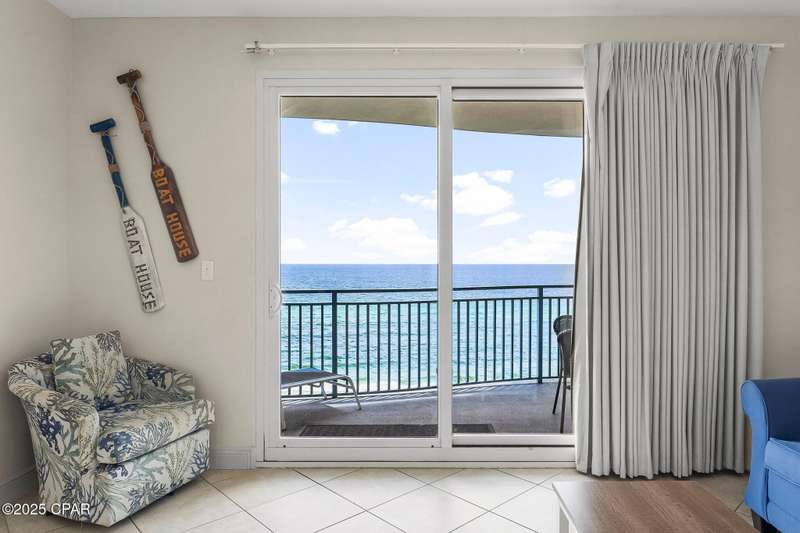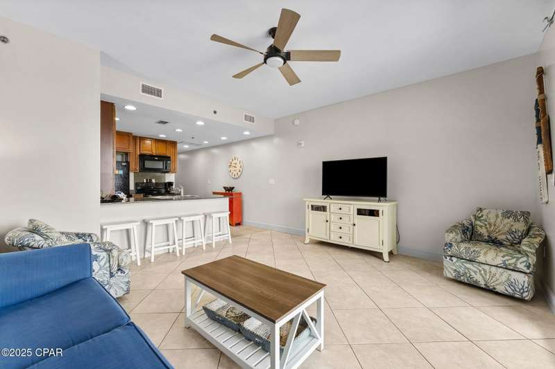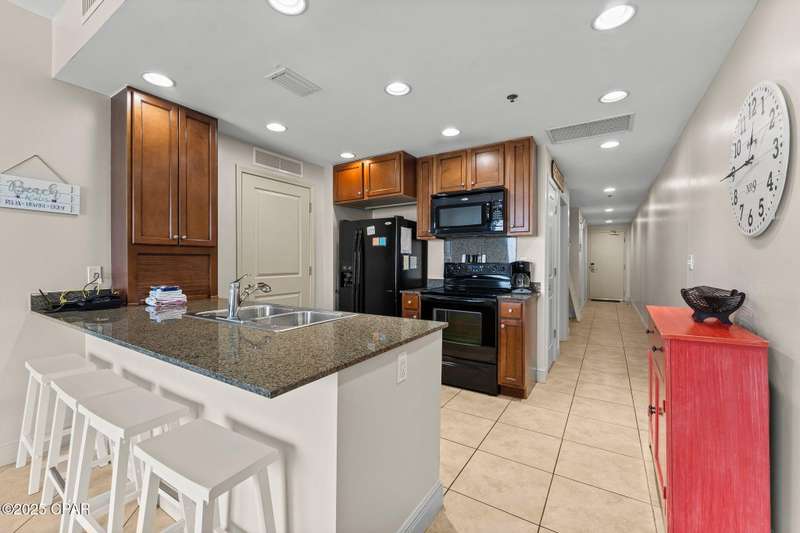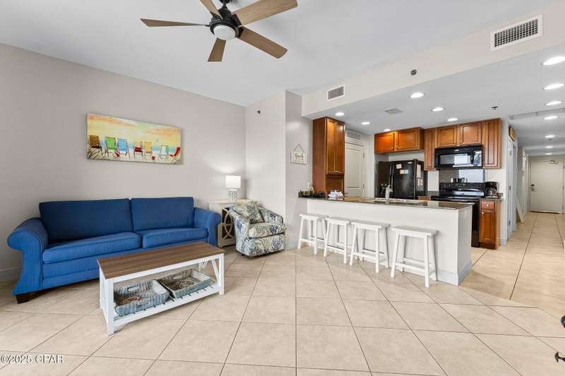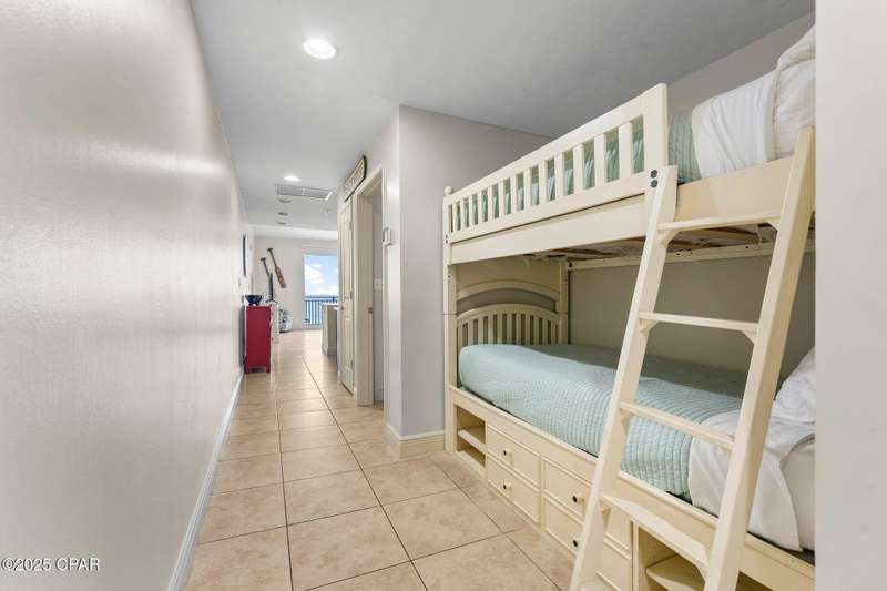 Step inside to a bright, welcoming tiled entryway where coastal charm meets comfort. Just off the entrance, you'll find the first bedroom with soft hues and thoughtful touches, setting the tone for your beachside escape. Tucked neatly into the hallway, the built-in bunk alcove offers a fun and functional space for little ones or extra guests. With cozy bedding and clever design, it's the perfect blend of charm and convenience--making the most of every square foot. The open-concept kitchen flows seamlessly into the living area, creating a light and airy space that's perfect for entertaining or relaxing with family. While prepping meals or mixing drinks, you'll still be part of the conversation--enjoying views of the Gulf and the natural sunlight that fills the room. The stylish and functional kitchen features rich wood cabinetry, sleek black appliances with an electric stove, and durable granite countertops--offering both beauty and practicality. The living room exudes relaxed coastal charm with soft, Gulf-inspired hues, light tones, and breezy textures. Nautical accents, cozy furnishings, and coastal decor create a welcoming space that captures the easy life of beachfront living. You'll love that the entire condo is tiled and there's no carpet to maintain! In the living room it has comfortable, beach-friendly furniture that invites you to relax and unwind while the open layout makes it easy to gather with family or entertain friends. New HVAC December 2022, New Washer and Dryer, New flooring in the Primary Bedroom in 2023, and New paint and decor in 2022. Sterling Breeze offers a variety of amenities onsite including a Gift Shop, Gym with the workout views of the Gulf, Outdoor showers to washing off the sand, Beachside pool (heated in the winter), and Hot Tub! Located near Pier Park Shopping, Frank Brown Park, Local Dining, and the new Pirates Voyage Dinner Show and Top Golf.
