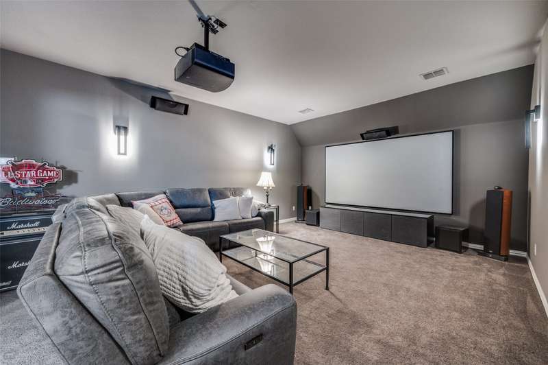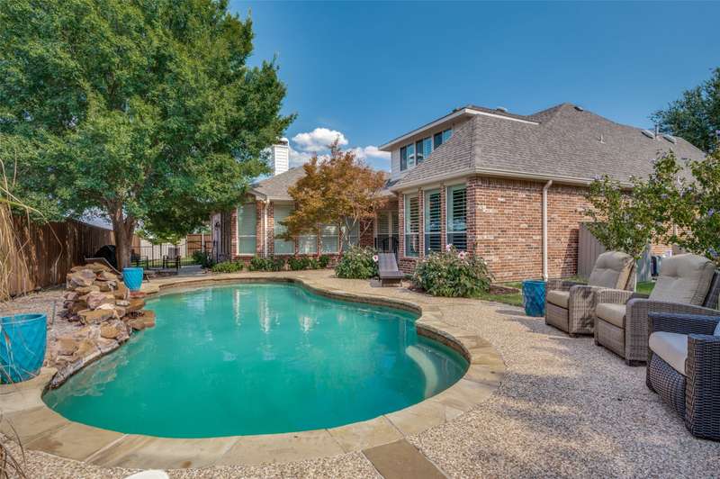 Gorgeous David Weekley home situated on nearly half an acre in the highly sought-after Willow Ridge community in Prosper! This stunning 1.5 story home offers a bright, open-concept layout with exceptional space for both everyday living and entertaining. The chefs kitchen features solid surface countertops, an oversized island with seating, stainless steel appliances, abundant cabinetry, built-in desk area, and a sunny breakfast nook. A spacious family room flows seamlessly from the kitchen and boasts a fireplace with gas logs and door, while a formal dining room, living room, and private study with French doors add versatility. Plantation shutters are found throughout the home, complemented by upgraded lighting fixtures from Lee Lighting. All bedrooms are located on the main level, including a private primary suite with a wall of windows, a large walk-in closet, dual sinks, separate shower, and soaking tub. There are three guest bedrooms and the secondary bathrooms have also been tastefully upgraded. Upstairs youll find a generous game room, dedicated media room, and convenient half bathperfect for entertaining or relaxing. Step outside to your backyard oasis featuring a sparkling pool, extended patio with pergola, lush upgraded landscaping, and expansive grass space ideal for play or outdoor gatherings. The newly added sliding back door opens beautifully to this space. Additional highlights include two foam-insulated garage doors installed in 2023, a three-car garage, a fence extension and automatic driveway gate that provide added privacy and a cul-de-sac lot. Enjoy private gated access to the community sports field located just beyond the backyard. Located in the prestigious Willow Ridge neighborhood, residents enjoy a host of amenities including a resort-style pool, playground, fishing ponds, walking trails, and scenic greenbelts. Prosper ISD schools and no MUD or PID make this an exceptional opportunity. This is the one youve been waiting for!