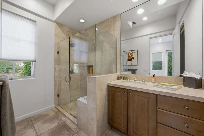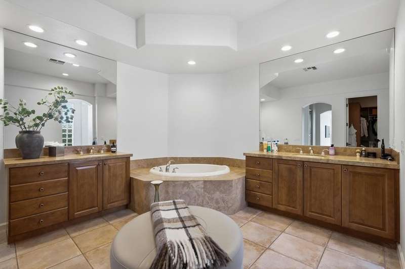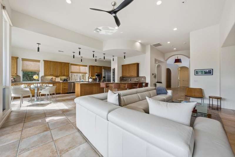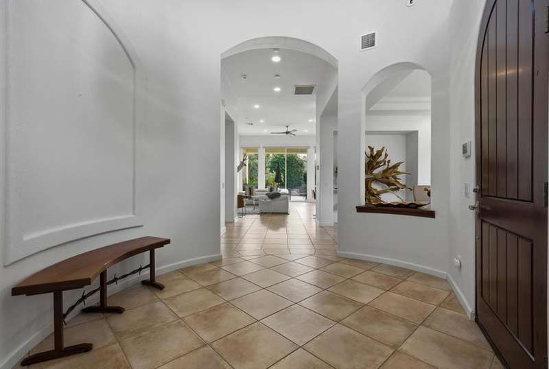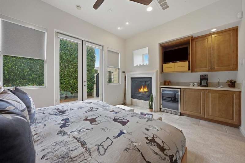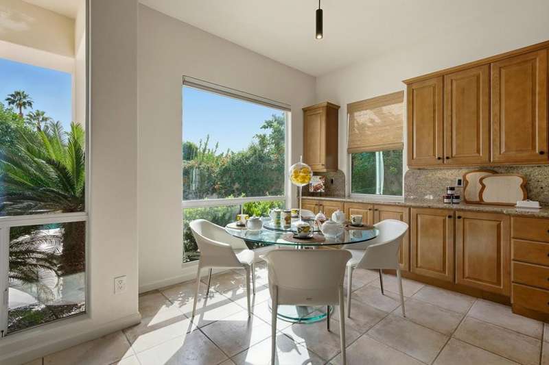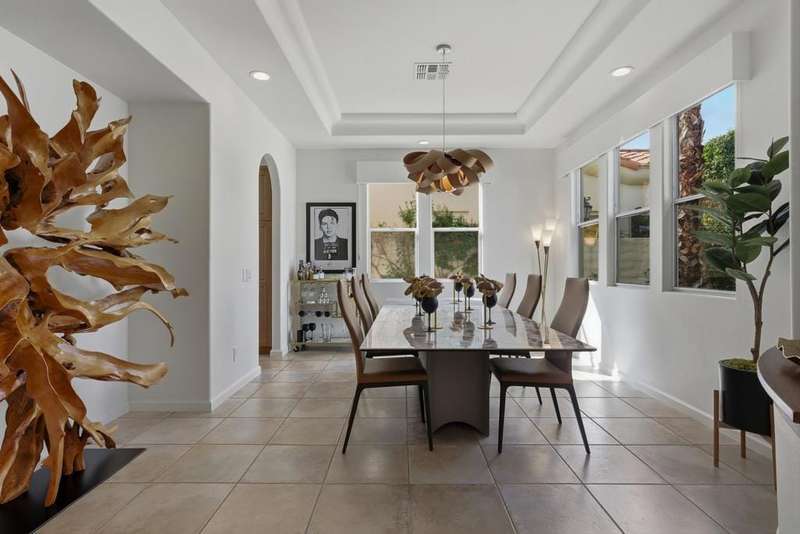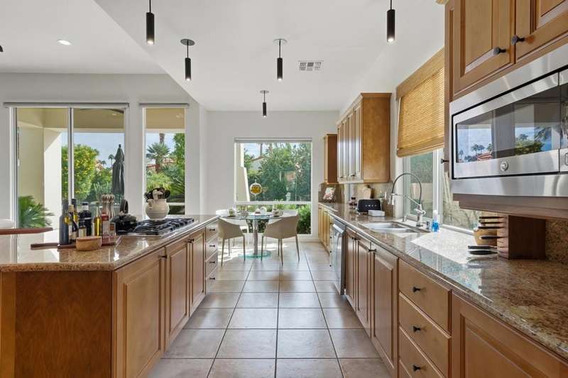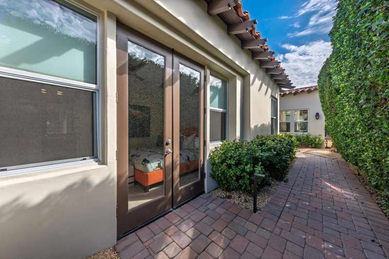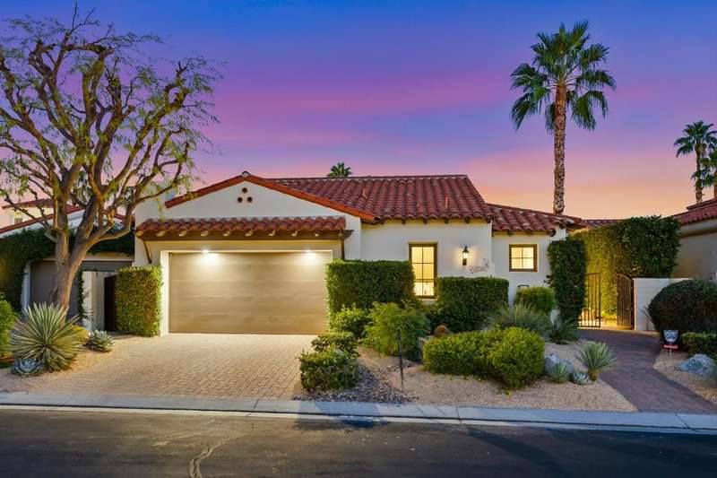 Fabulous gated location within the heart of La Quinta awaits you with this house! Open the gate and meander down the walkway to the beautiful arched entry. Foyer with soaring ceiling greets you. Formal Dining room is perfect for family or friends special events. Great Room flows into gourmet kitchen with circular granite counter, dry bar, and breakfast bar seating area. Wonderful area for entertaining! Casual dining area opens to the beautiful pool, spa area with mountain views plus delicious fruit trees. The Primary bedroom suite offers a large spa-like bathroom with walk-in shower, soaking tub and two separate vanities. A large walk-in closet adds to this retreat. Private attached Casita has a fireplace, coffee bar area and bathroom . Guest suite with bathroom is ideal for visitors. Efficiently designed 'work at home' space with built in desks and shelves is located in a quiet area of the house. Ideal for working away from the office. Laundry room with storage space makes this a perfect primary house or winter retreat.Two car garage, two new HVAC units, exterior trim painted and new electrical panel awaits the new owner! Do not miss the opportunity to own this pristine house that is being sold FURNISHED with few exclusions.