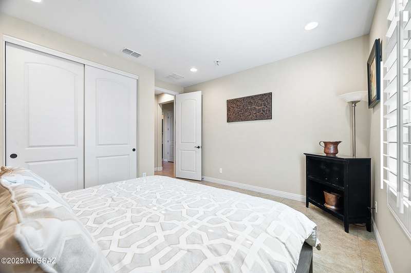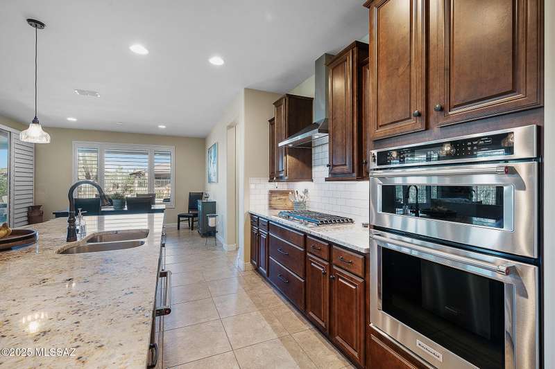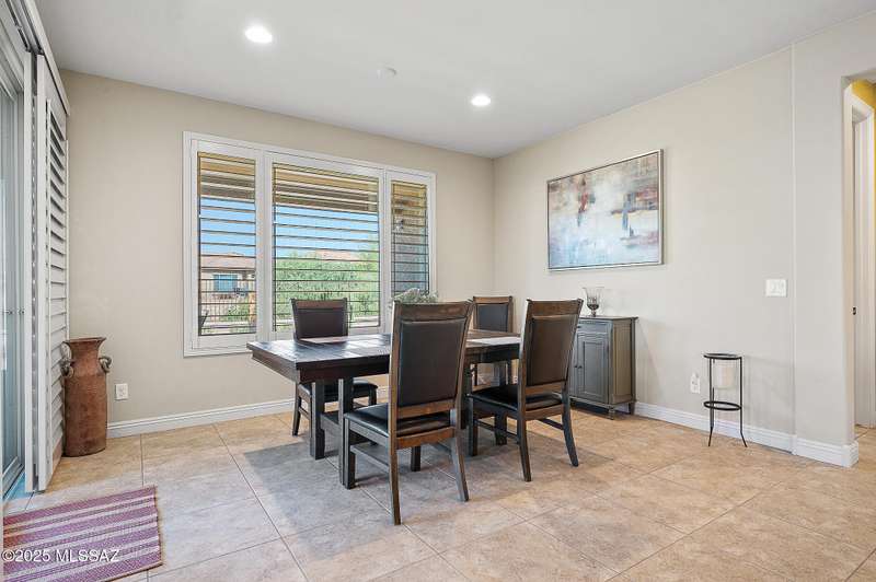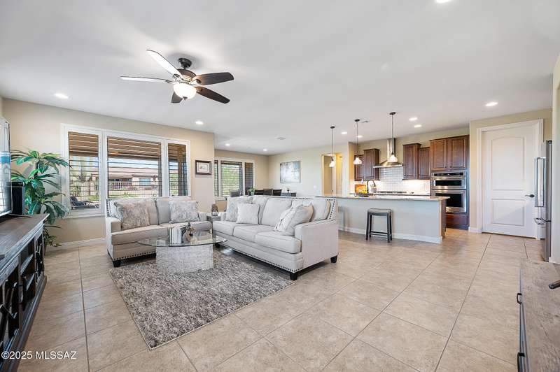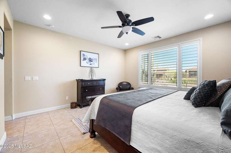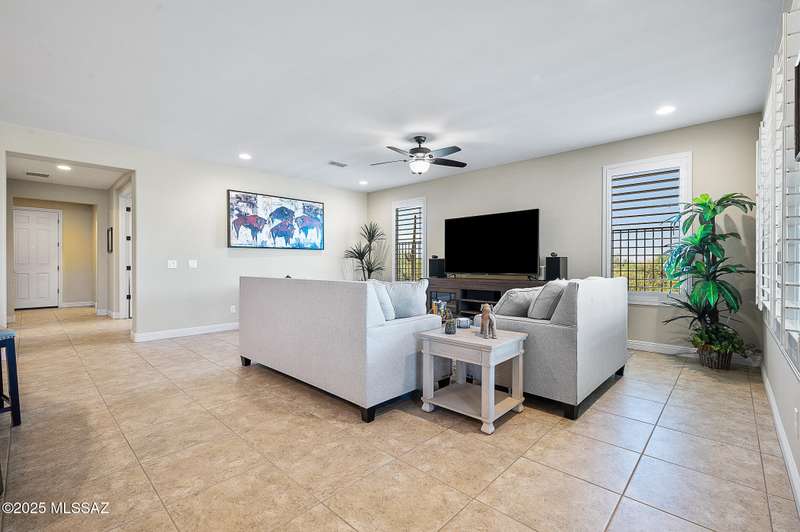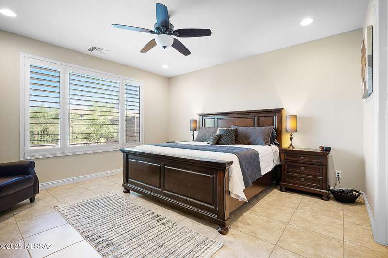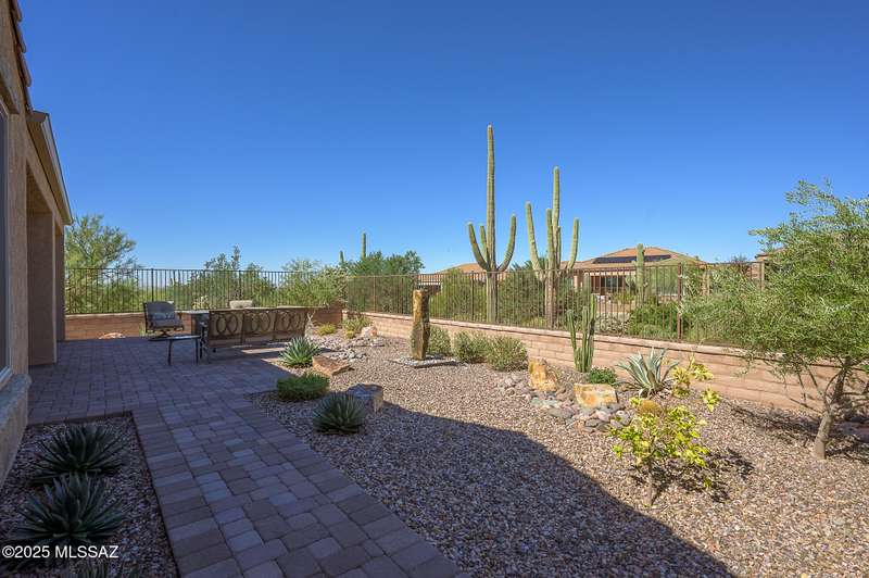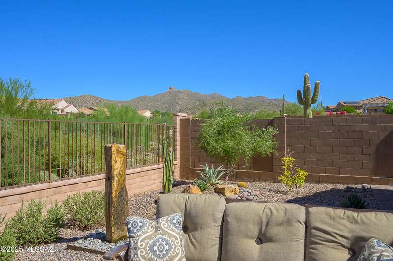 Impeccable, upgraded 2BR/2BA/Den Preserve model with 2010sf, boasting numerous highlights: Ceramic tile throughout (no carpet), upgraded 8'doors, French doors to den, full cabinets in laundry room, soft close drawers, custom Desert Wind wood shutters throughout, water softener in garage and much more! Back yard with pavers and beautiful fountain, backs to natural desert behind, with wrought iron fencing and mountain views. Privacy of corner lot, no homes on left with convenience of desert walking path to clubhouse. A definite must see in this neighborhood!