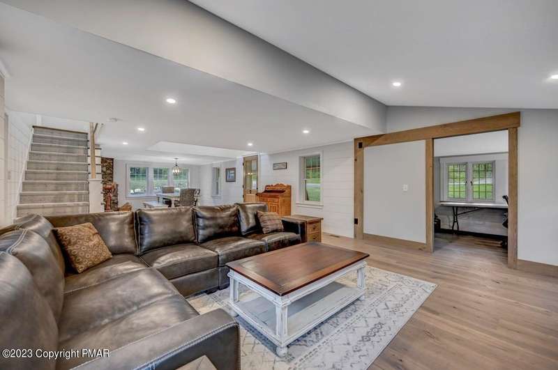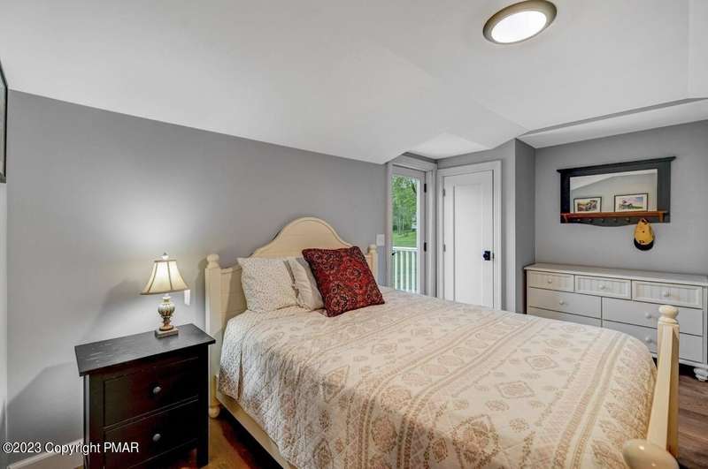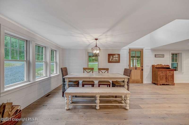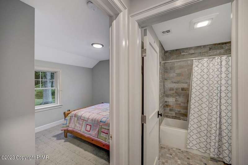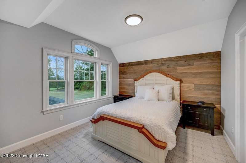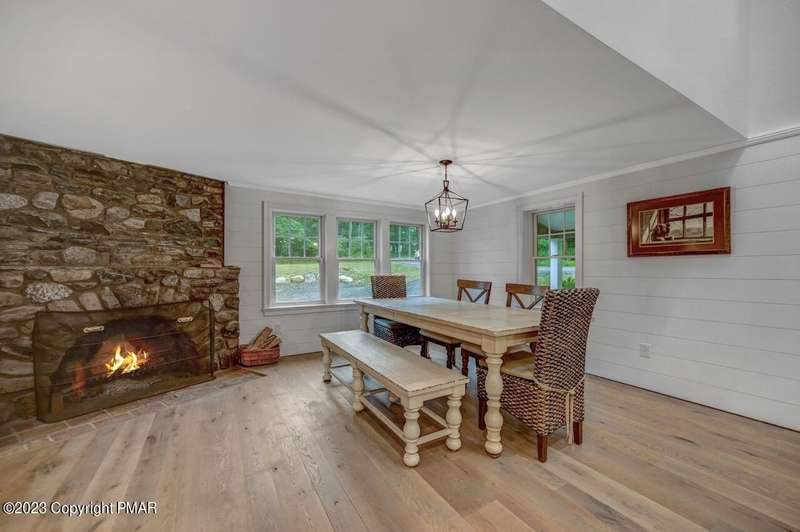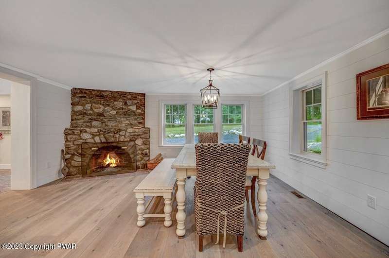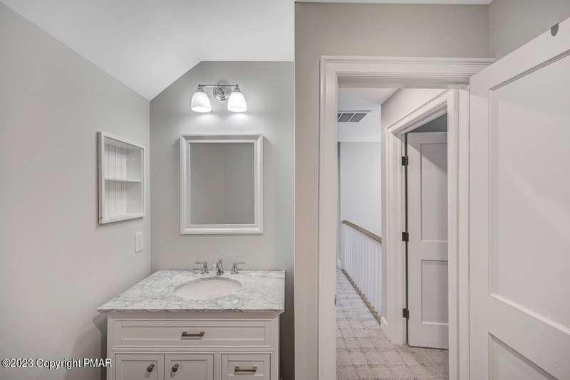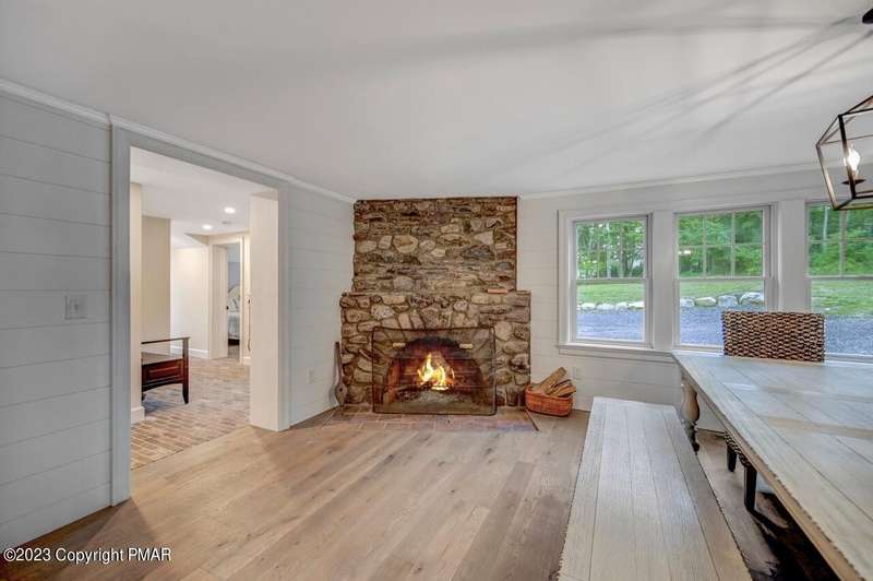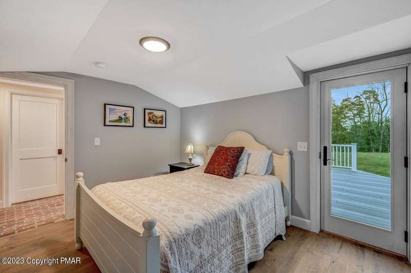 Gorgeous fully renovated farmhouse on over one acre fronting the beautiful Buck Hill Falls golf course. The main level features an open concept living and dining room with wood-burning stone fireplace, home office, and gourmet kitchen with massive island, custom cabinetry and quartz countertops. There is also a huge deck off the kitchen with golf course views and a first floor bedroom w/full bath. The 2nd floor features a primary bedroom w/ensuite bath plus 2 more bedrooms and new hall bath. There is plenty of parking, a large storage shed and huge yard. All this in historic Buck Hill Falls with world-class amenities including 27 holes golf, 10 har-tru tennis courts, Olympic-sized pool, 4,500 private acres with miles of hiking trails, streams and waterfalls. Only 2 hours from NYC and Philly. Must see!