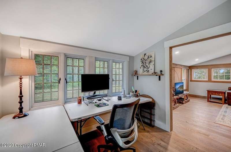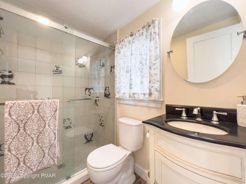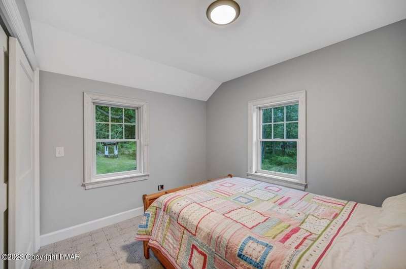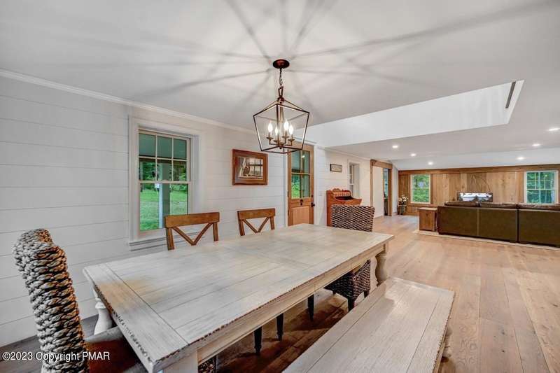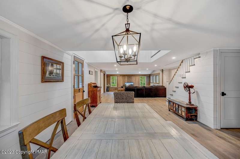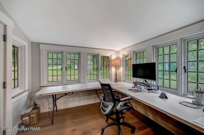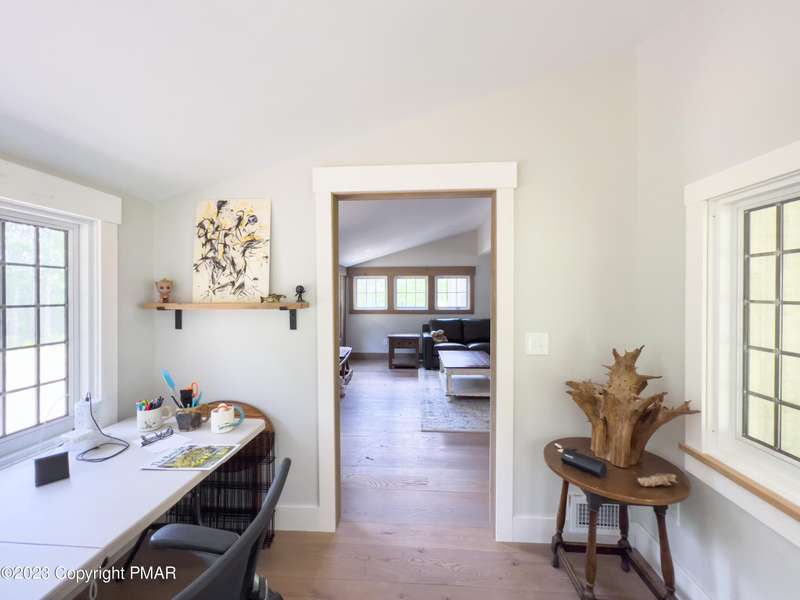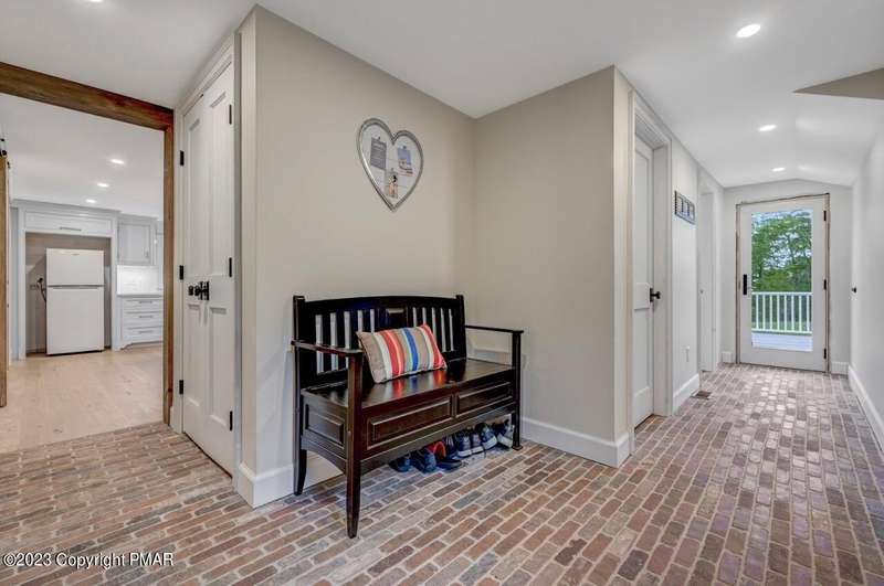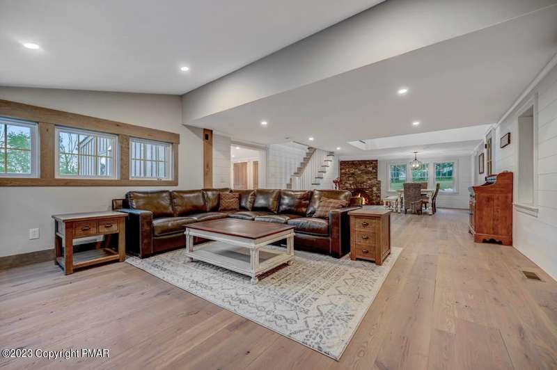 Gorgeous fully renovated farmhouse on over one acre fronting the beautiful Buck Hill Falls golf course. The main level features an open concept living and dining room with wood-burning stone fireplace, home office, and gourmet kitchen with massive island, custom cabinetry and quartz countertops. There is also a huge deck off the kitchen with golf course views and a first floor bedroom w/full bath. The 2nd floor features a primary bedroom w/ensuite bath plus 2 more bedrooms and new hall bath. There is plenty of parking, a large storage shed and huge yard. All this in historic Buck Hill Falls with world-class amenities including 27 holes golf, 10 har-tru tennis courts, Olympic-sized pool, 4,500 private acres with miles of hiking trails, streams and waterfalls. Only 2 hours from NYC and Philly. Must see!