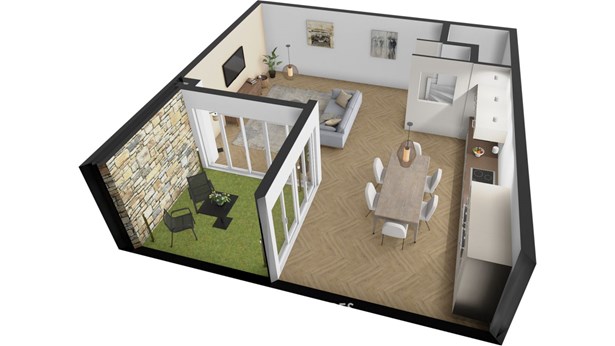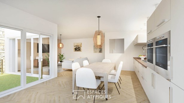 The entrance reveals a vast 53 sqm living space, designed to accommodate an open kitchen and a convivial living room extended by a patio.