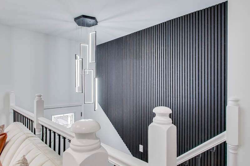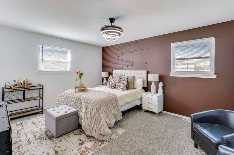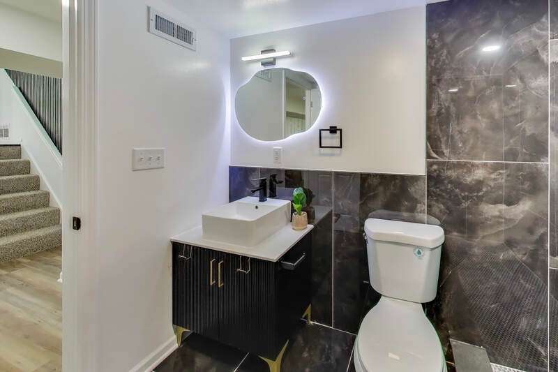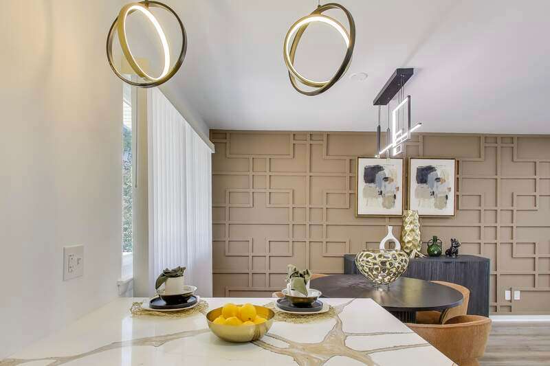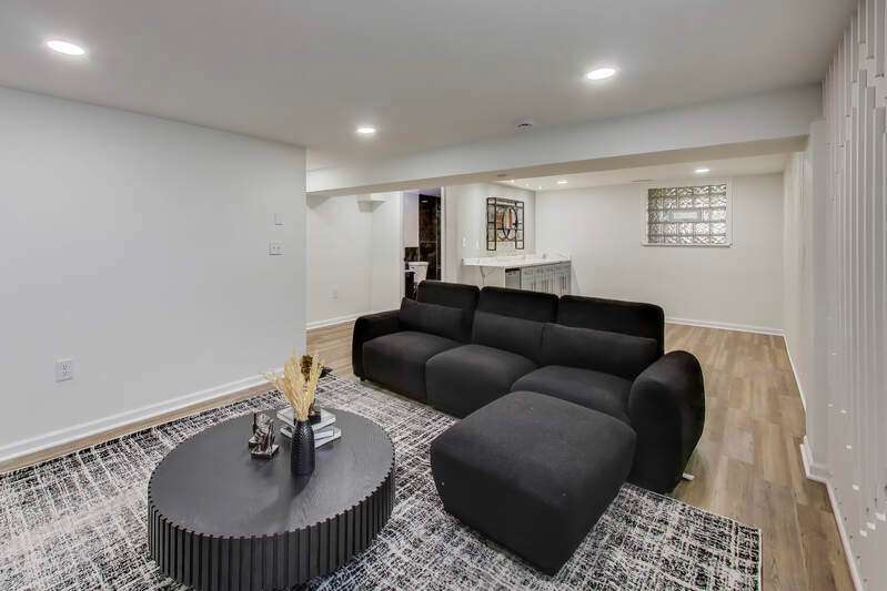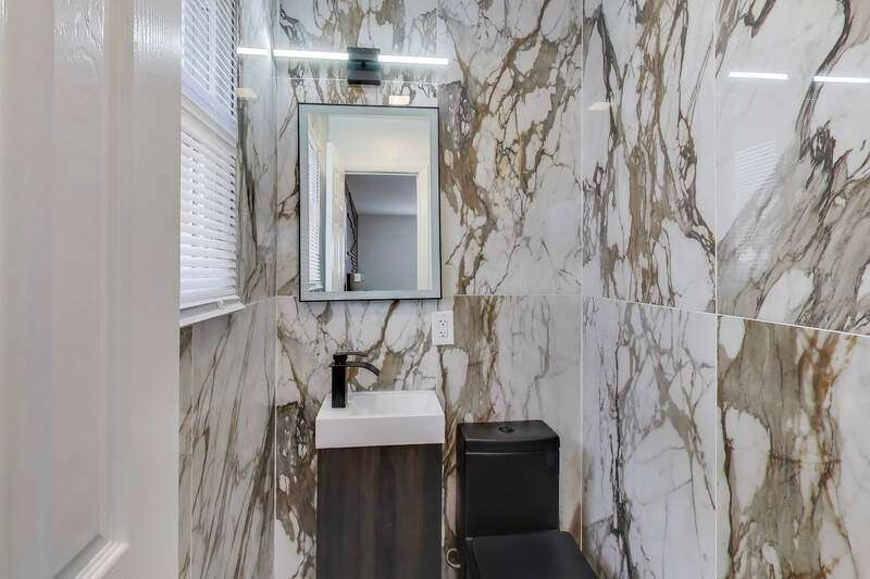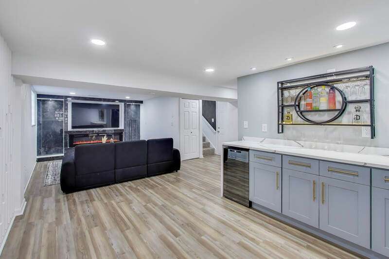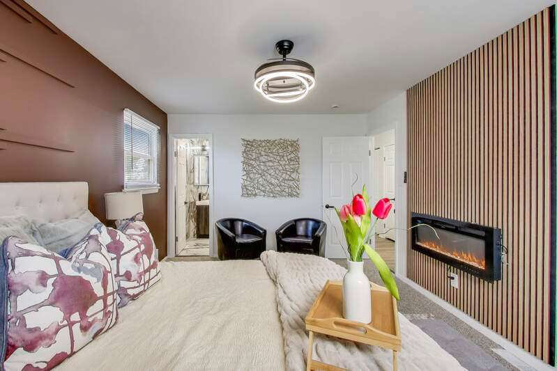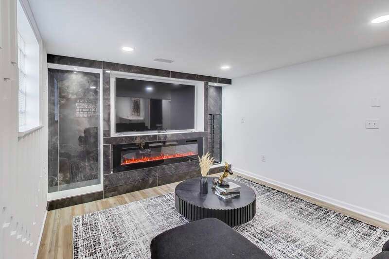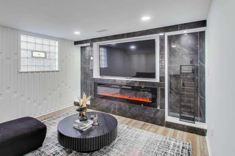 Prepare to be captivated by this elegantly reimagined 3-bedroom, 3-bath luxury home, where sophistication meets modern comfort. Step through the grand foyer featuring soaring ceilings, rich wood panel detailing, and a radiant LED chandelier that sets the tone for the artistry within. The open-concept main level flows effortlessly from the expansive living room--anchored by a custom entertainment wall with designer tile, built-in lighting, and an electric fireplace--to the formal dining area and chef's kitchen. The kitchen stuns with dual-tone cabinetry, Calcutta gold quartz countertops, a chef's island, pendant lighting, and a premium stainless steel appliance suite. Each spa-inspired bath is crafted with floor-to-ceiling porcelain tile, custom vanities, and LED mirrors with touch defogging technology. The primary suite is a serene retreat with a lavish en suite bath, while each bedroom offers plush carpeting, 3D accent walls, LED ceiling fans, and natural light. The lower level features a designer bar with quartz counters, illuminated wine rack, black porcelain media wall, and a luxury walk-in shower with a 52-setting shower tower--a true entertainer's dream. Outside, enjoy a restored deck and private backyard oasis, plus a 2.5-car attached garage with laundry area.